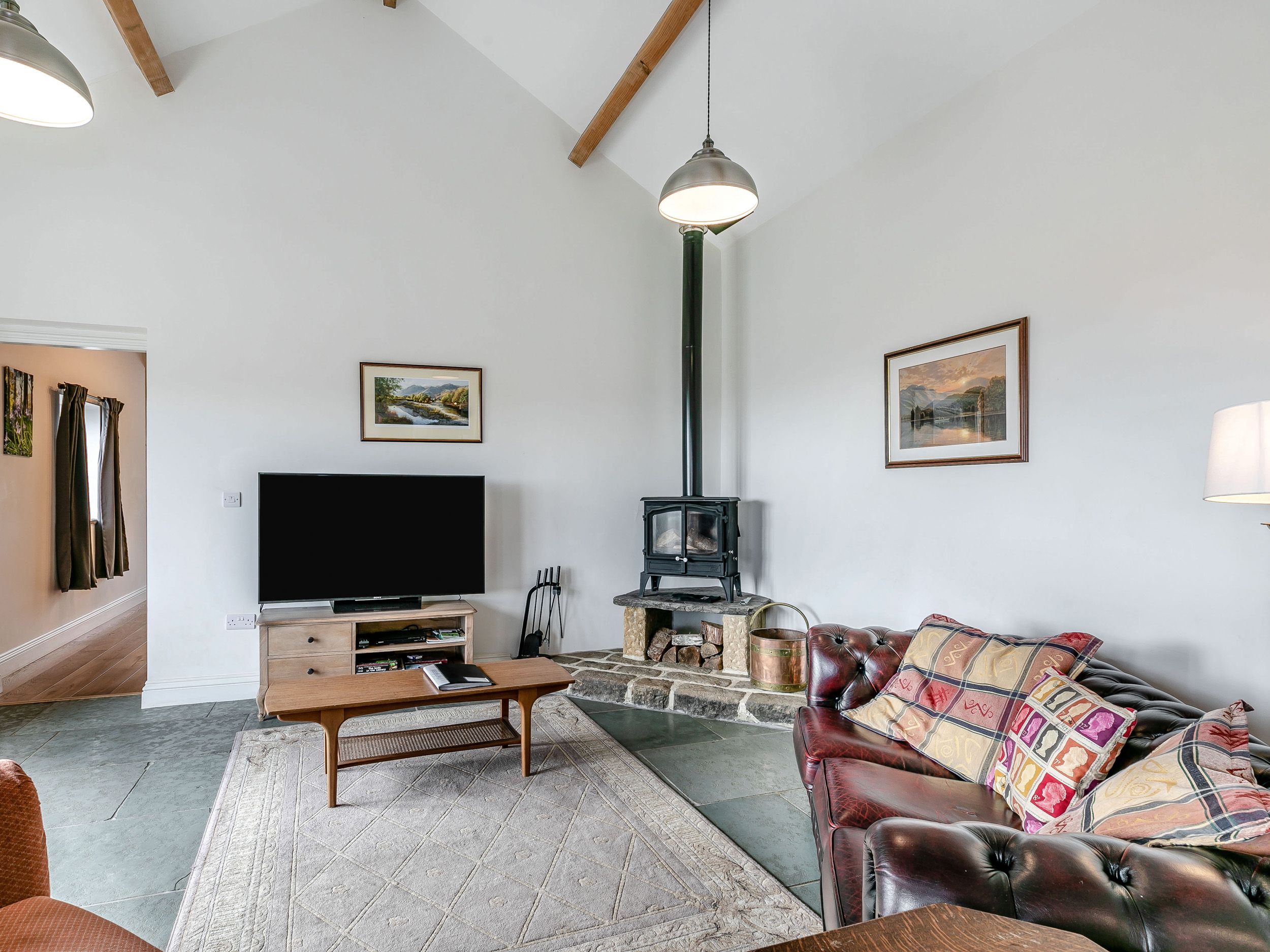 Amenities Ground source heating with underfloor heating throughout and woodburning stove. Electric oven, induction hob, microwave, fridge/freezer, kettle, toaster, washing machine, tumble dryer, dishwasher. Smart TV, WiFi. Fuel, power and starter pack for woodburning stove inc. in rent. Bed linen and towels inc. in rent. The property now features a natural swimming pond and a sauna, both bookable directly with the owner for an additional fee. Off-road parking for 2 cars. Electric Vehicle charger, charges will apply directly to the owner. Front, non-enclosed garden with patio, gravelled area and furniture. Two well-behaved dogs welcome. Sorry, no smoking. Shop and pub 0.6 miles. Note: This property is around 300 yards along an unmade road which may not be suitable for some cars. Note: The property is located on the owner's farm. Note: There is a gravelled path and stone steps leading up to the property, please take care.