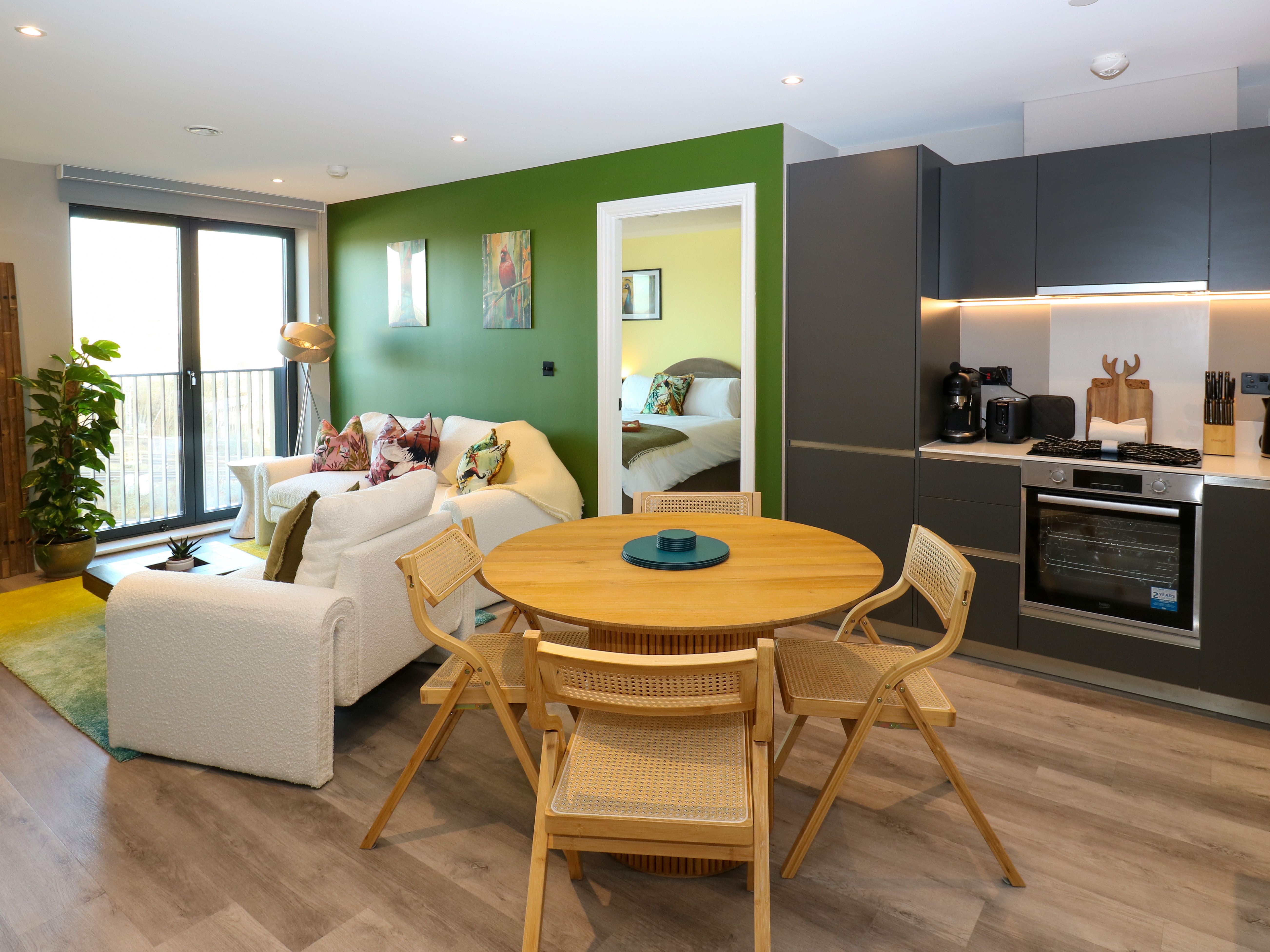 Accomodation Details Sixth-floor apartment. Two bedrooms: 1 x king-size with en-suite bath, shower over, basin, and heated towel rail and WC, 1 x twin (zip/link, can be super-king-size on request). Bathroom with bath, shower over, basin, heated towel rail, WC. Open-plan living space with kitchen, dining area and sitting area