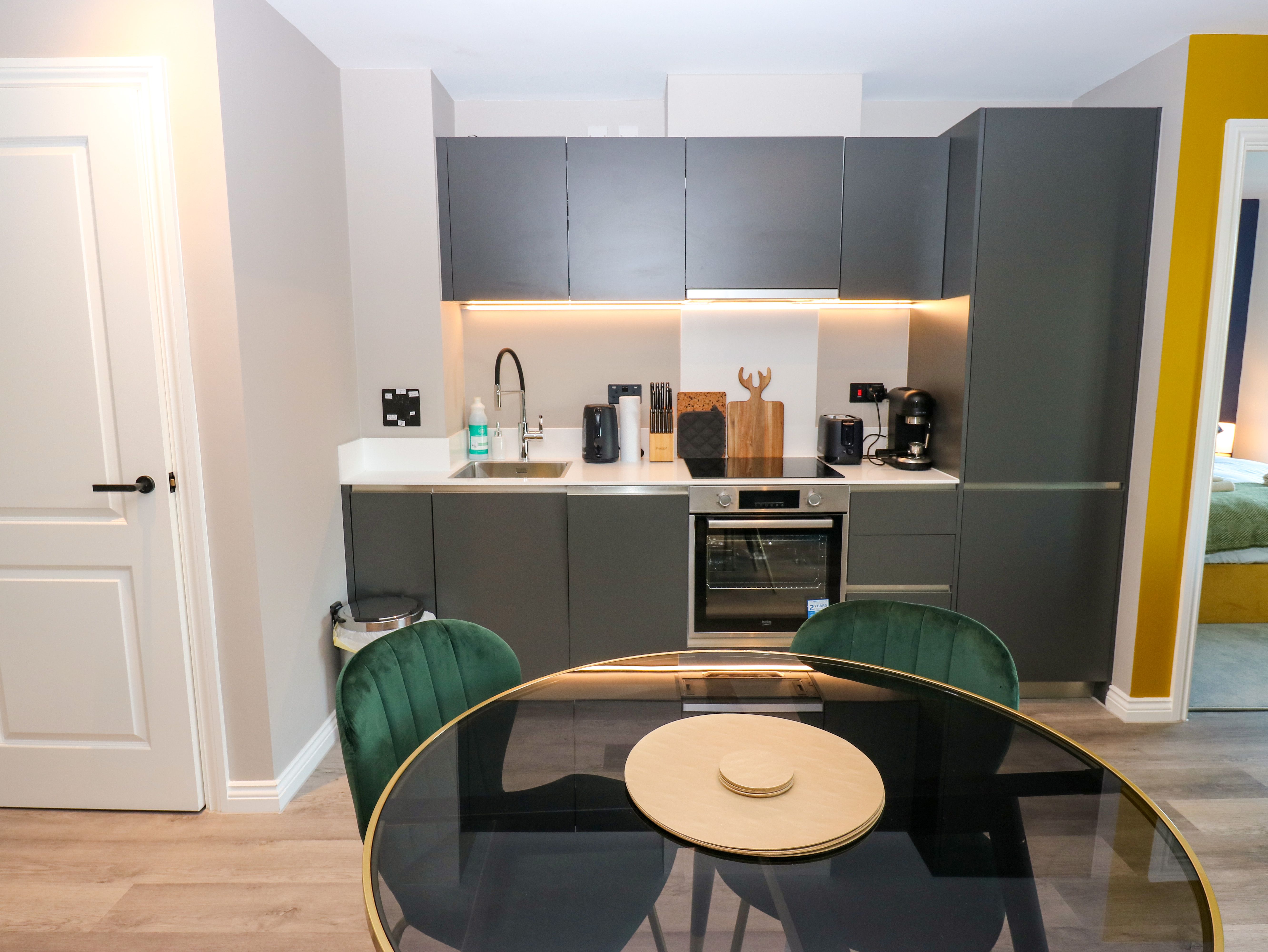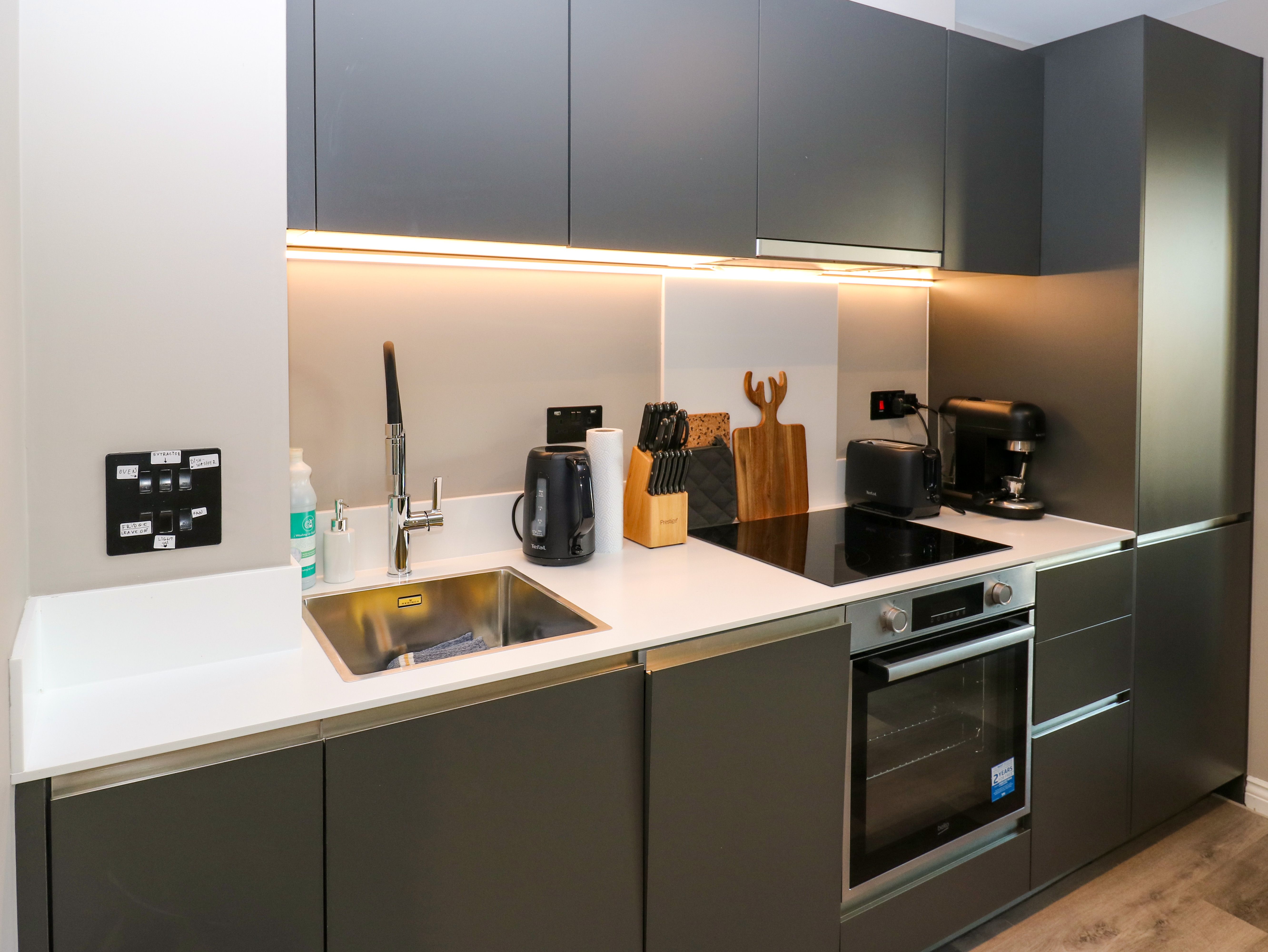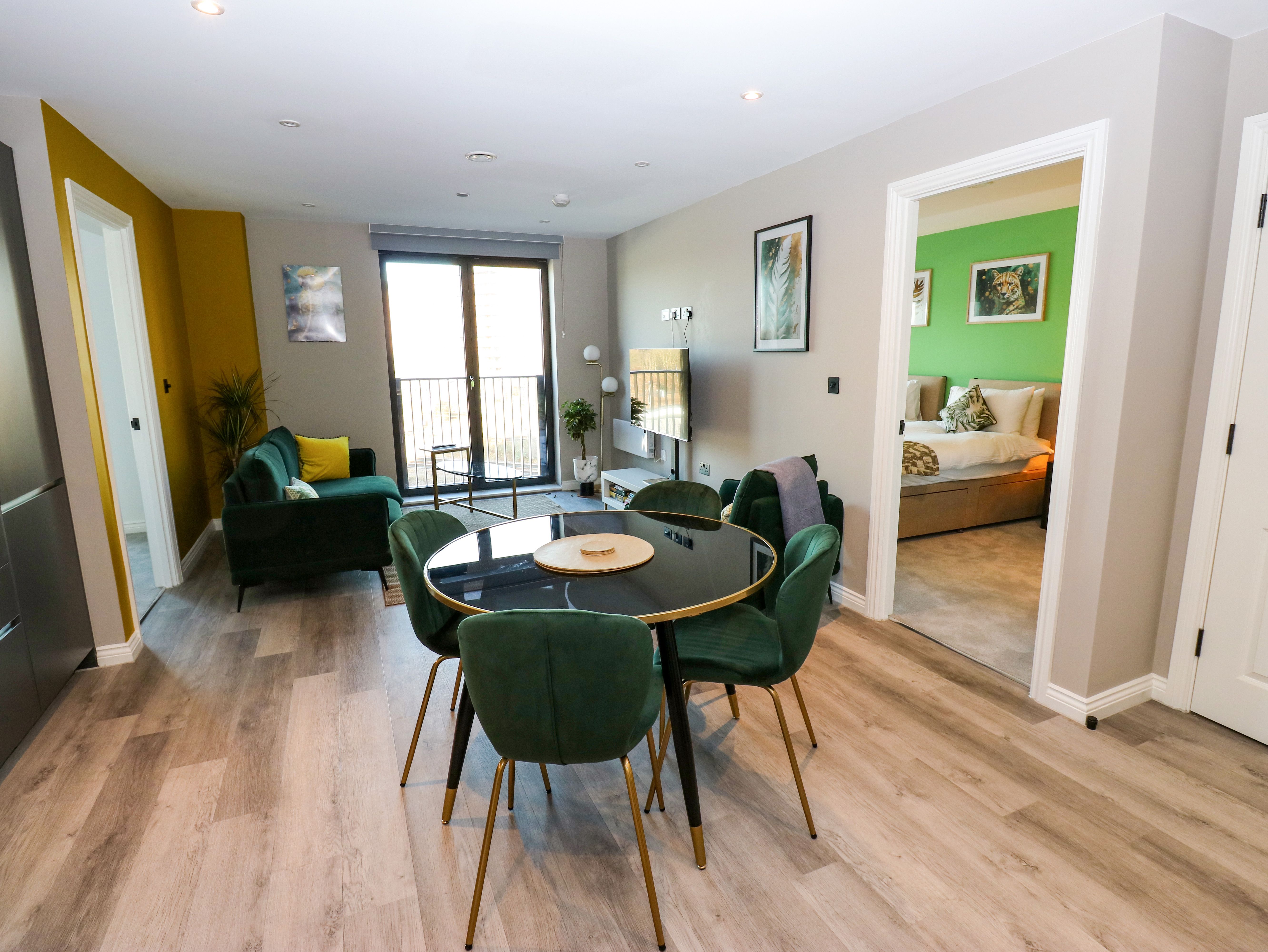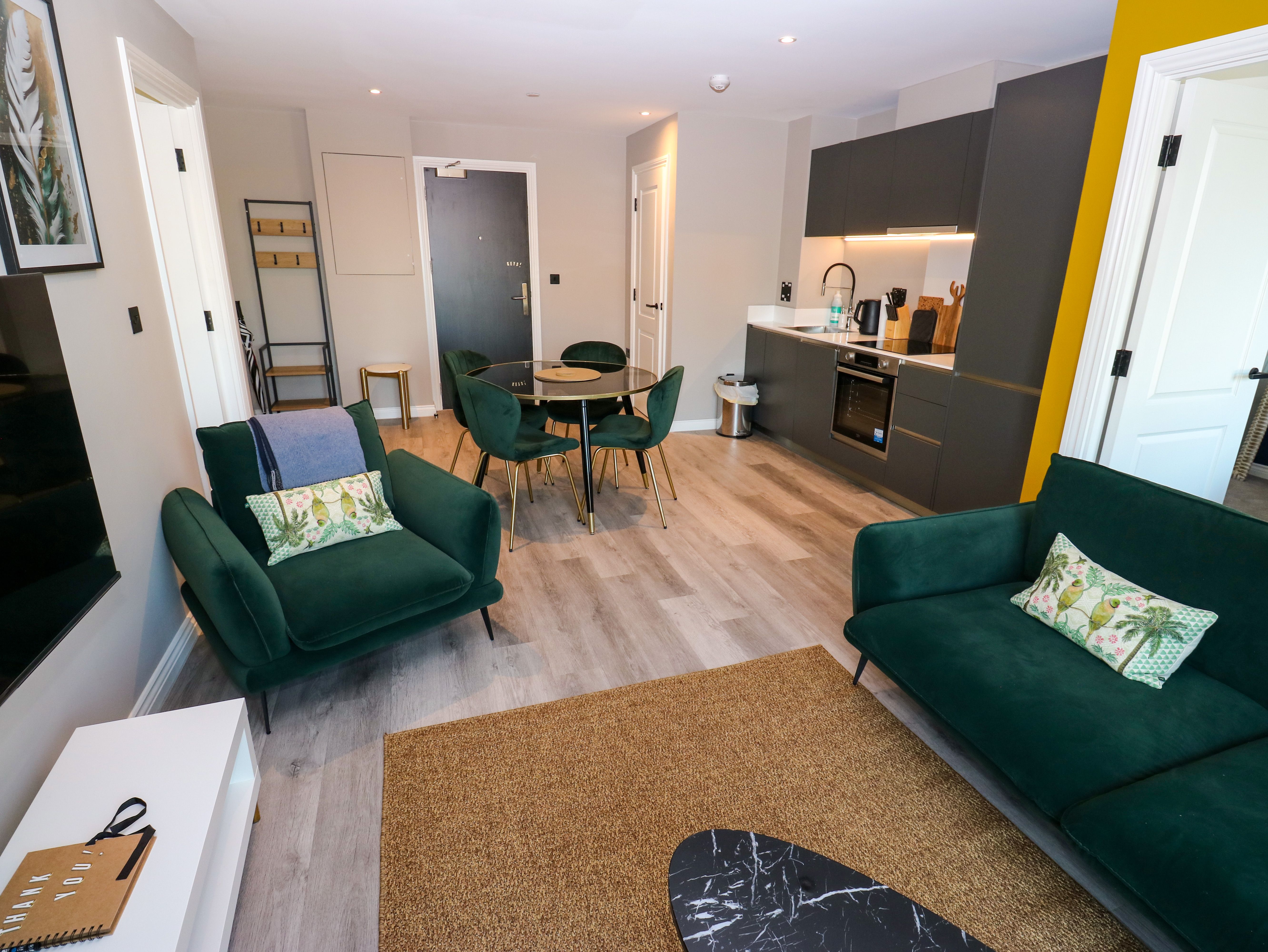 Sixth-floor apartment. Two bedrooms: 1 x double with en-suite with walk-in shower, basin, and heated towel rail and WC, 1 x twin (zip/link, can be super-king-size on request). Bathroom with bath, shower over, basin, heated towel rail, WC. Open-plan living space with kitchen, dining area and sitting area