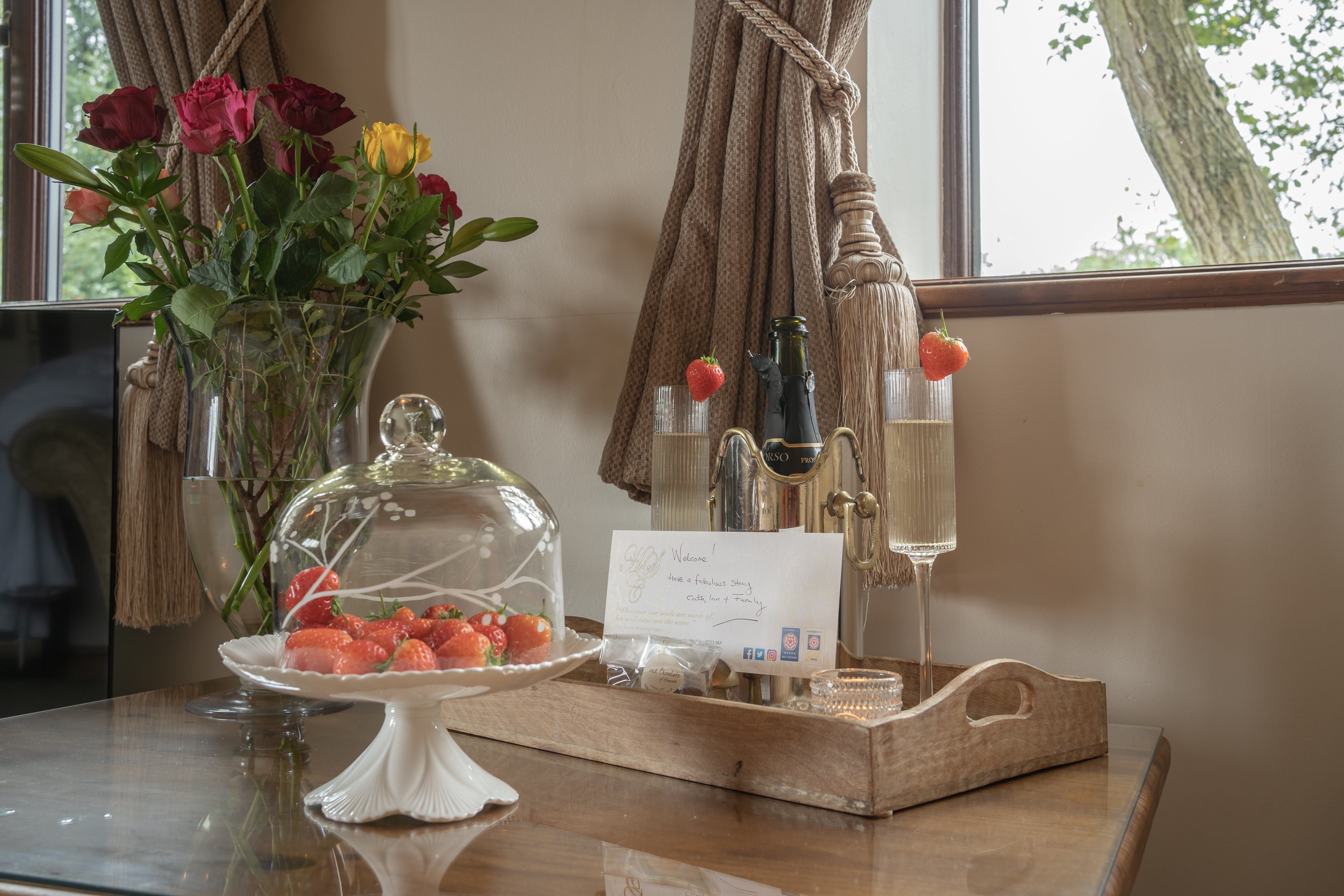 *Tea, fresh coffee, sugar and milk, and luxury biscuits are awaiting your arrival, along with Prosecco, strawberries and fresh flowers