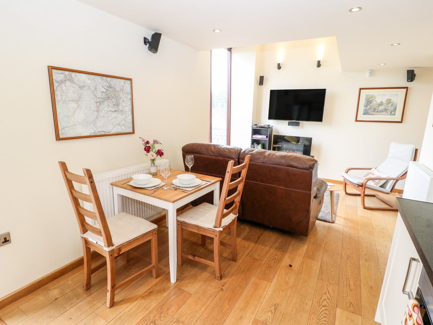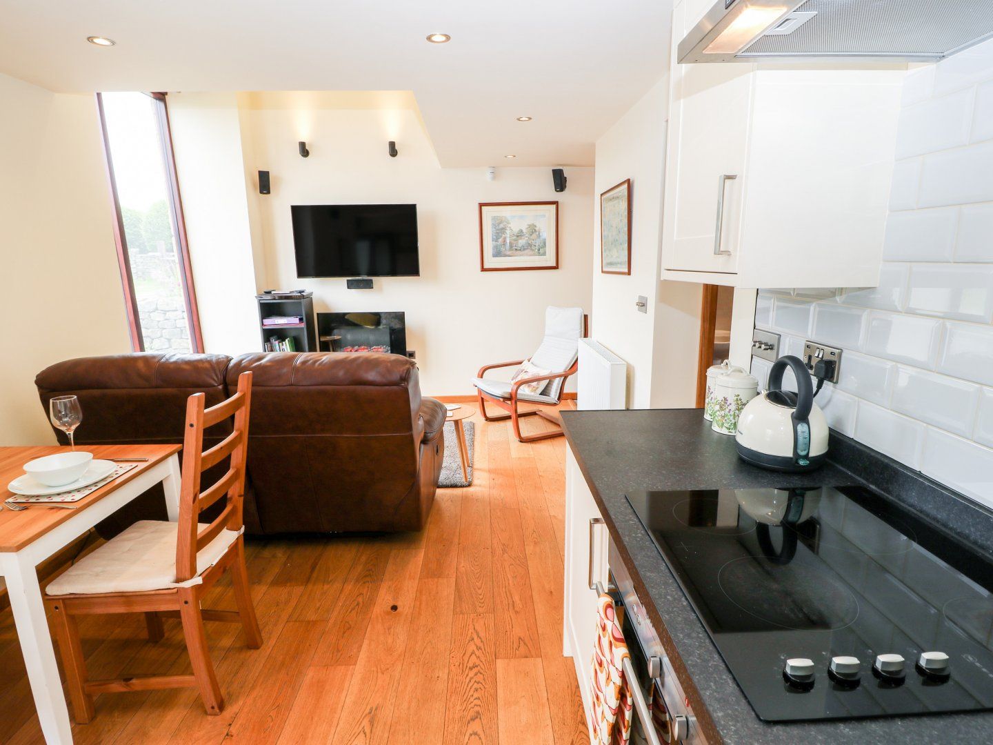 Amenities Electric radiators. Electric oven and hob, microwave, fridge, Smart TV with surround sound, WiFi. Fuel and power inc. in rent. Bed linen and towels inc. in rent. Off-road parking for two cars. Patio with furniture. Two well-behaved dogs welcome. Sorry, no smoking. Shop 0.9 miles, pub 1 mile. Note: Dogs must be always kept on leads due to livestock.