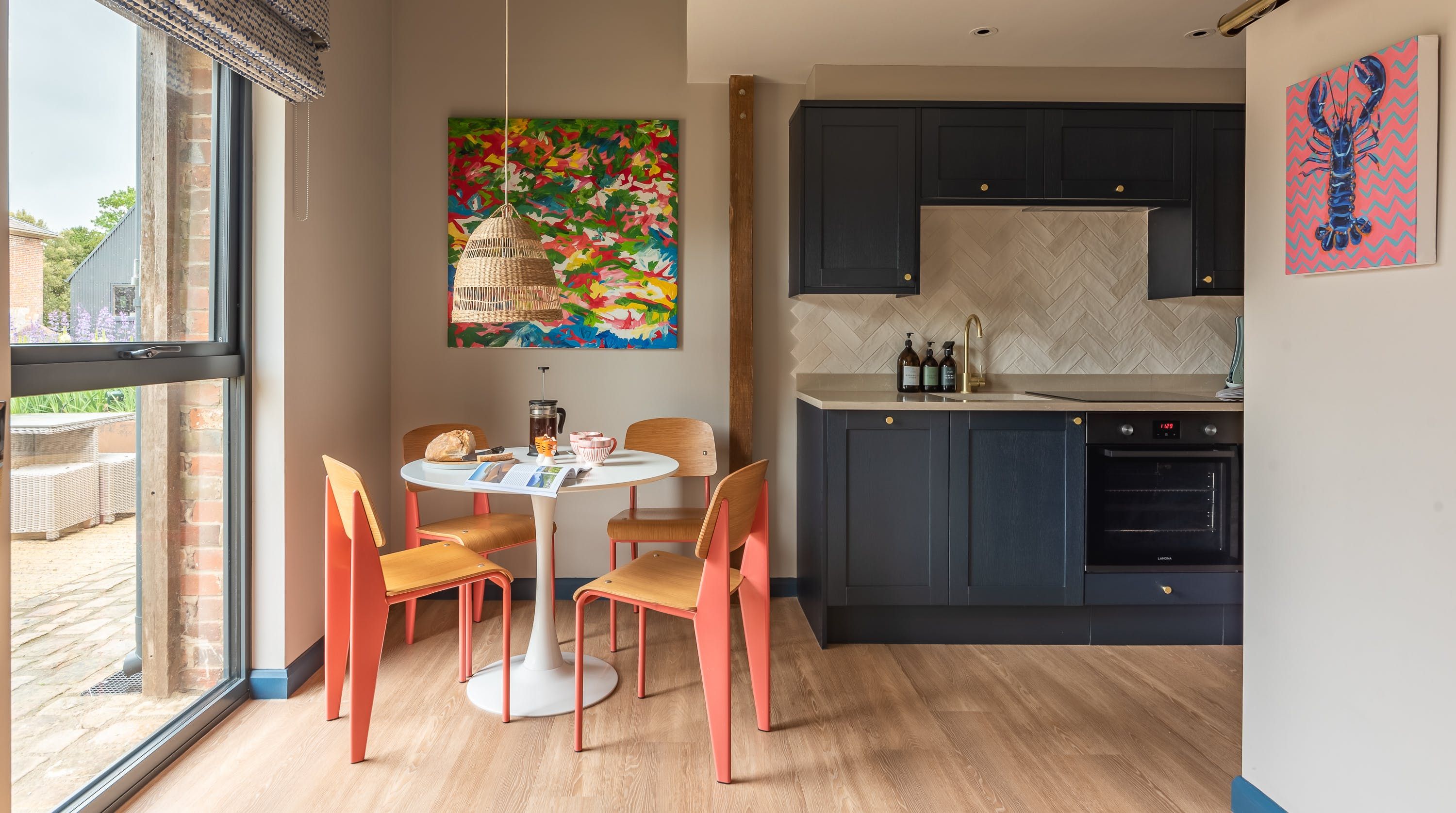 Inside, we love the elegant English interiors with bright textiles and artwork adding a dash of playful modernity. And the whole space feels light and lofty, thanks to the vaulted ceilings. In the small but perfectly formed kitchen, there's a welcome hamper with essentials and homemade goodies to help settle you in – or for something more substantial, your host can deliver farm produce straight to your barn door. And when the sun shines, the beautifully landscaped courtyard is the perfect spot to relax with a book and sundowners. Then fire up the barbecue and firepit to keep the night flowing beneath a blanket of stars.