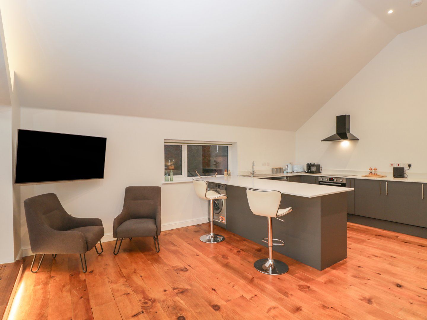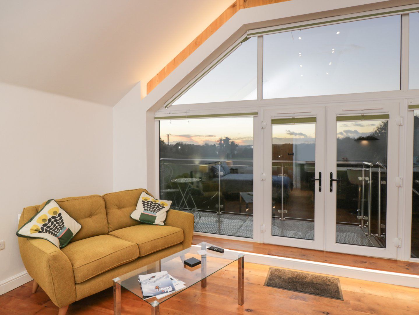 Amenities Electric central heating. Electric oven, induction hob, microwave, fridge, freezer, washing machine, dishwasher. Smart TV, WiFi. Fuel and power inc. in rent. Bed linen and towels inc. in rent. Highchair and travel cot available. Allocated parking for 1 large car or 2 smaller vehicles. Balcony with bistro furniture. One well-behaved dog welcome. Sorry, no smoking. Shop 1.4 miles, pub 1.5 miles. Note: There are steps up to the property. Note: The property is located in a residential area, above the owner's garage. Note: Bike storage is available upon request. Note: Check-in from 4pm, check-out by 10am