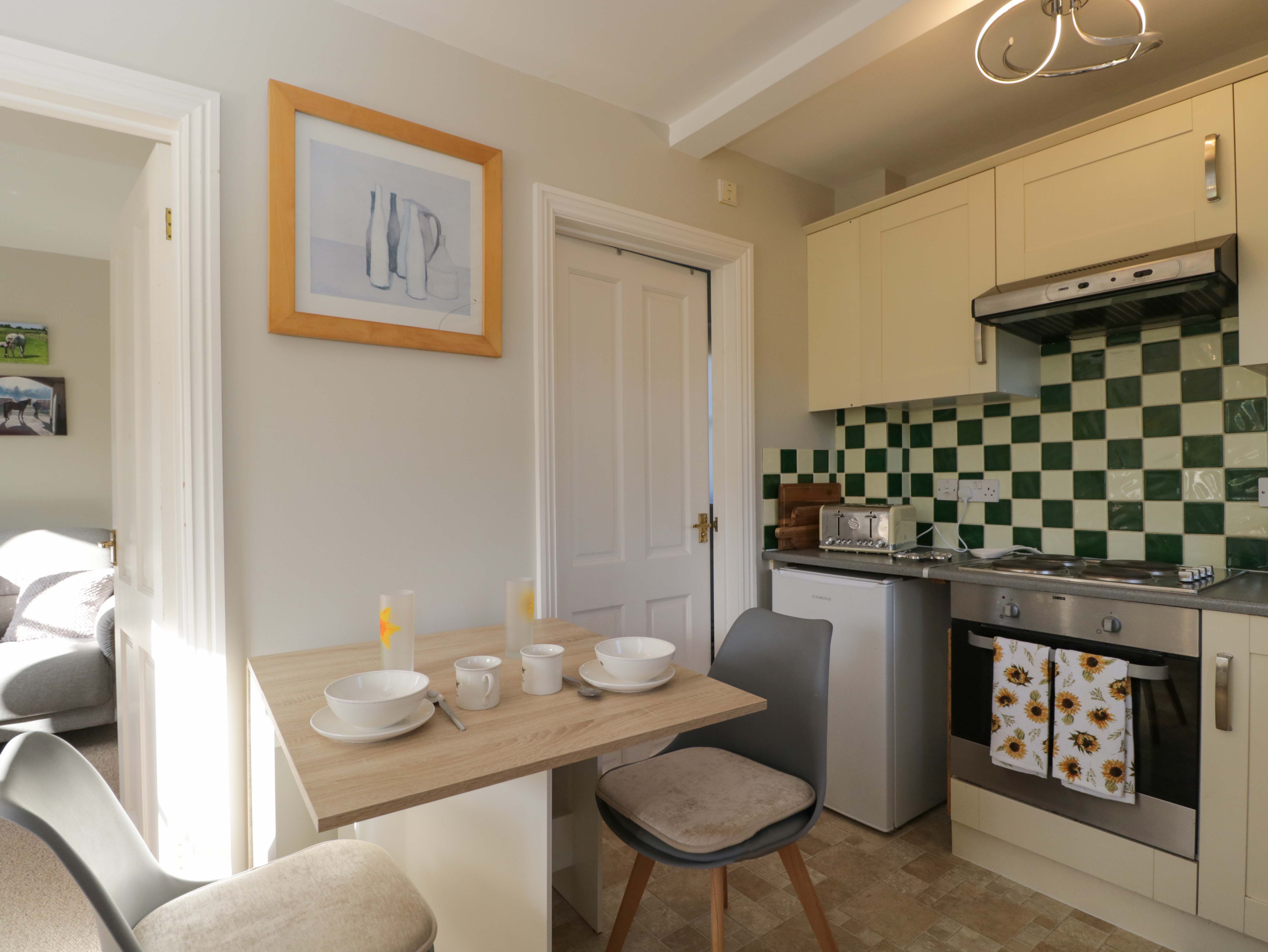 Oil central heating. Electric oven and hob, microwave, fridge, washing machine, toaster, kettle. TV, WiFi. Fuel and power inc. in rent. Bed linen and towels inc. in rent. Highchair and travel cot available. Off-road parking. Side patio with furniture. Two well-behaved pets welcome. Sorry, no smoking. Shop 4 miles, pub 1.3 miles. Note: Guests can use the outdoor pool with prior arrangement. Note: Guests can bring their horses with prior arrangement. Please note: The stairs to the bedroom are slightly steeper and narrower than normal and may be difficult if you have mobility issues. Note: This property has a Good Housekeeping Bond of £150