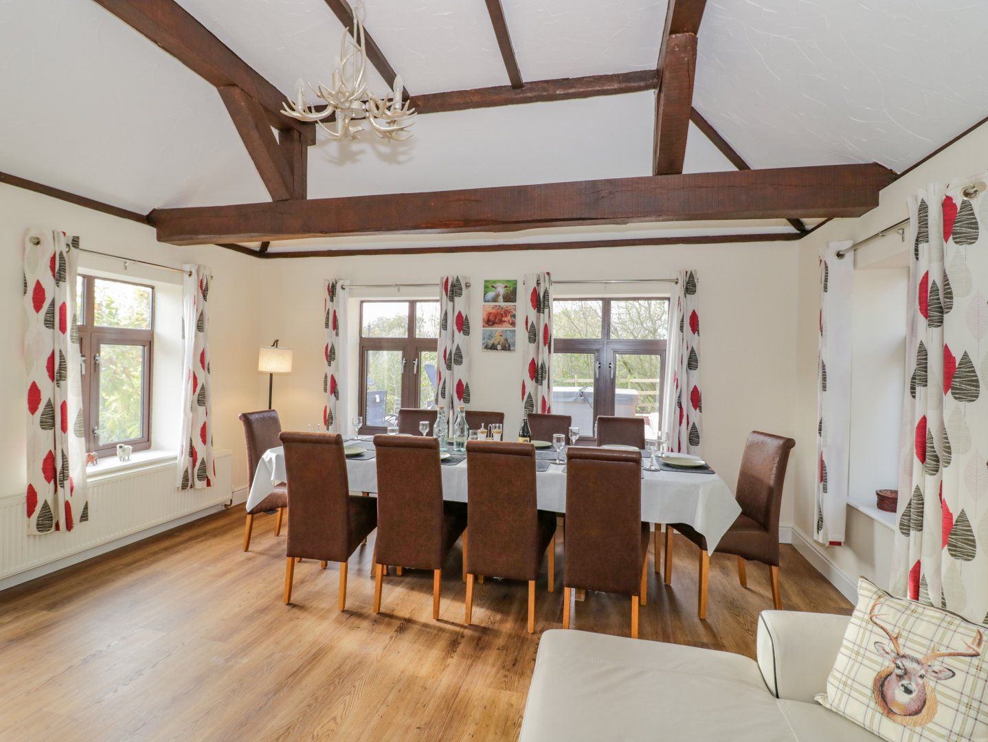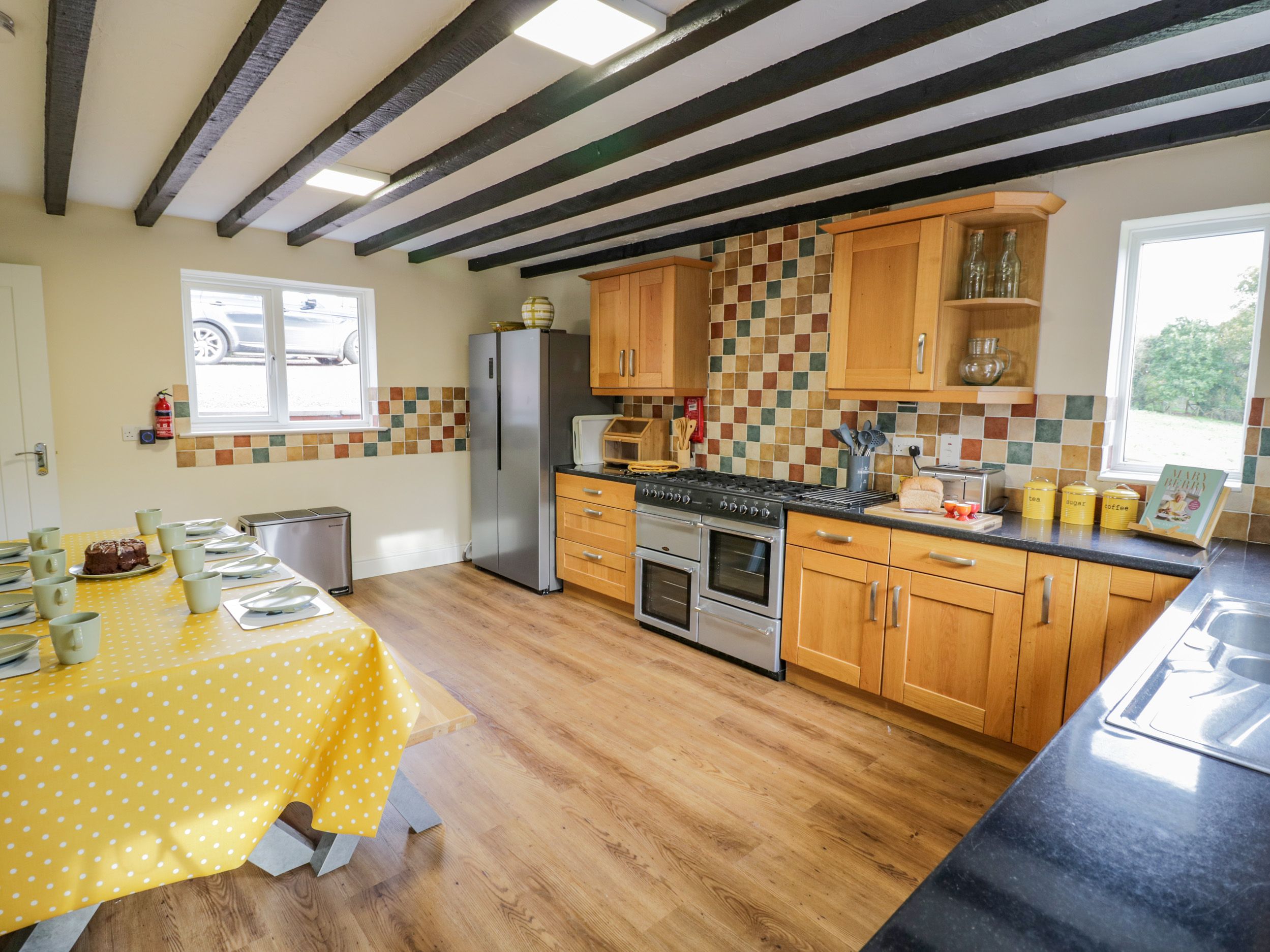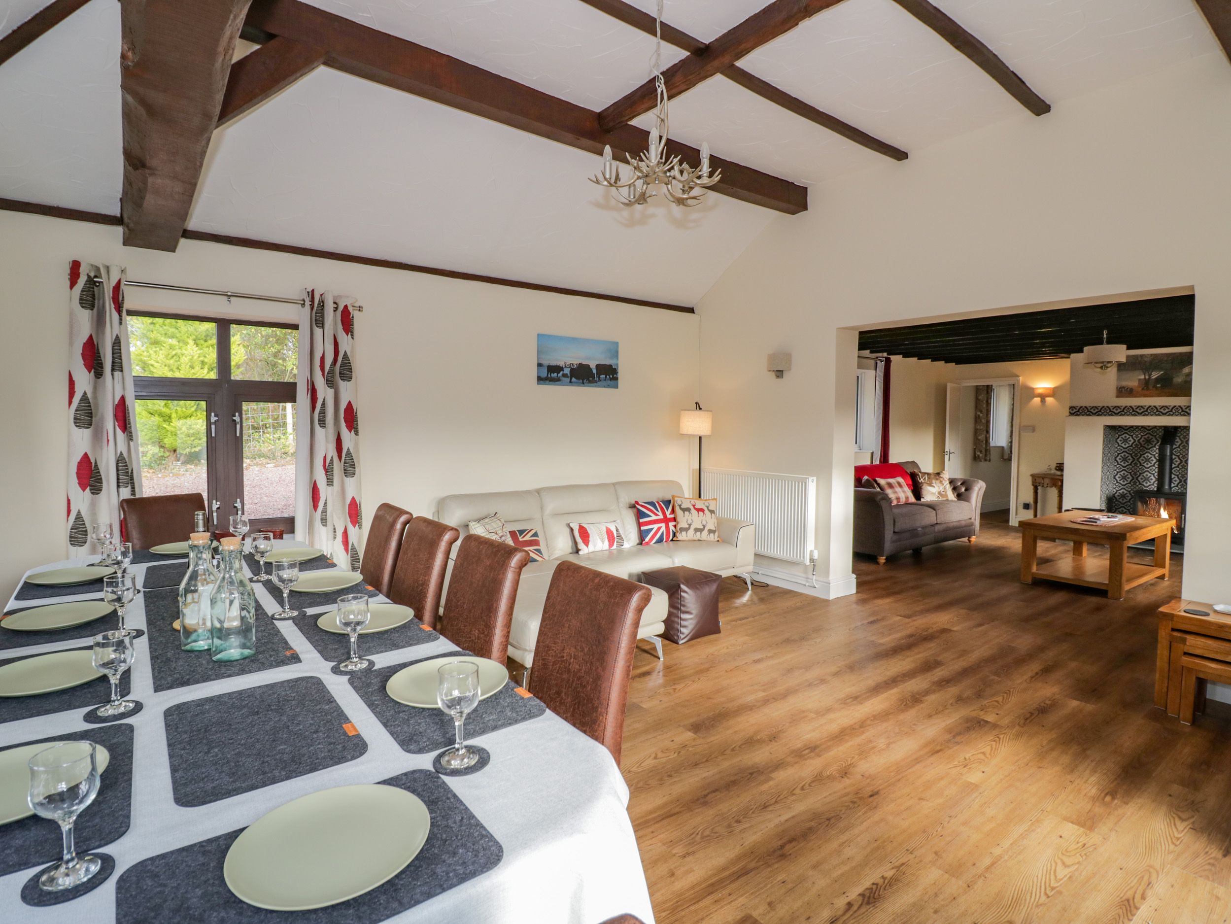 Ground Floor. Living with woodburning stove, Smart TV with DVD player, ample sofas and chair and selection of books and DVDs, Separate dining room with dining table for 10, corner sofa, stand alone DVD player and selection of board games. Eat in Kitchen with electric range oven with gas hob, microwave, large fridge freezer, dishwasher, Dolce Gusto coffee maker, toaster, electric kettle, high chair and ample supply of utensils, cooking equipment, cutlery, china and glasses. Bedroom suite with super king zip link bed (can be twin on request), wardrobe, dressing table with hairdryer and separate sitting area with Freeview TV and DVD and tip up/recliner chair. Ground-floor shower room, walk-in shower, basin, heated towel rail, wc and cabinet for toiletries. Utility with washing machine, tumble dryer and supply of doggy towels, so ideal space for drying wet paws. First Floor. Master Bedroom with super king bed, wardrobe, chest of drawers dressing table, hair dryer and travel cot (please bring own bedding for cot). Bedroom with super king zip link bed (can be twin on request), wardrobe, chest of drawers, dressing table and hairdryer. Two further bedrooms both with double bed, chest of drawers, hanging hooks and hairdryer. Bathroom with bath, walk in shower, heated towel rail, wc, and cabinet for toiletries. Outside. Wrap around garden with patio, private hot tub, terrace and garden furniture. Garage (lockable, so can be used for safe storage of mountain bikes and the like). Use of field at rear of the property (please pick up after your canine companions). Private driveway and extensive parking.
