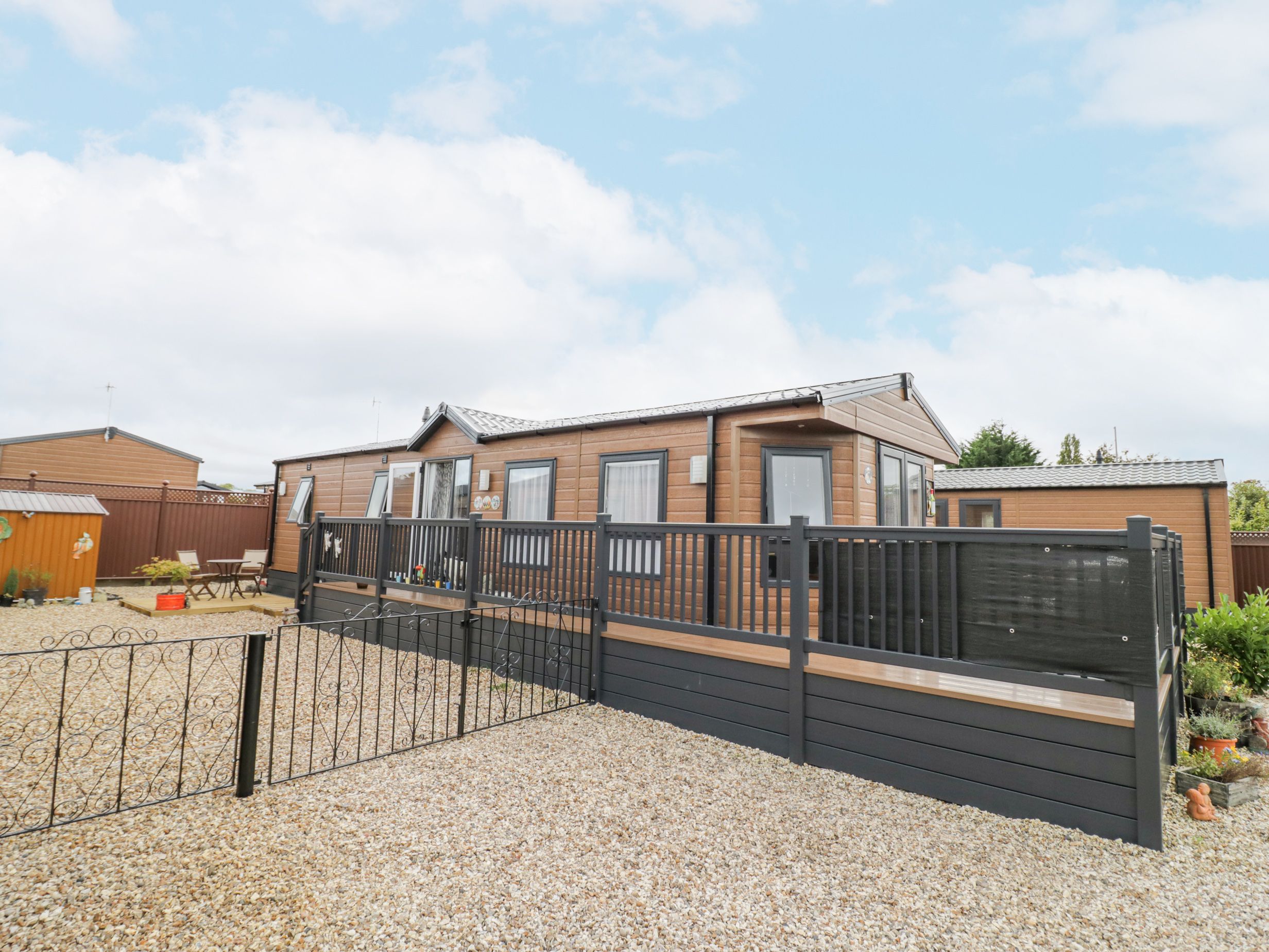 Holiday home Serenity in Long Acres Holiday Park has one double bedroom with en-suite walk-in shower, basin, and WC, and a twin bedroom, along with a bathroom with bath, shower over, basin, and WC. There's an open-plan living space including a kitchen, dining area, and sitting area equipped with an electric oven and gas hob, microwave, fridge/freezer, washing machine, dishwasher and Smart TV. WiFi, fuel, power, bed linen and towels inc. in rent. Outside there's off-road parking for two cars, a wraparound decking with furniture, an enclosed, front garden with decking, gravel, and furniture. Two well-behaved dogs allowed. Sorry, no smoking. Within 0.9 miles, you will find a shop, and within 1.9 miles, you will find a pub. Escape to Evesham at Serenity. Note: Check-in from 4pm, check-out by 10am. Note: Although the property is single-storey, there are steps up to entrance.