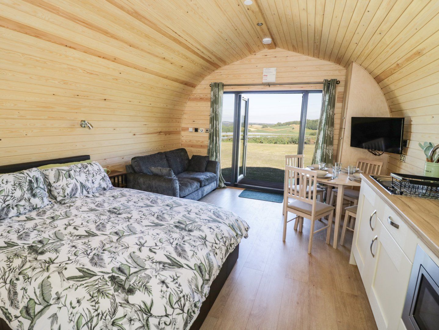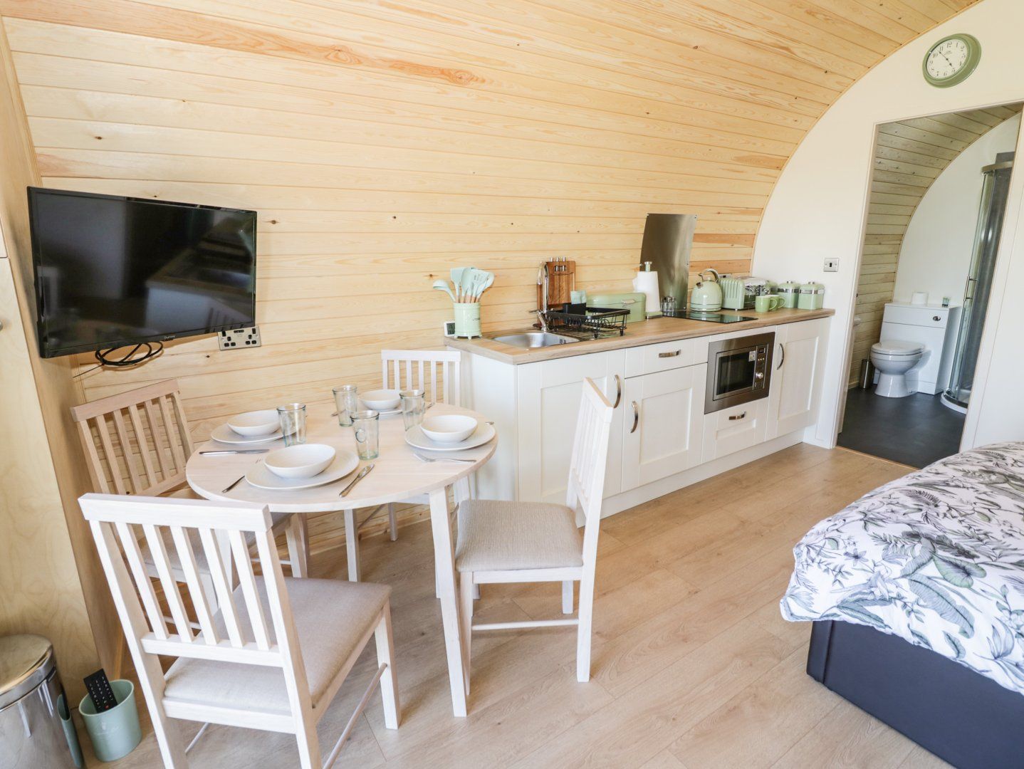 Single-storey. One adult bunk bed. Shower room with walk-in shower, basin and WC. Studio-style layout with double bed, kitchen, dining area and sitting area, sofa bed