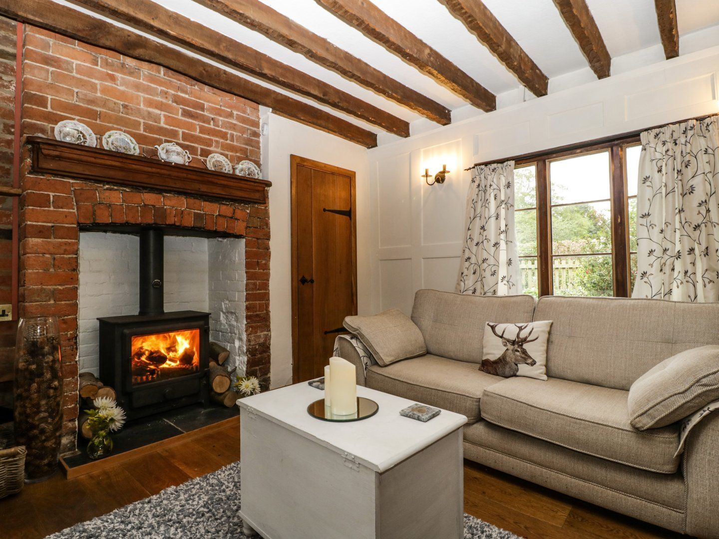 Oil central heating with woodburning stove. [Type] oven and hob, microwave, fridge, dishwasher. TV, WiFi. Fuel, power and starter pack for woodburning stove inc. in rent. Bed linen and towels inc. in rent. Highchair, travel cot and stairgate available on request. Off-road parking for 1 car. Private garden with patio, gravel, lawn and furniture. Sorry, no pets and no smoking. Shop and pub 1.8 miles. Note: This property has a Good Housekeeping Bond of £100. Note: There is a mesh covered well in the rear garden, please do not touch the mesh and ensure children are supervised at all times.