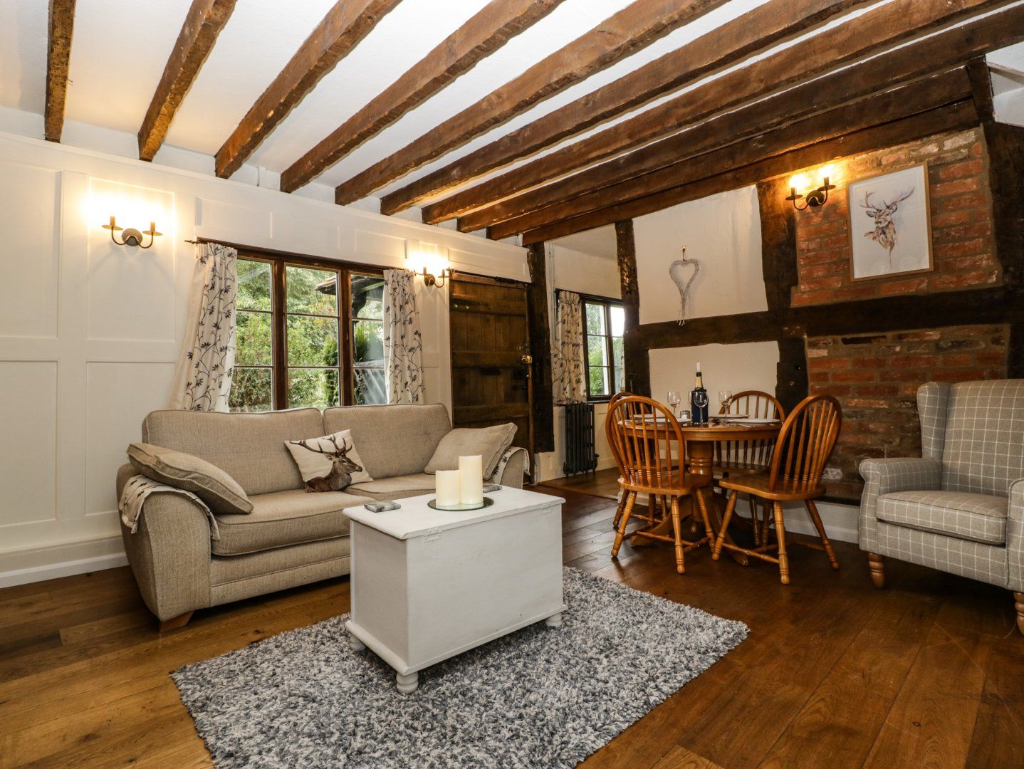 Two bedrooms: 1 x double, 1 x 4' double. Ground-floor bathroom with roll-top bath, walk-in shower, basin, heated towel rail and WC. Kitchen. Living/dining room with woodburning stove