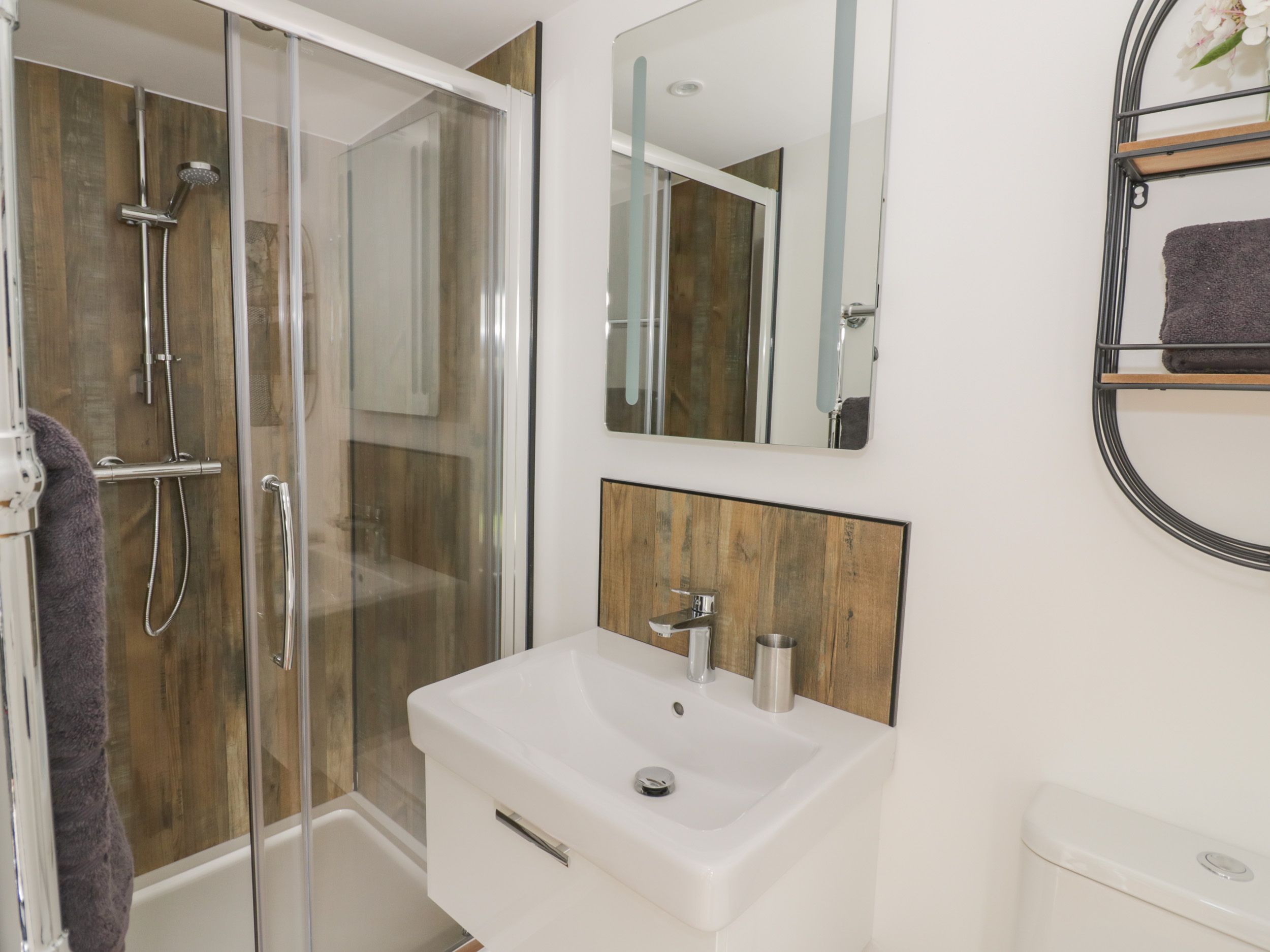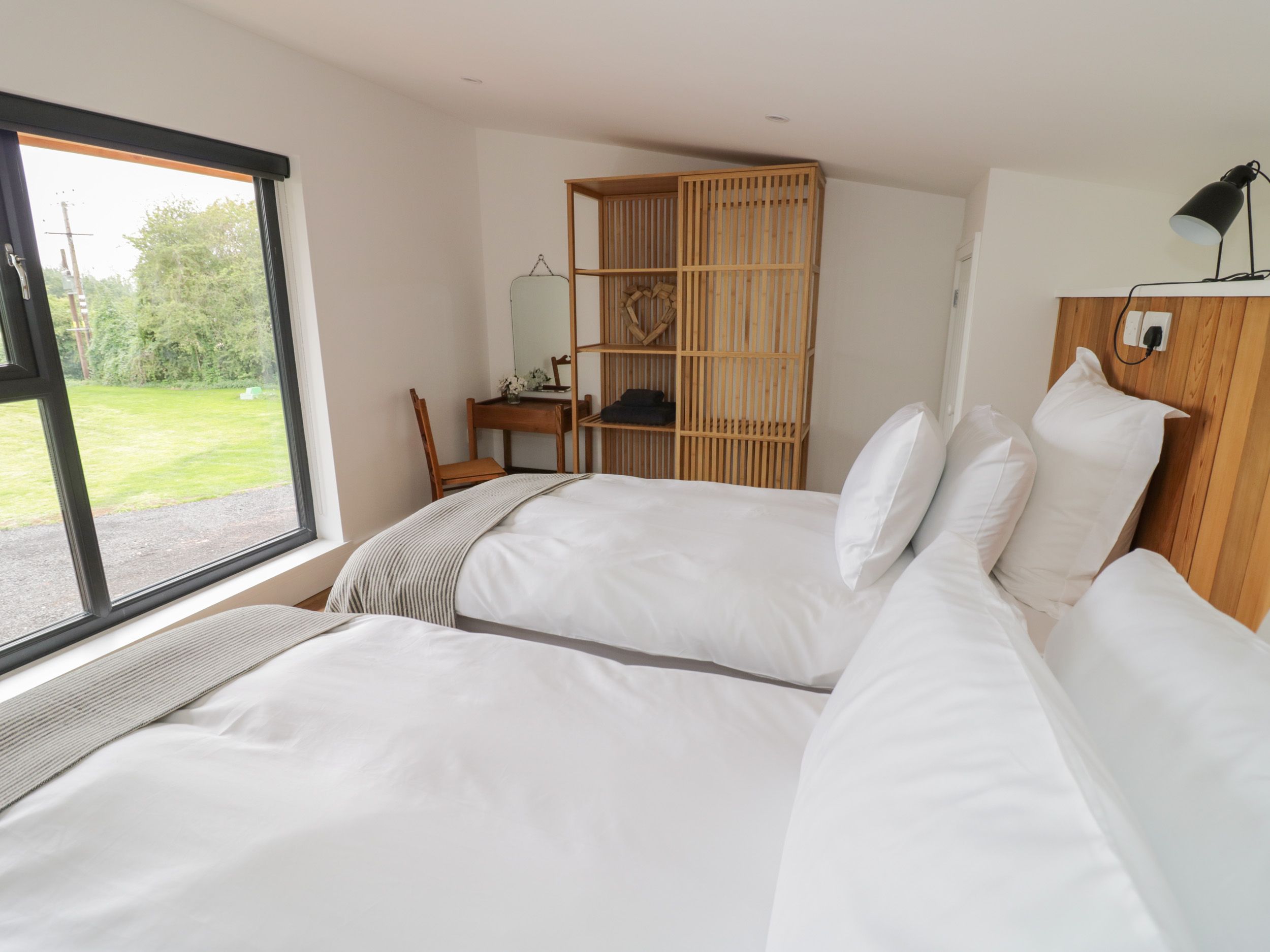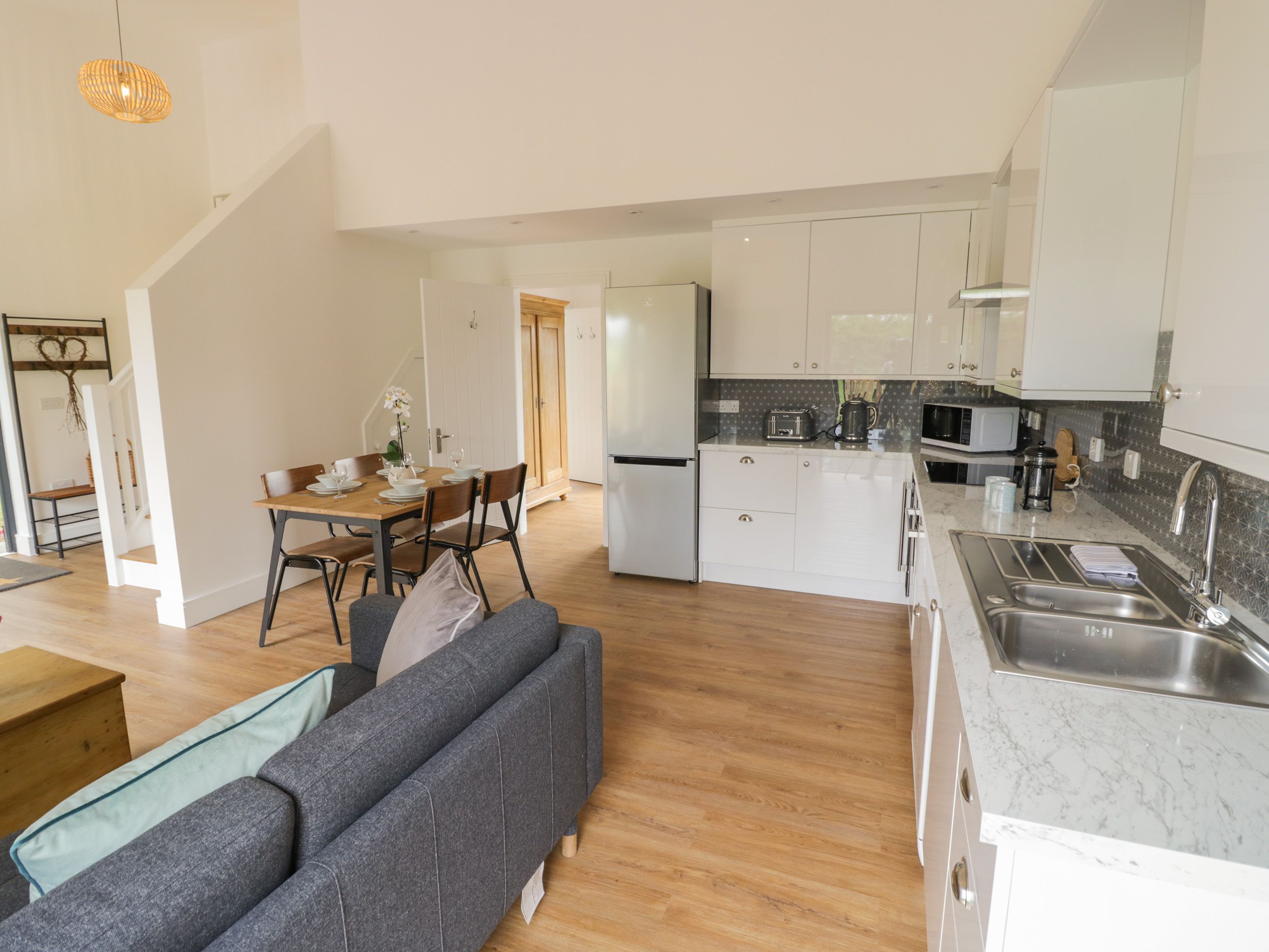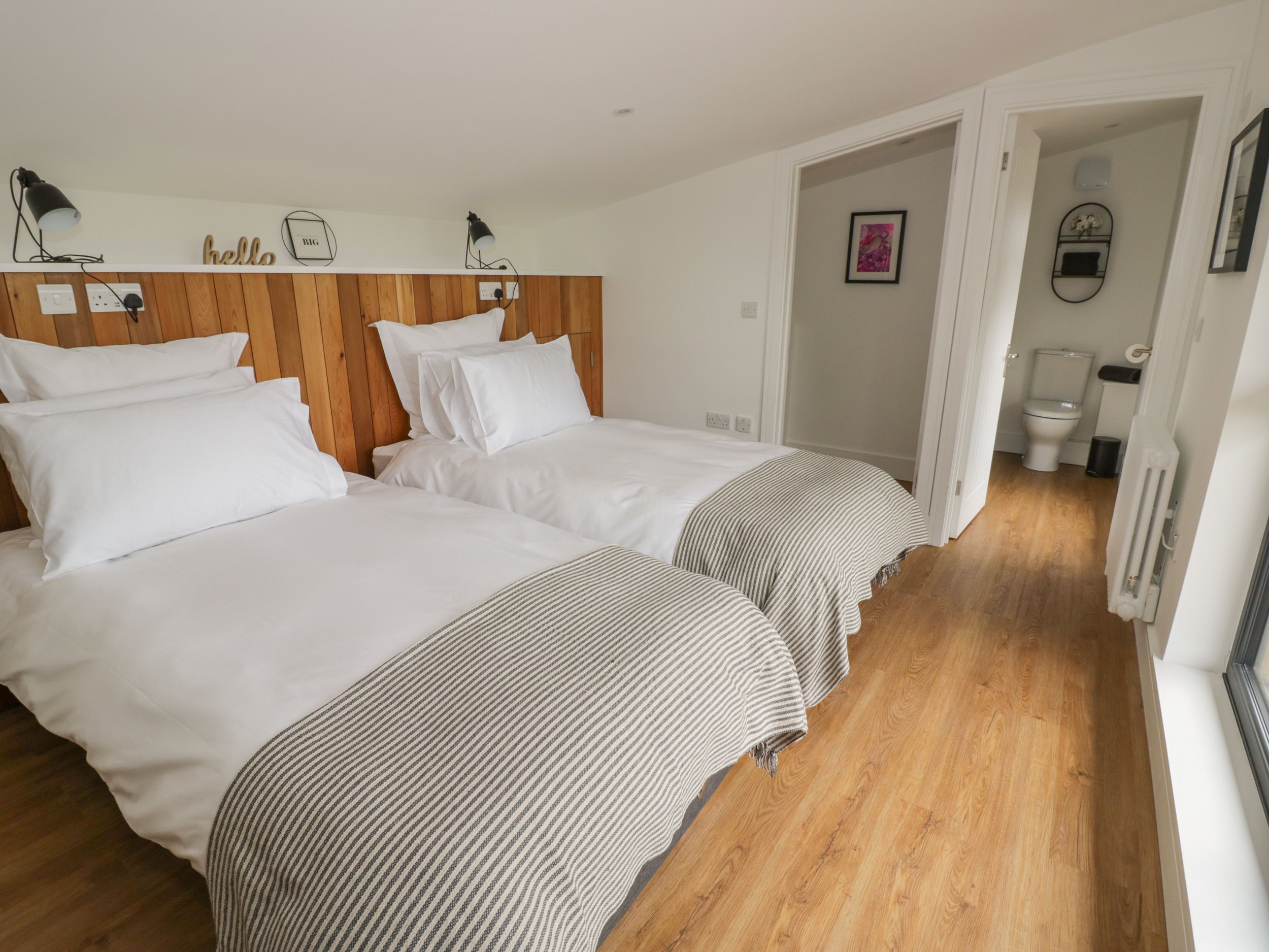 Two bedrooms: 1 x super-king-size (zip/link, can be made into a twin) with en-suite shower room with walk-in shower, basin, heated towel rail and WC, 1 x ground-floor king-size with en-suite bathroom with shower over bath, basin, heated towel rail and WC. Open-plan living room with kitchen, dining and seating area