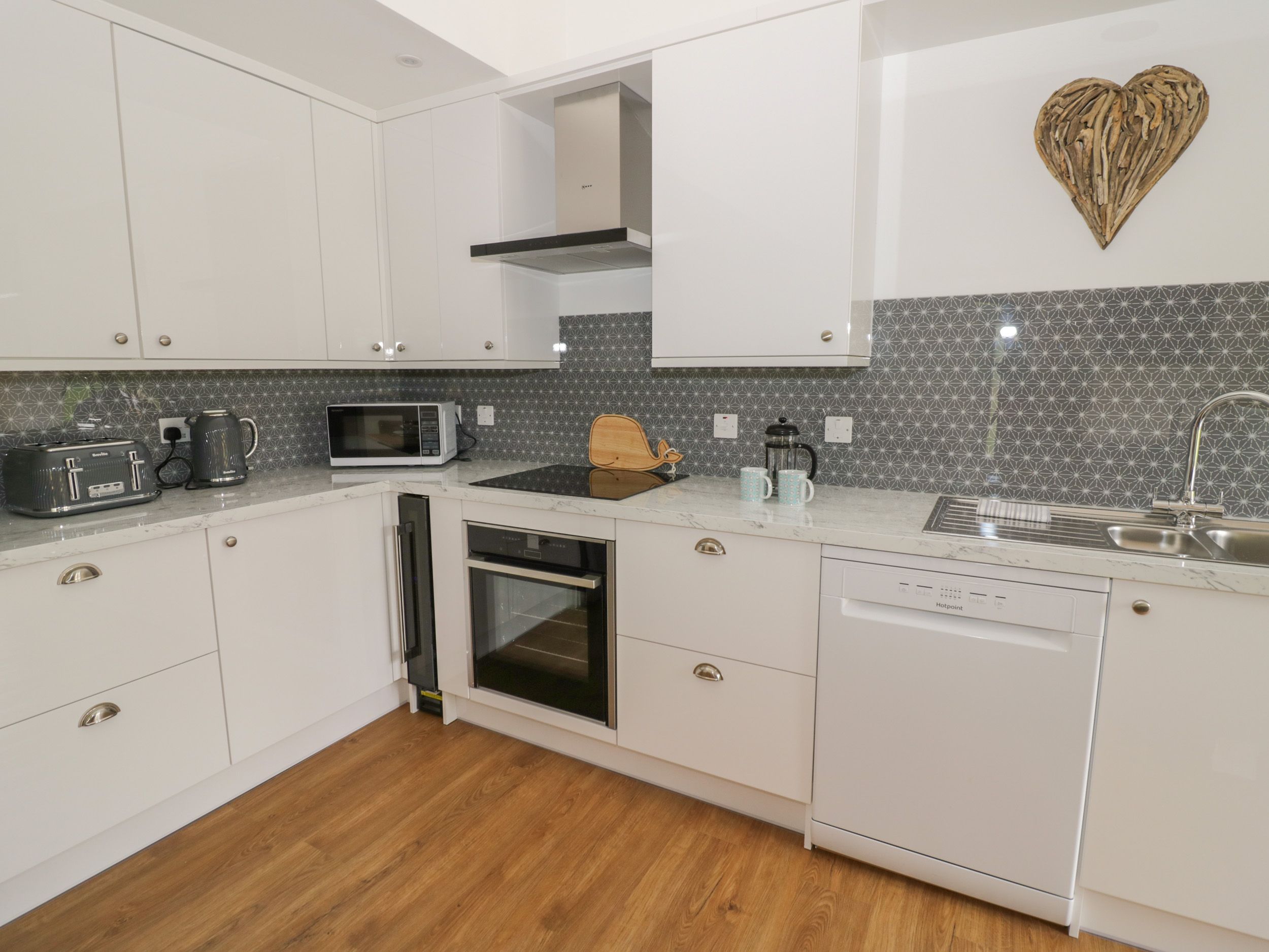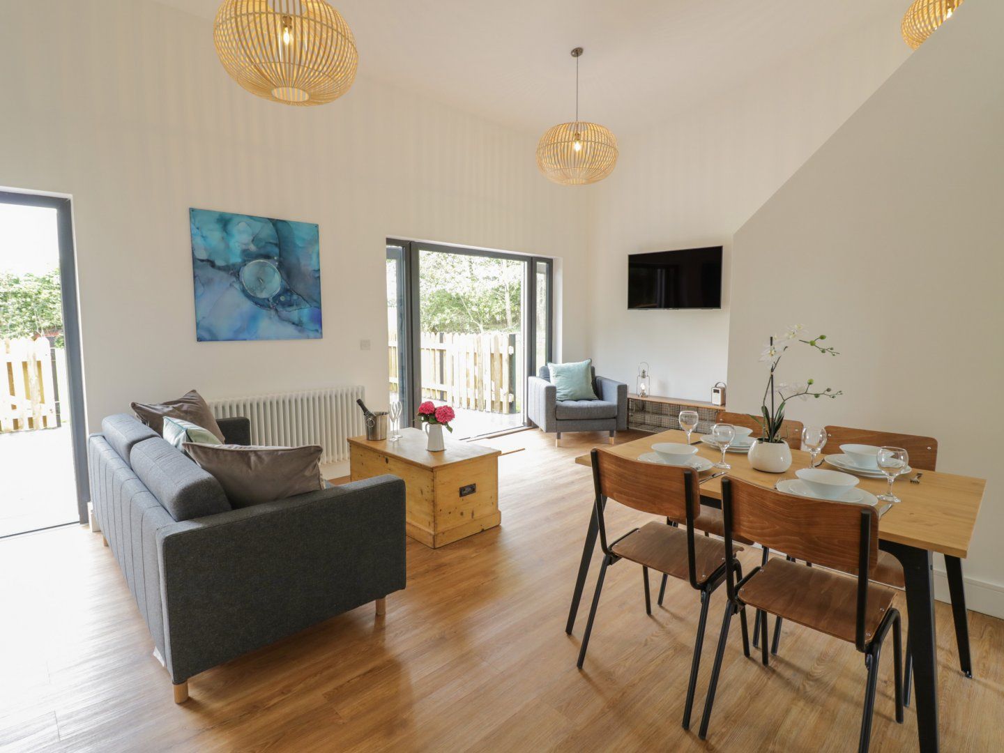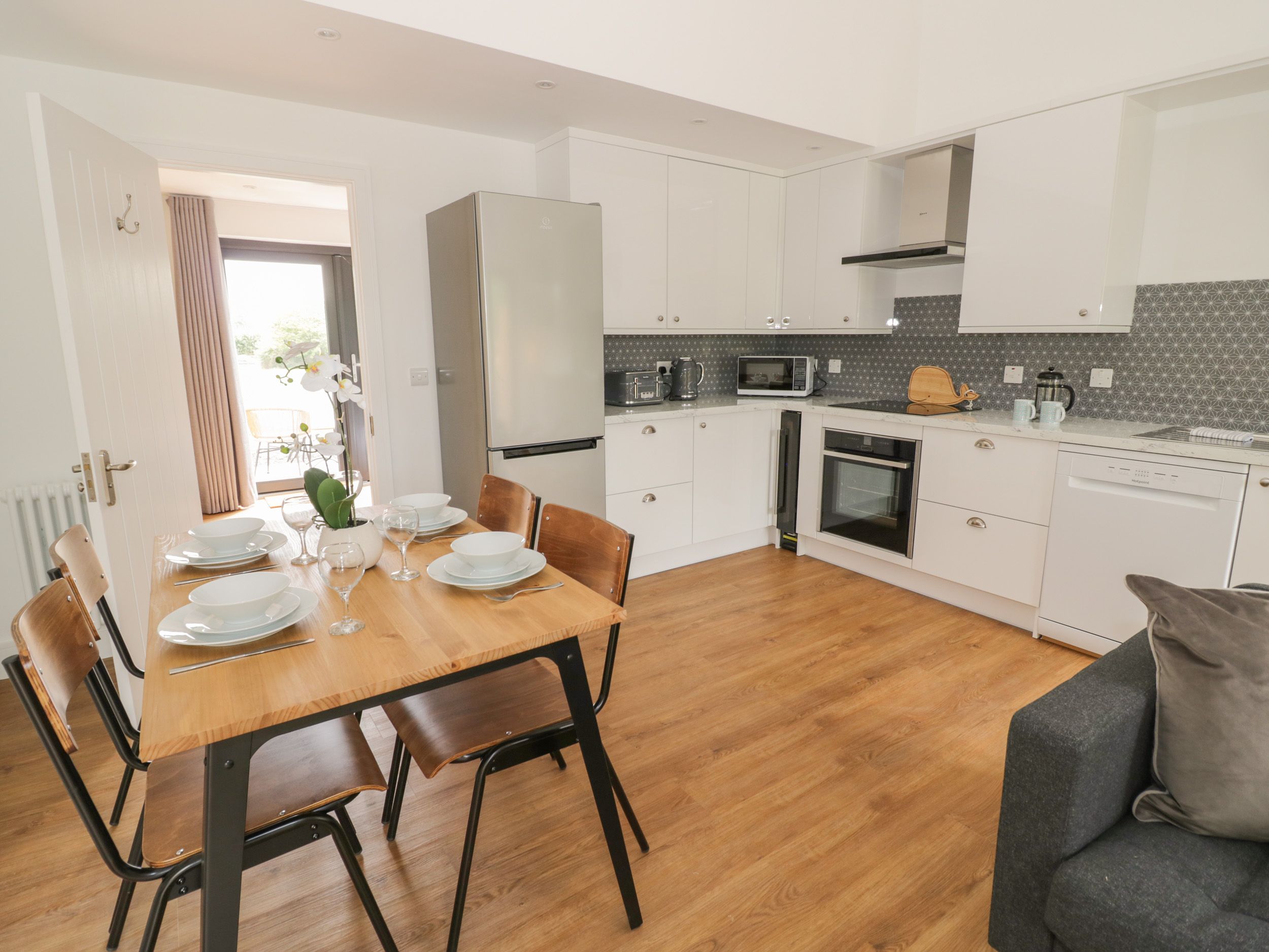 Electric heating. Electric oven and hob, microwave, fridge/freezer, washer/dryer, dishwasher, Smart TV and WiFi. Fuel and power inc. in rent. Bed linen and towels inc. in rent. Travel cot and highchair available. Private, enclosed, rear patio with furniture and sun loungers. Shared lawn and use of surrounding 10 acres of land with picnic bench and fire pit and with shed for bike storage. One well behaved pet welcome. Sorry, no smoking. Shop 1.5 miles, pub 1.7 miles. Note: Property has access to a quick charge electric charger for all cars. Payable through an App