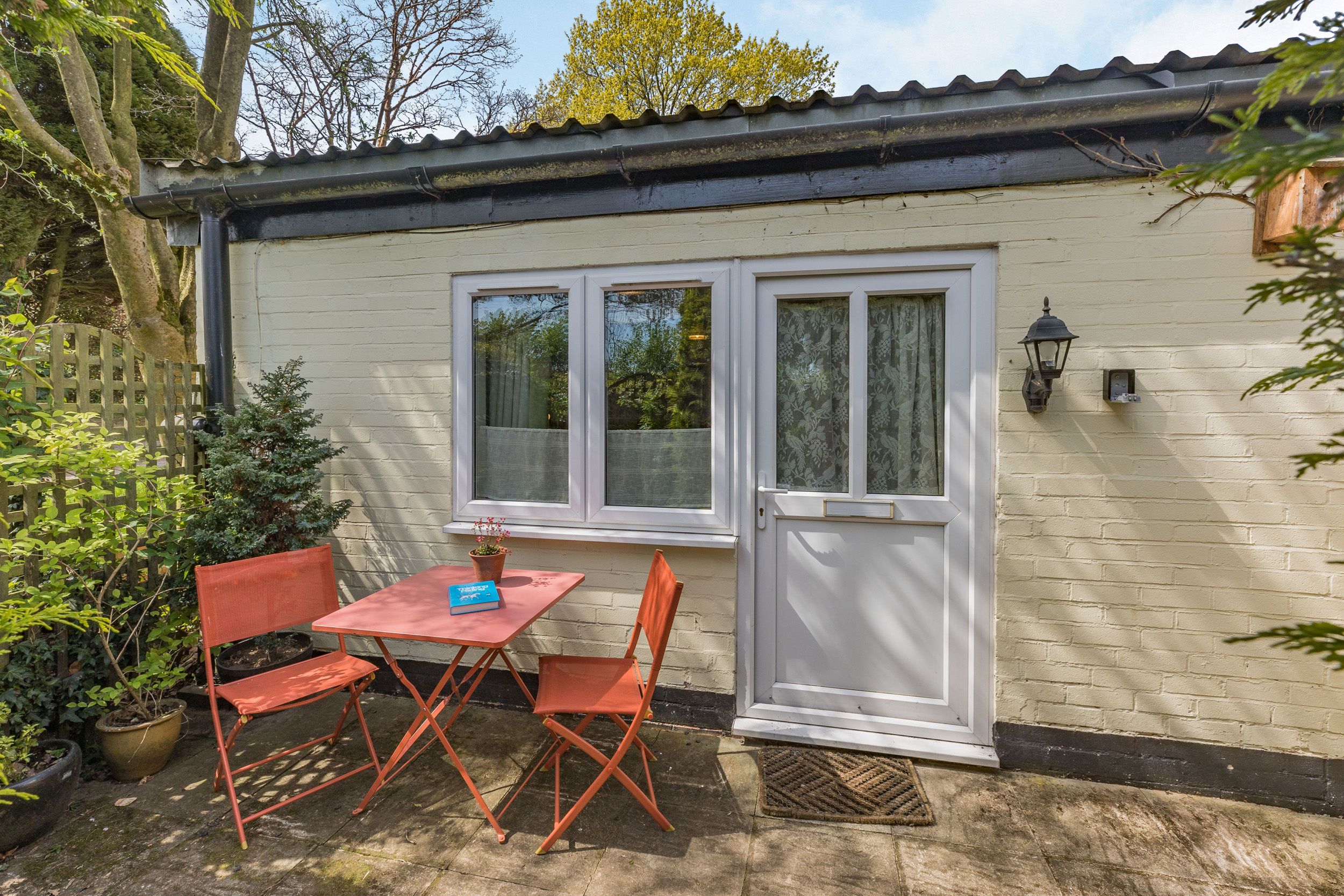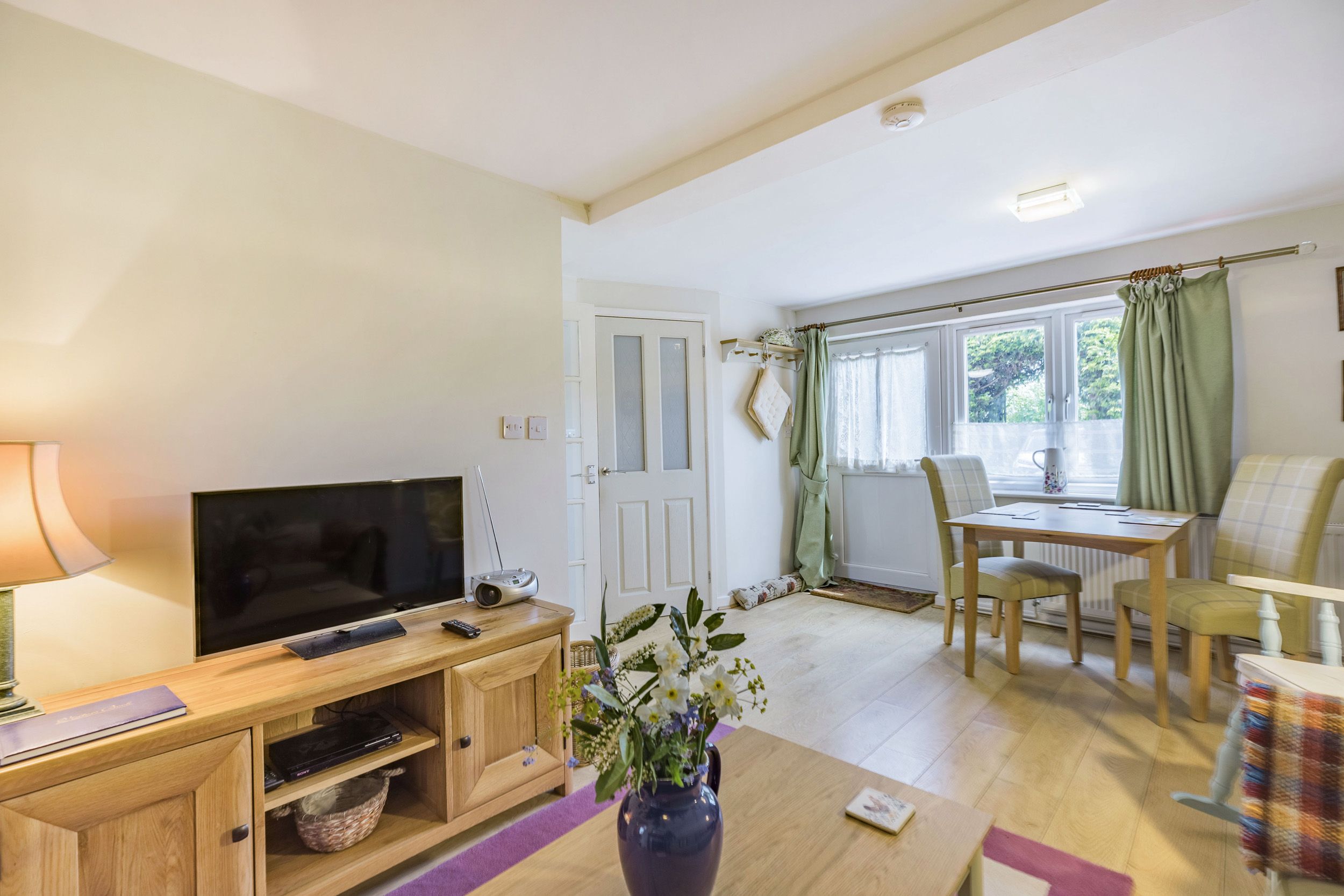 Amenities Electric heating in the main livingroom and in the bedroom. Electric oven and hob, microwave, fridge, dishwasher. TV with Freeview, WiFi, selection of books and games. Fuel and power inc. in rent. Lockable bike storage. Off-road parking for one car. Enclosed patio garden at front with patio furniture, as well as additional seating in the owner's orchard garden which is located about 30 meters from the back door of the property. Towels and linen included. Sorry, no pets, no smoking. Shop and pub 0.3 miles. Note: The WiFi is shared with the owners, also mobile phone signal may not be great depending on the network provider. Note: There are two steps and a low doorway into the bedroom and a large step outside the back door. Note: There is a shared utility room with the owner outside with a washing machine. Note - slightly narrow entrance into shower. Please note: Horse owners can bring their horse as there are stables (2 maximum), please contact for more details.
