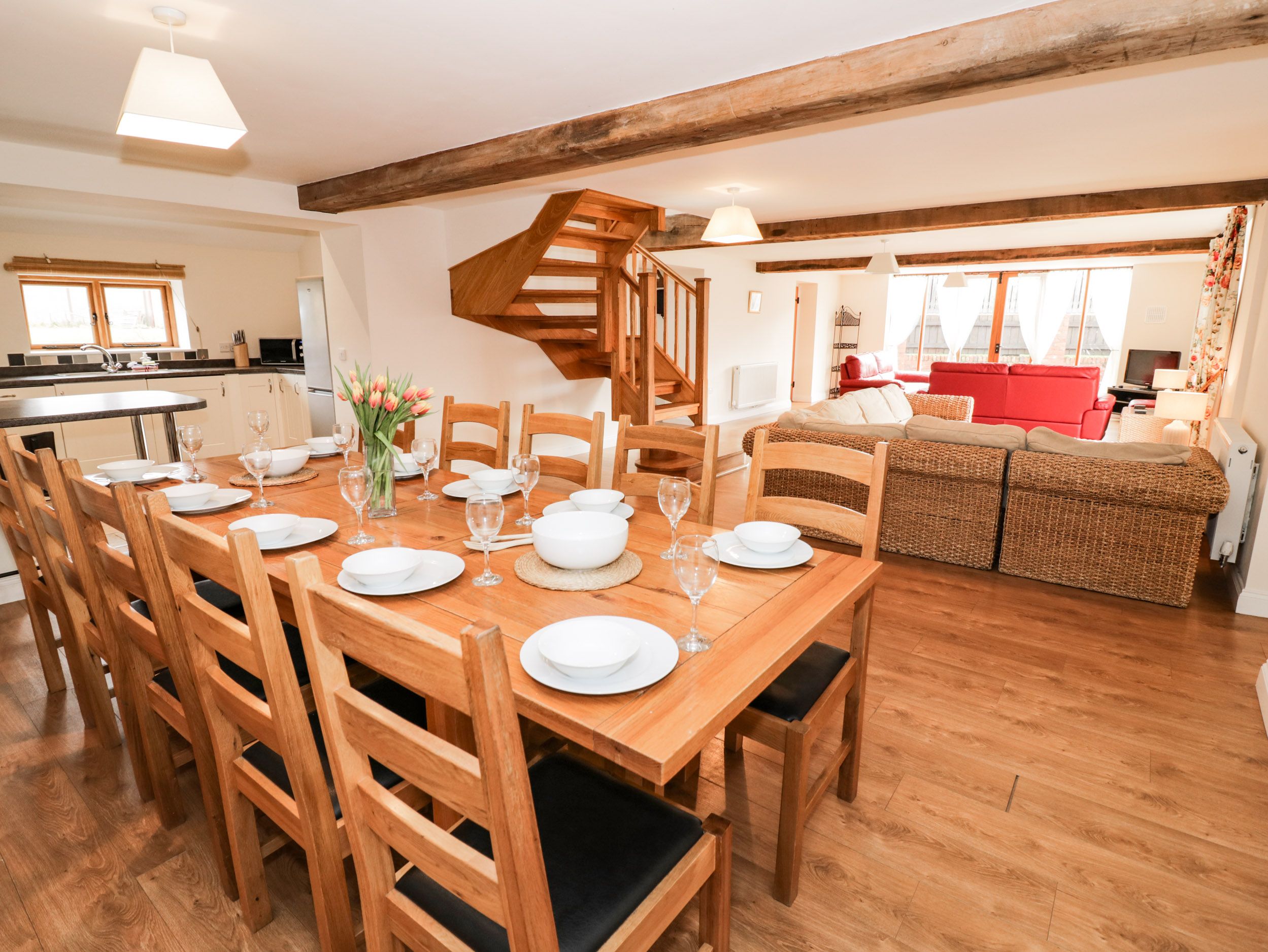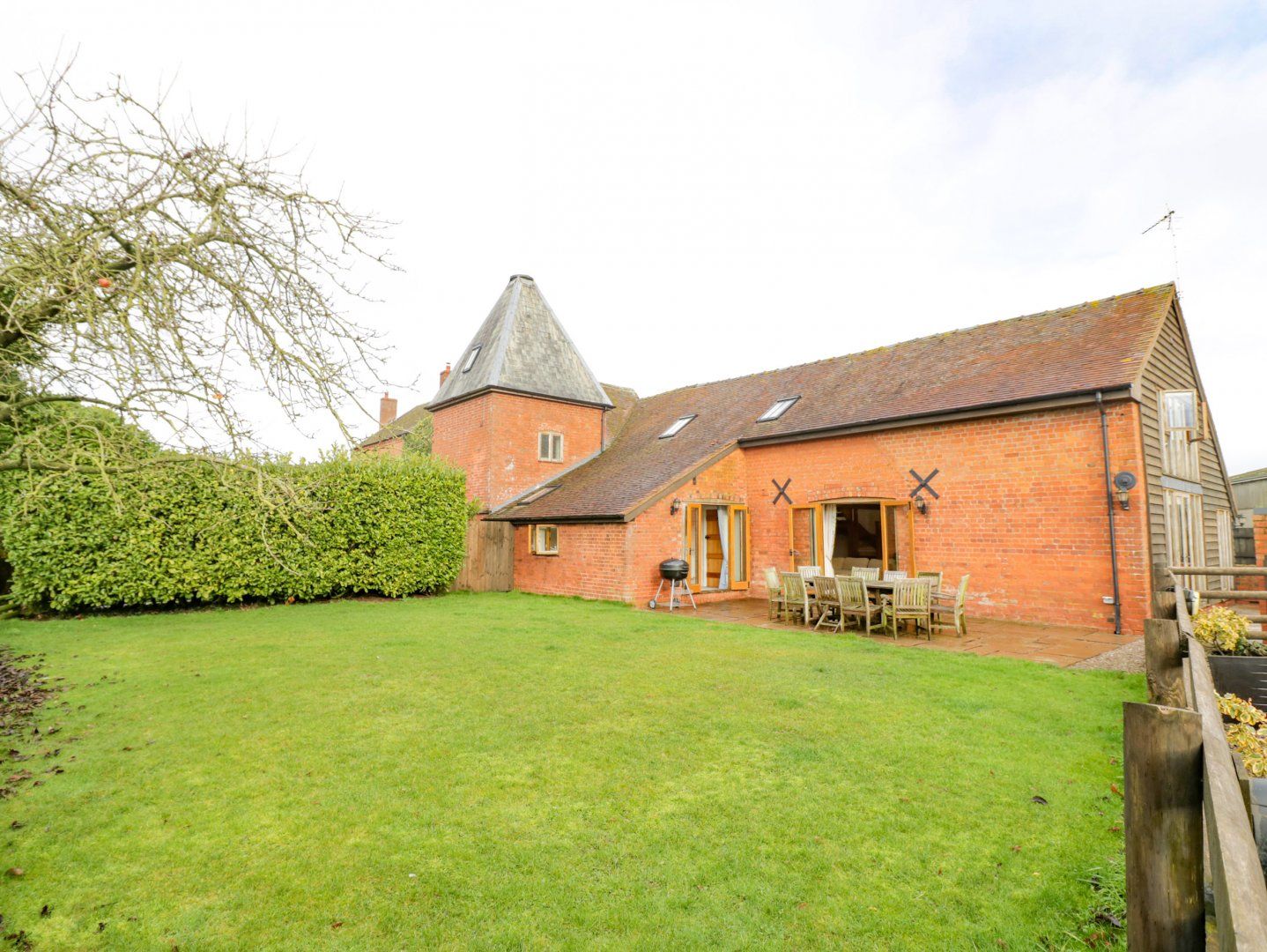 Holiday home The Wainhouse is a delightful barn conversion, situated on the grounds of the owner's working farm, in Bockleton near Tenbury Wells. The property has five bedrooms; two doubles with en-suites, two twins and a ground-floor twin with en-suite wet room, sleeping 10 guests. The property also consists of a family bathroom with bath and shower over, an open-plan living space with kitchen, dining and seating area, plus a snug. Outside, there is ample off-road parking and a large private garden with lawn, patio and furniture and a barbecue. The Wainhouse is a wonderful retreat for a group of family or friends in Worcestershire.
