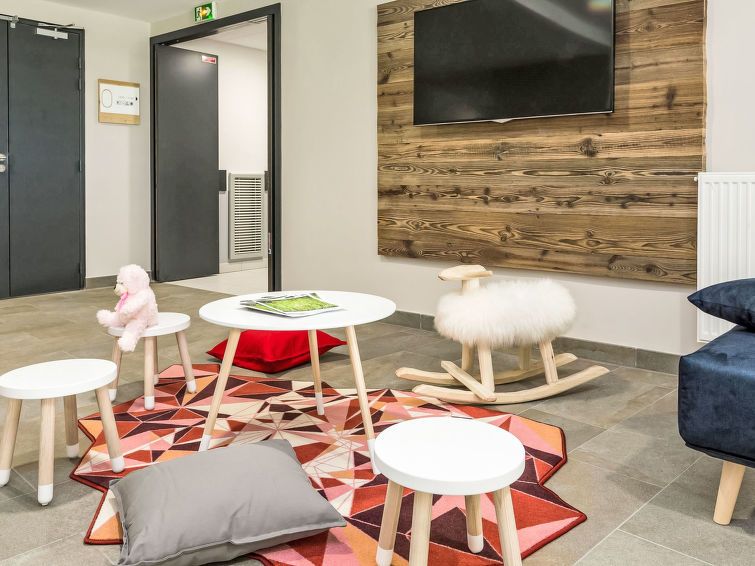 "Résidence Odalys Collection Isatis", 2-room apartment 40 m2. Modern furnishings: living/sleeping room with 1 bed, 2 pull-out beds and TV (flat screen). Exit to the balcony. 1 room with 1 french bed (140 cm, length 190 cm). Kitchenette (dishwasher, 2 ceramic glass hob hotplates, kettle, electric coffee machine, combination microwave) with dining table.