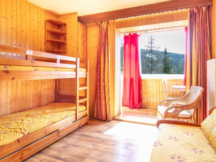 "Hippocampe", 2-room apartment 42 m2 on 2nd floor. Object suitable for 6 adults. 1 room with 1 x 2 bunk beds, TV. Living room with 2 sofabeds and 1 pull-out bed. Open kitchen (4 hot plates, oven, dishwasher, toaster, kettle, microwave, electric coffee machine). Bath/WC. Balcony. View of the mountains and the ski run.