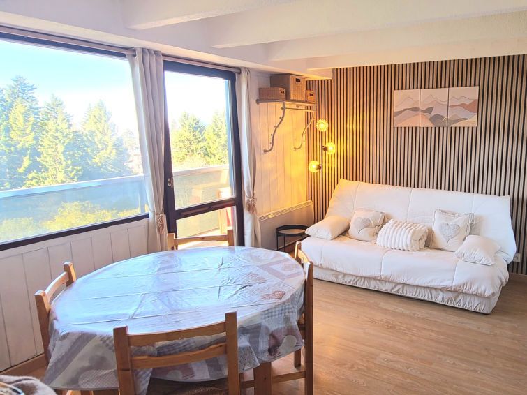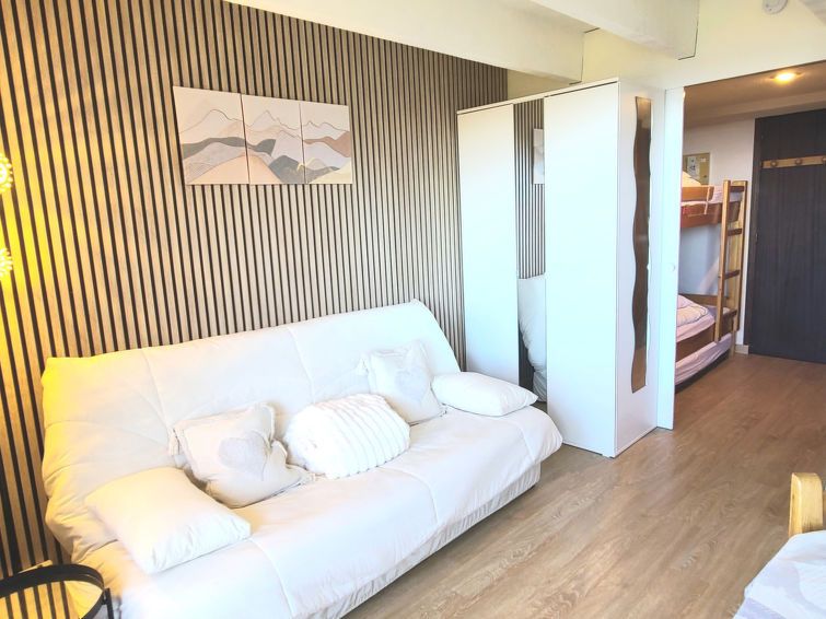 "Le Vernon N 406 - ST5", 1-room studio 24 m2 on 4th floor. Object suitable for 5 adults. Living room with 1 bed, 1 sofabed and 1 x 2 bunk beds, 1 pull-out bed and TV. Open kitchen (2 hot plates, oven, dishwasher, kettle, microwave, electric coffee machine). Bath/WC. Balcony. View of the mountains and the ski run.