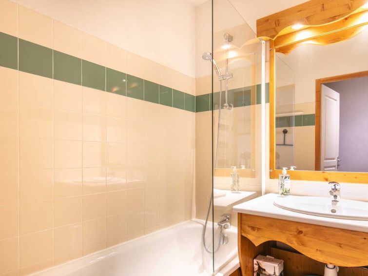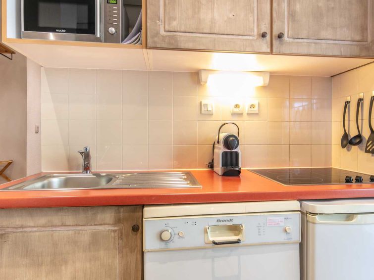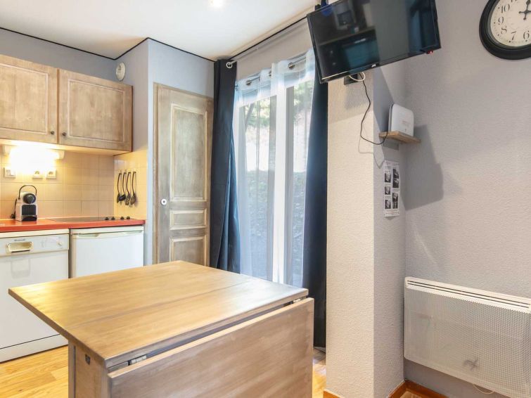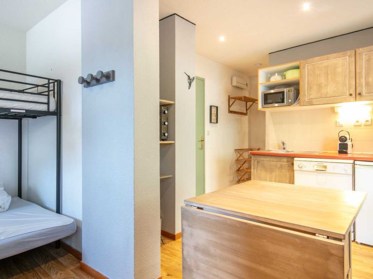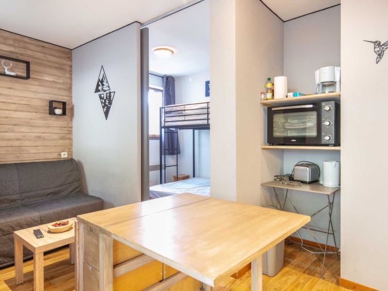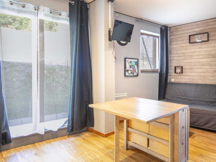"V du Bachat Melezes E", 2-room apartment 30 m2, on the ground floor. Object suitable for 5 adults. 1 room with 1 x 2 bunk beds, 1 double bed and TV. Living room with 1 sofabed and 1 pull-out bed. Open kitchen (4 hot plates, oven, dishwasher, toaster, kettle, microwave). Bath/WC. Terrace.