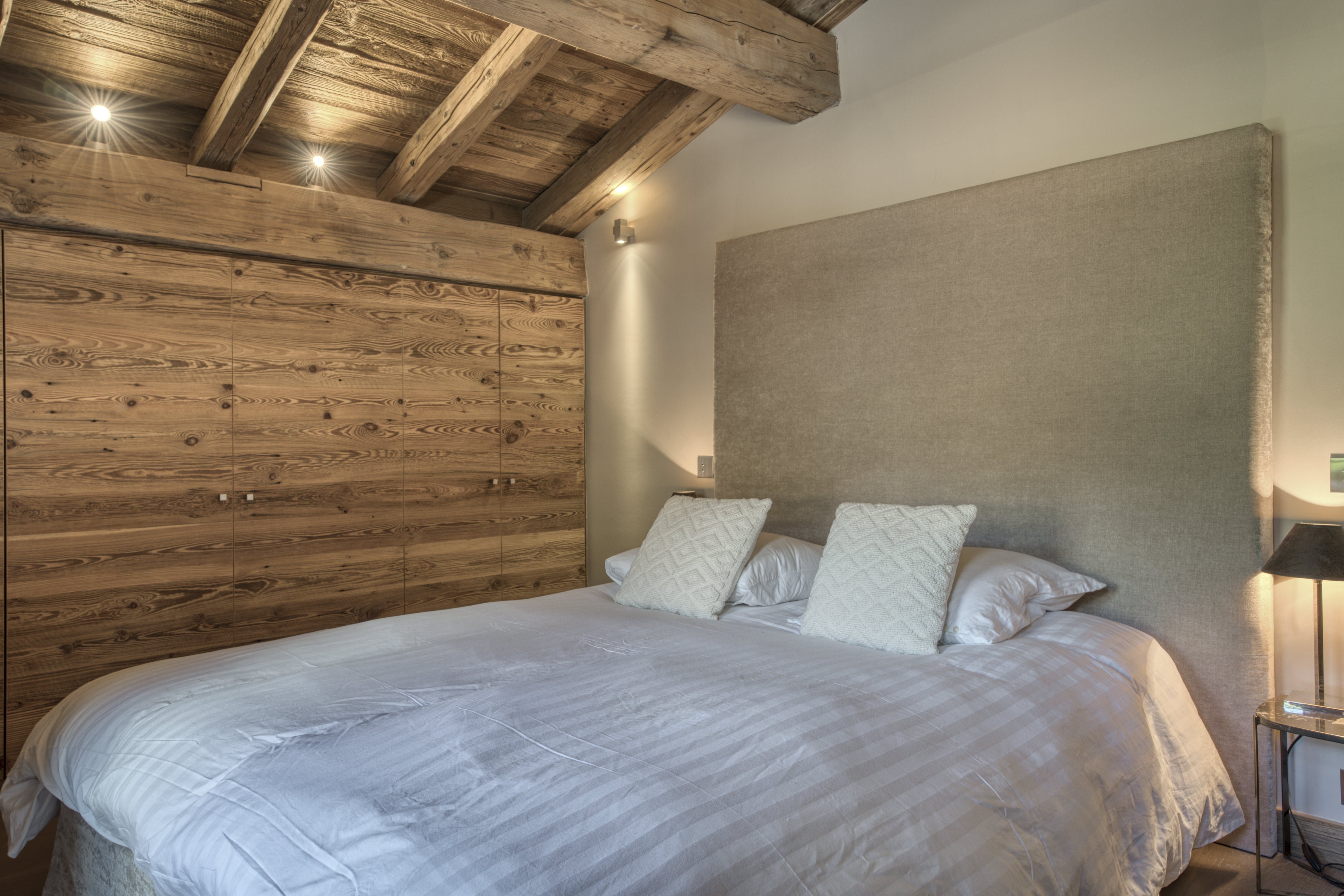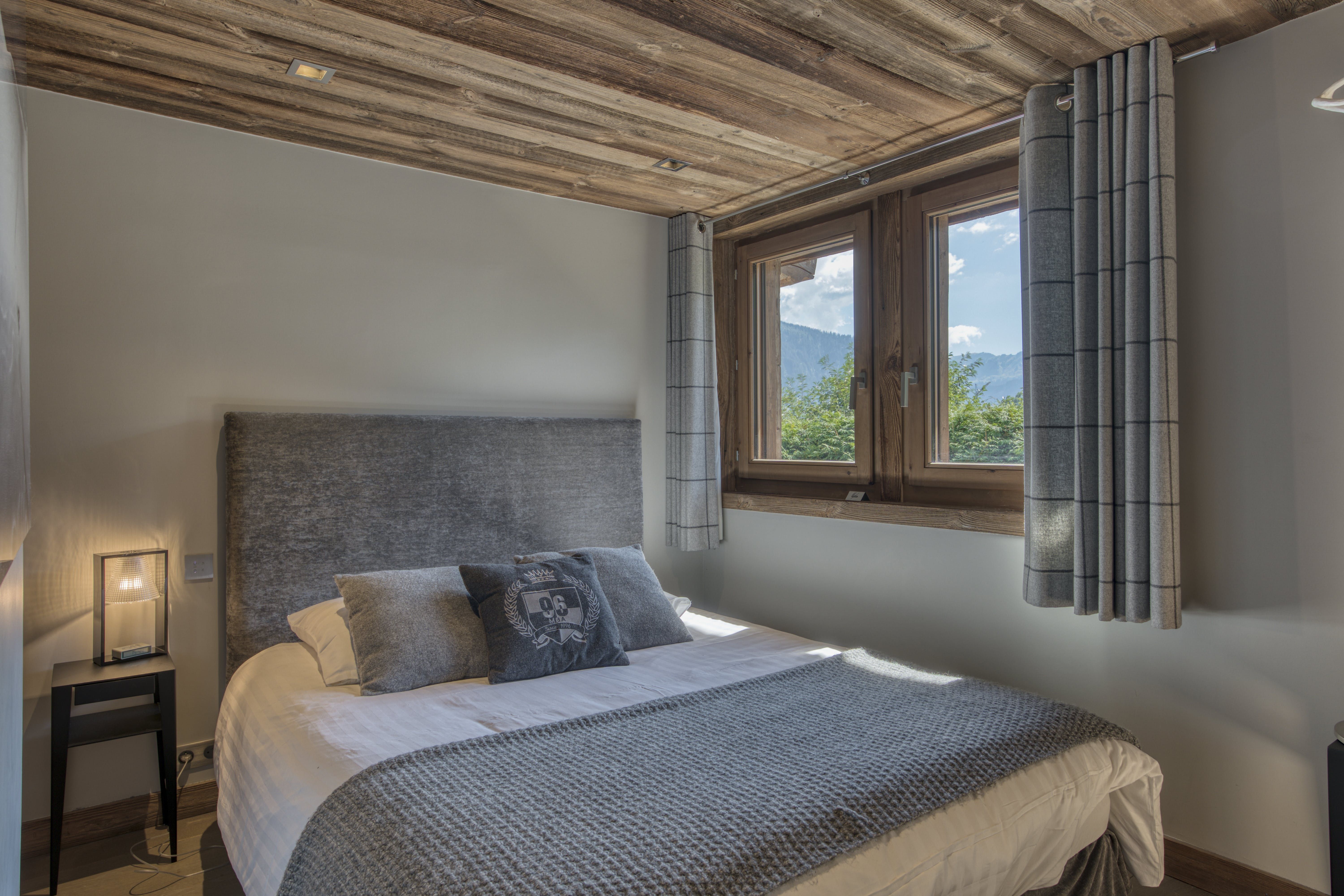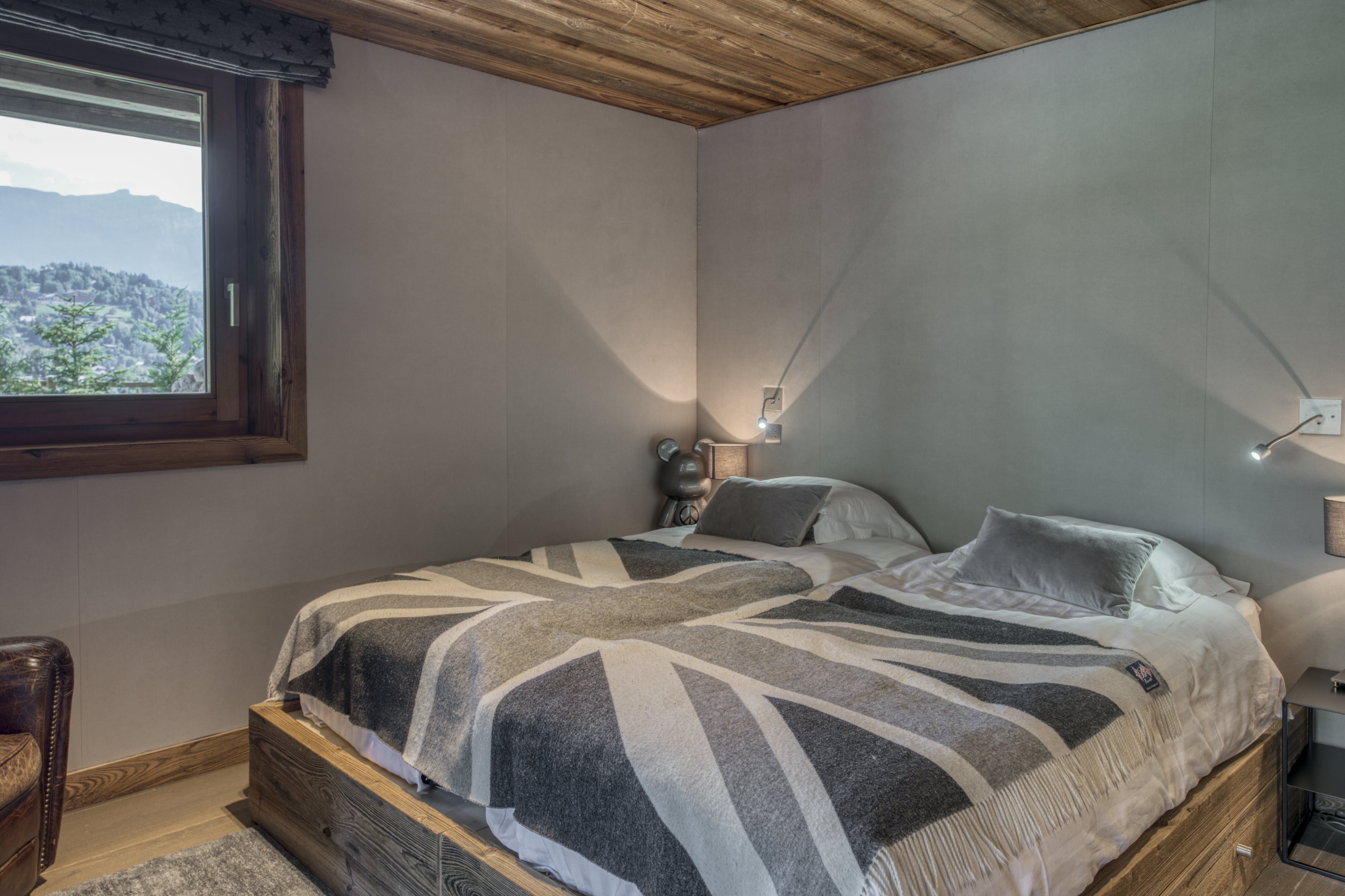 After a day on the slopes, there’s nothing better than settling in front of the fire in the grand lounge, perhaps with a glass of red from the wine cellar. A wall of picture-frame windows shows off the valley view from here and there’s a banquet-sized dining table for group meals. Bedrooms in wood-clad walls and slate grey are the perfect mix of chalet-chic and modernism.