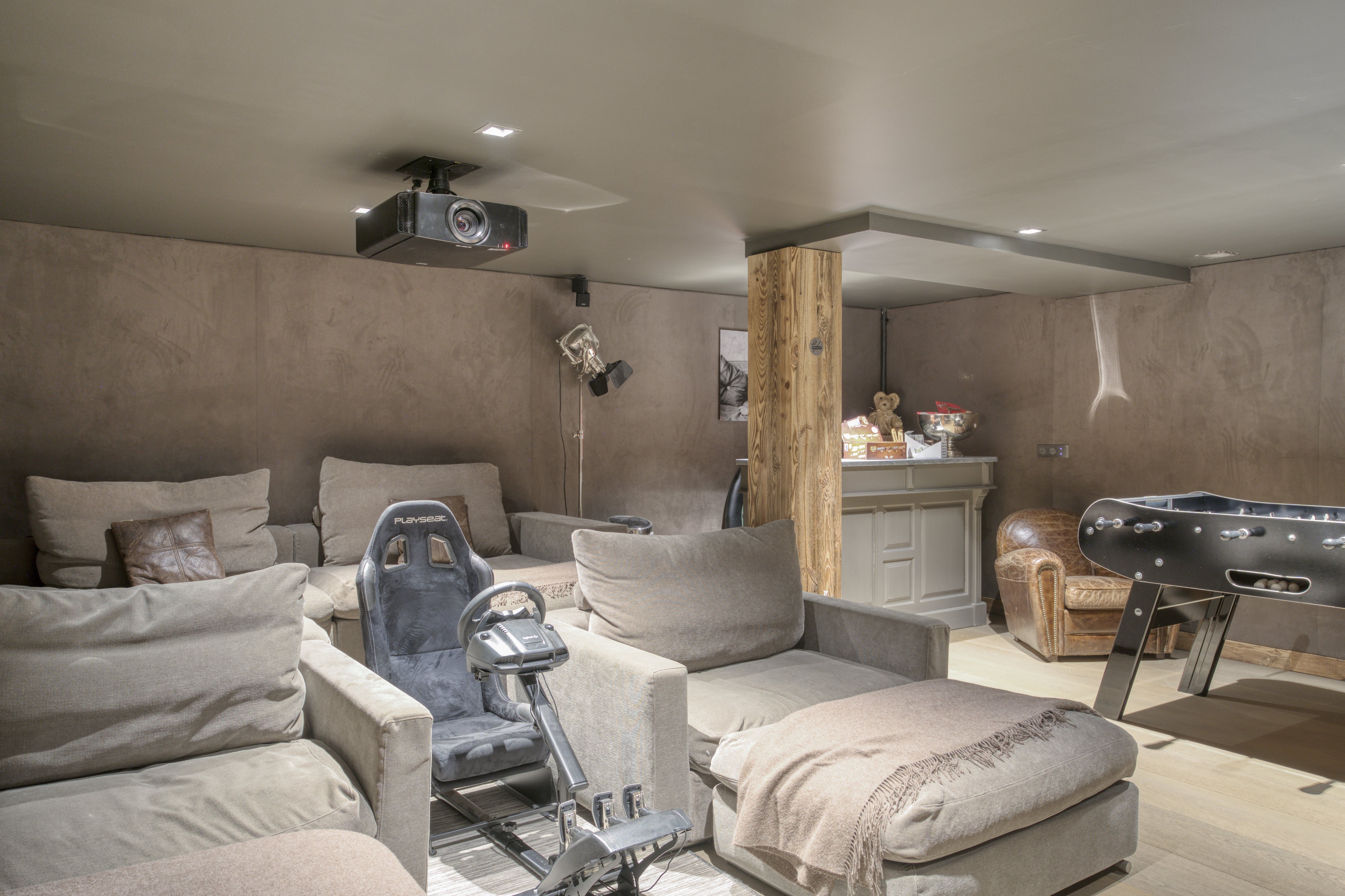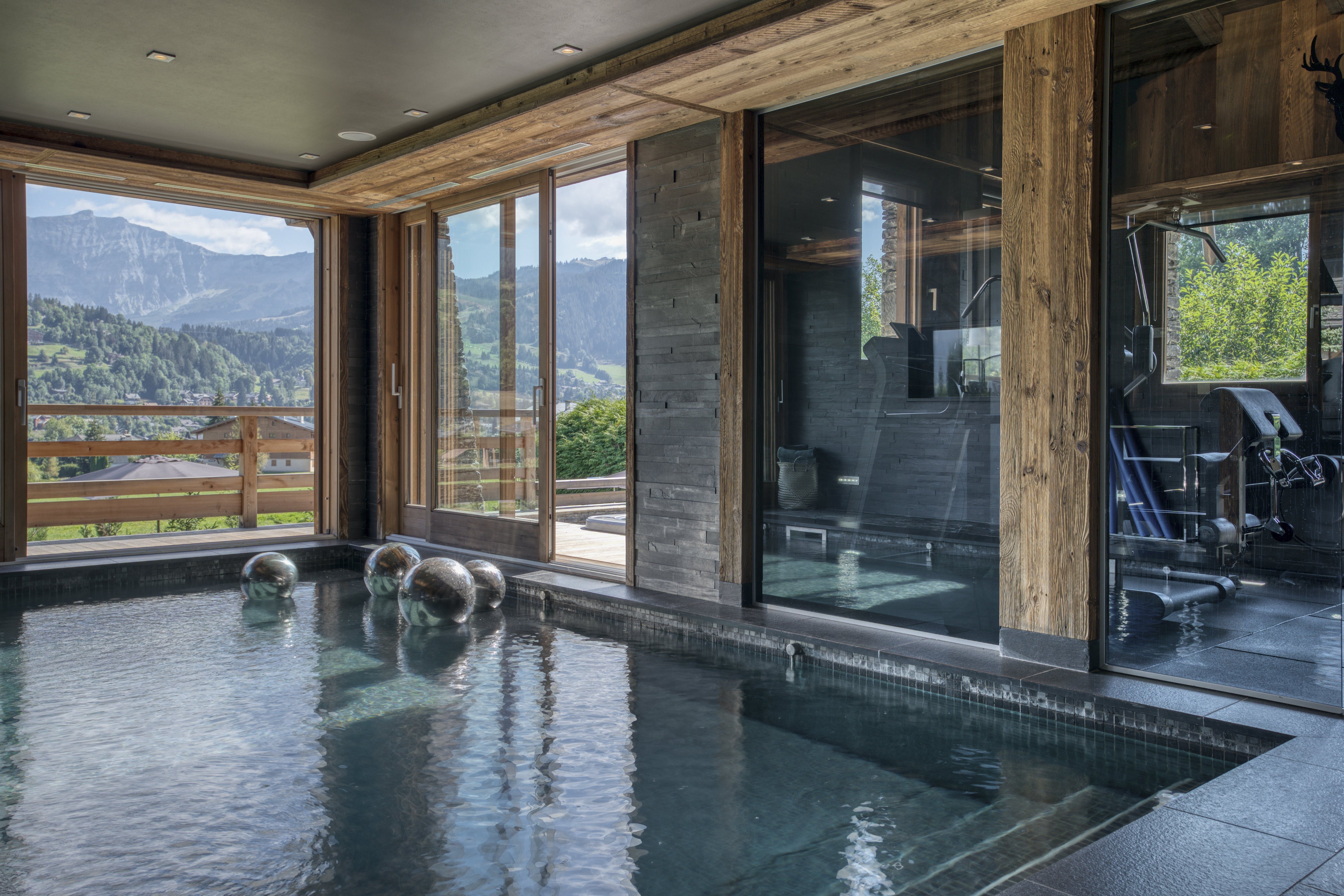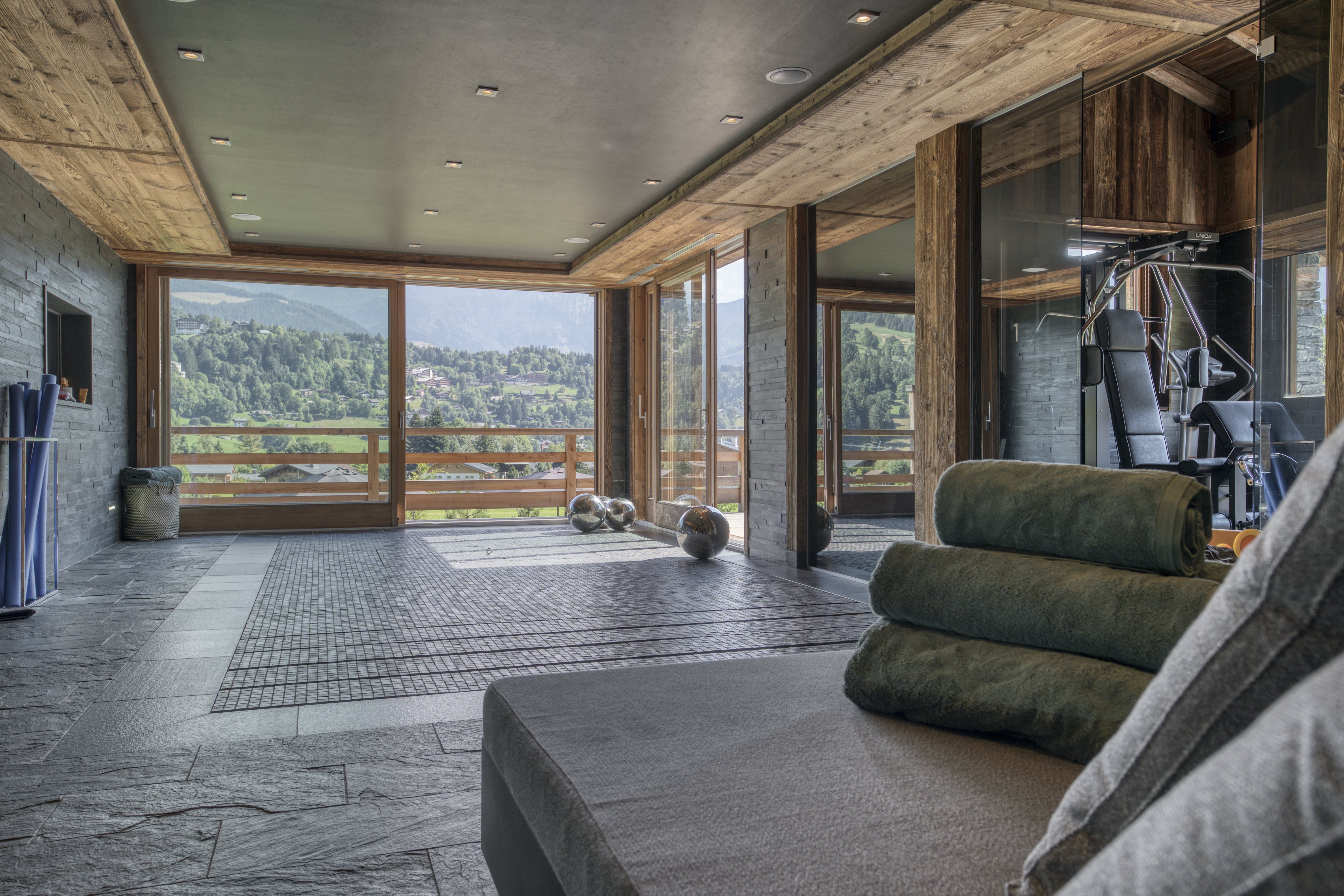 First, let’s talk about that pristine swimming pool, sitting in the Alpine-green lawn and inviting you for a dip in the summer months. Myriad balconies and terraces house outdoor lounges and dining tables with mountain views. In the winter months, a second, indoor pool has you covered. There’s a fully-equipped gym inside too, and a sauna, steam room and massage room for unwinding. If kicking back and having fun is more your thing, the games and movie room has you covered with foosball and a home-cinema set-up.