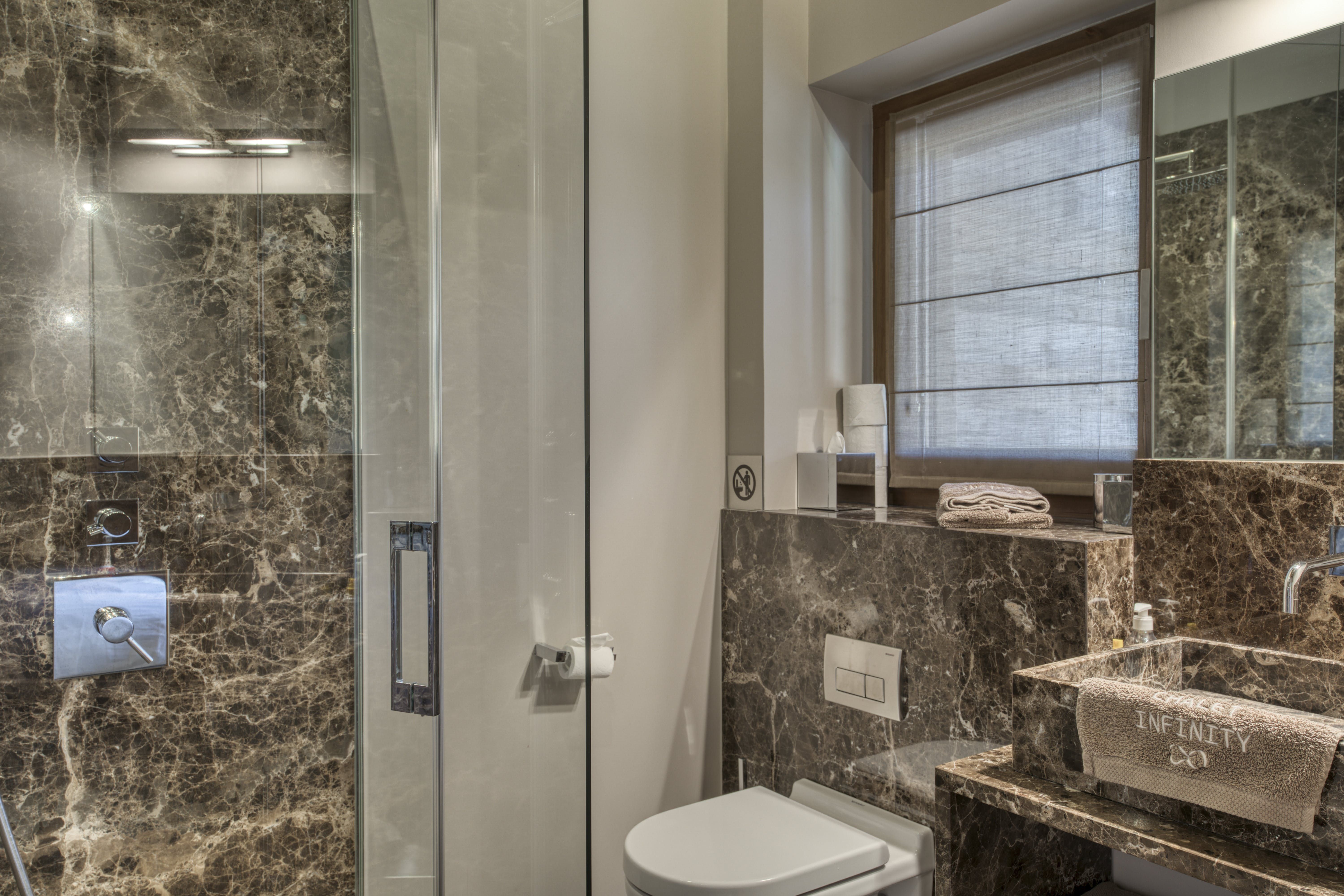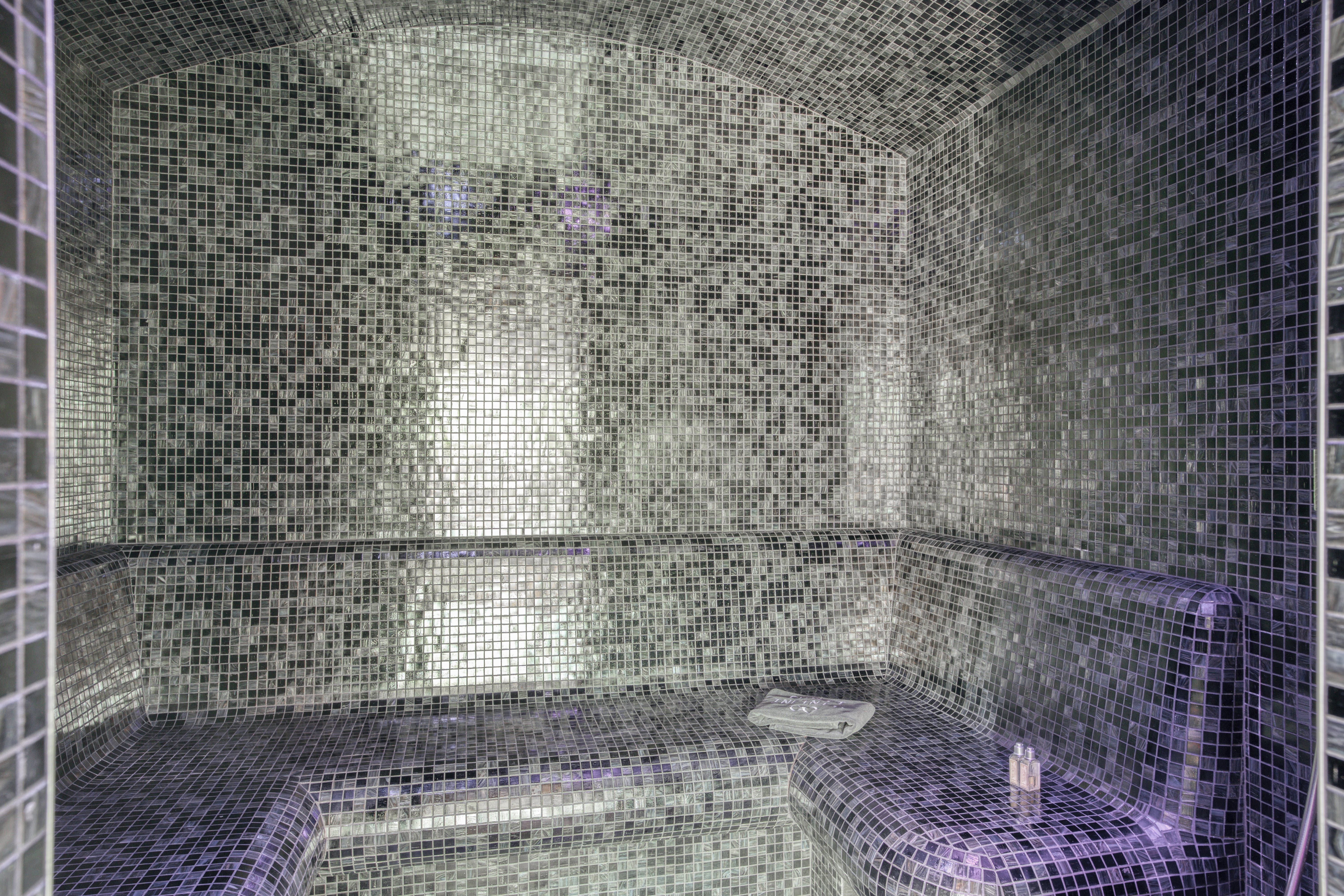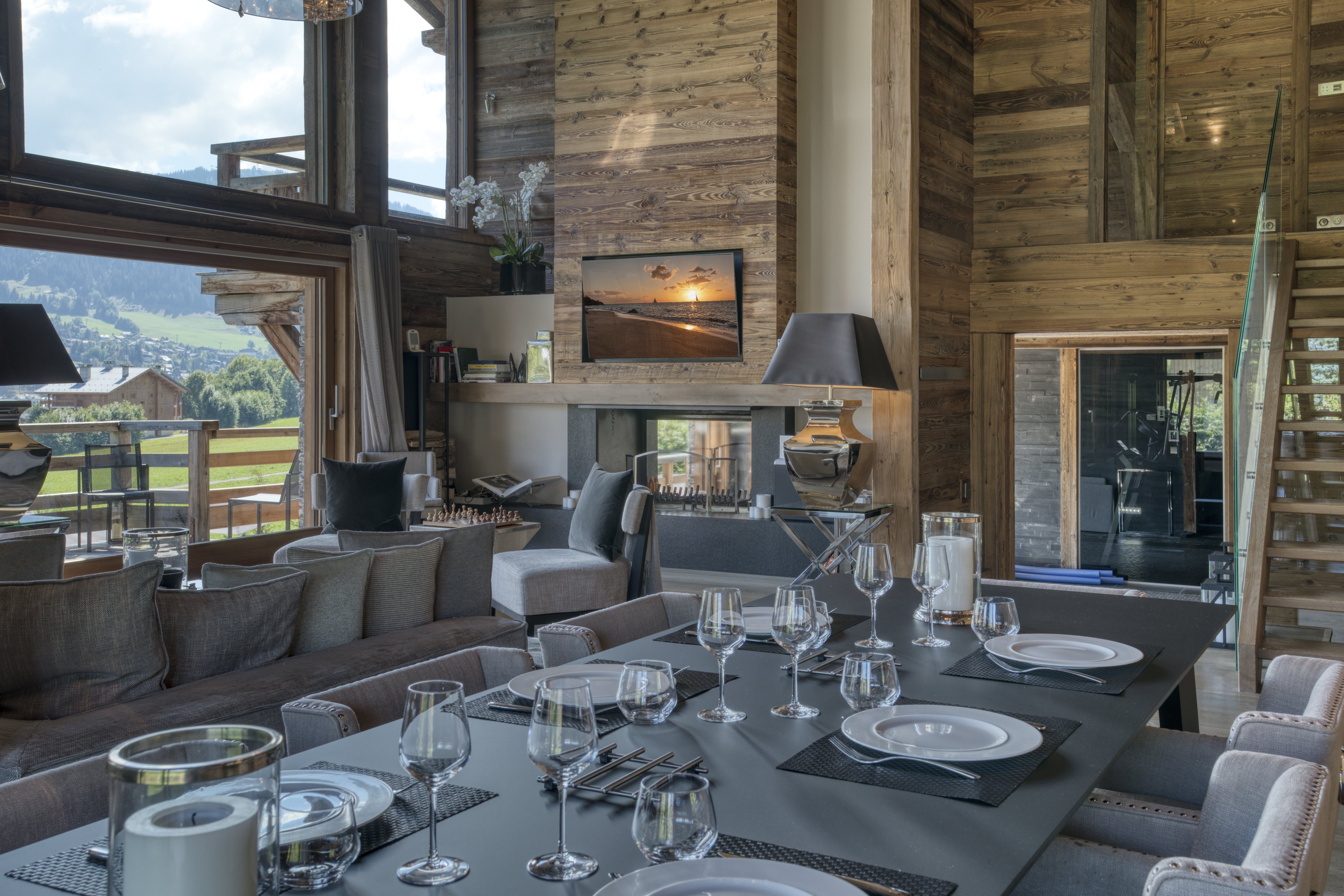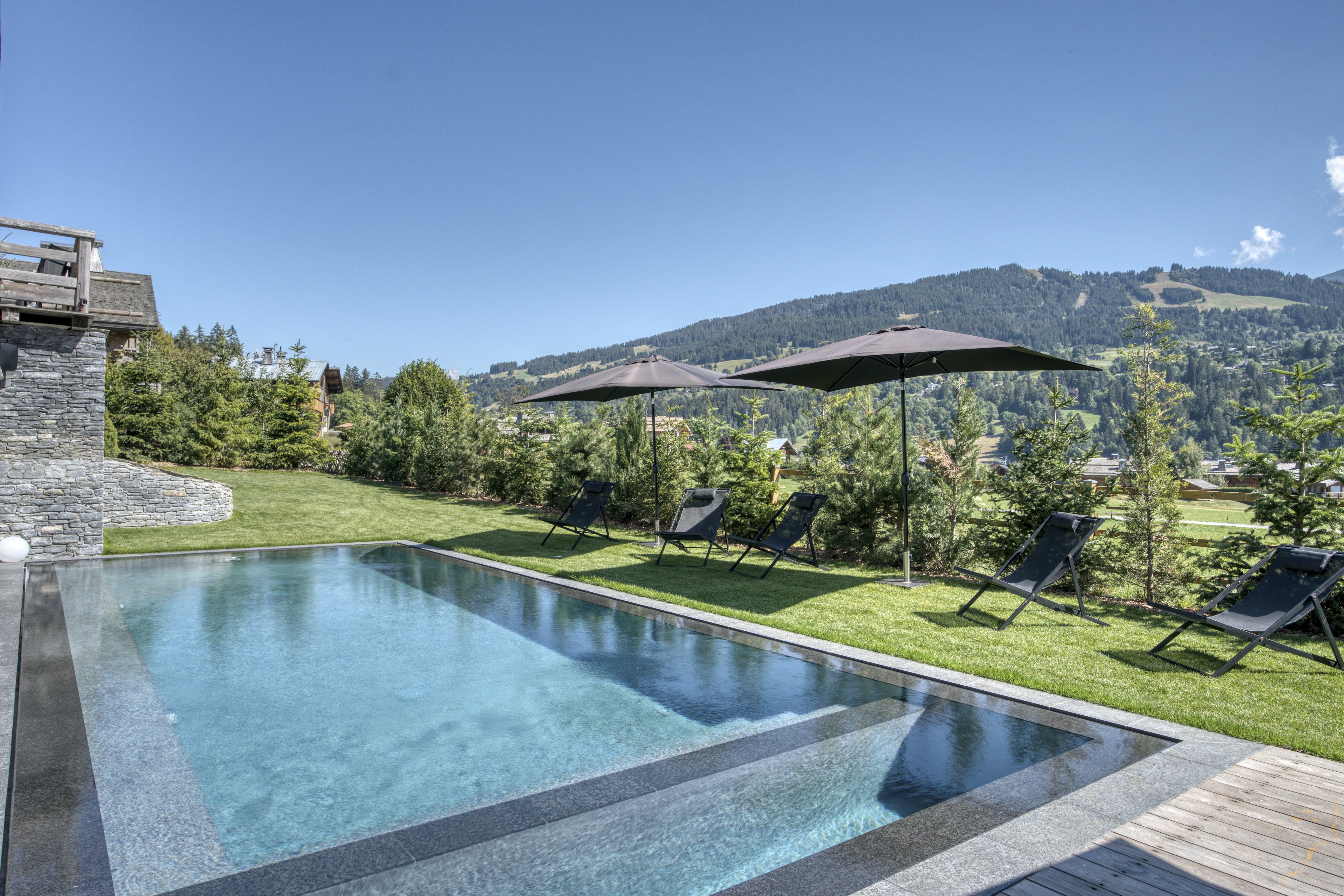 First, let’s talk about that pristine swimming pool, sitting in the Alpine-green lawn and inviting you for a dip in the summer months. Myriad balconies and terraces house outdoor lounges and dining tables with mountain views. In the winter months, a second, indoor pool has you covered. There’s a fully-equipped gym inside too, and a sauna, steam room and massage room for unwinding. If kicking back and having fun is more your thing, the games and movie room has you covered with foosball and a home-cinema set-up.