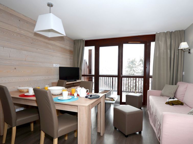 "Résidence Odalys Référence Le Panoramic", 2-room apartment 34 m2. Modern and stylish furnishings: living/sleeping room with 2 sleeping facilities, dining table and TV. Exit to the balcony. 1 room with 1 french bed. Small, open kitchen (dishwasher, 2 ceramic glass hob hotplates, toaster, kettle, microwave, electric coffee machine).
