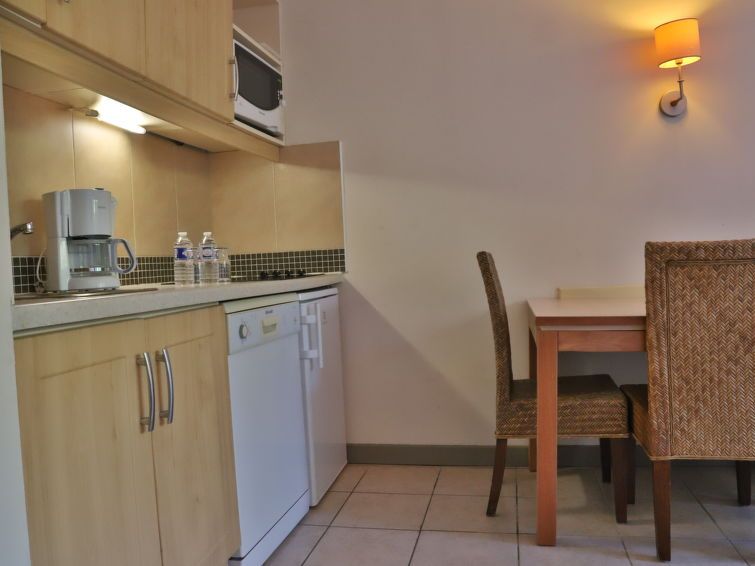 "Le Vallon", 1-room studio 30 m2. Simple furnishings: living/sleeping room with 2 beds (90 cm, length 190 cm), 1 folding bed (90 cm, length 190 cm), dining table and TV (flat screen). Exit to the balcony, to the terrace. Kitchenette (dishwasher, 2 ceramic glass hob hotplates, toaster, kettle, microwave).