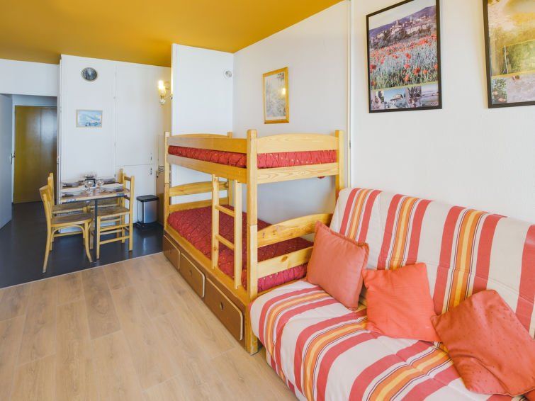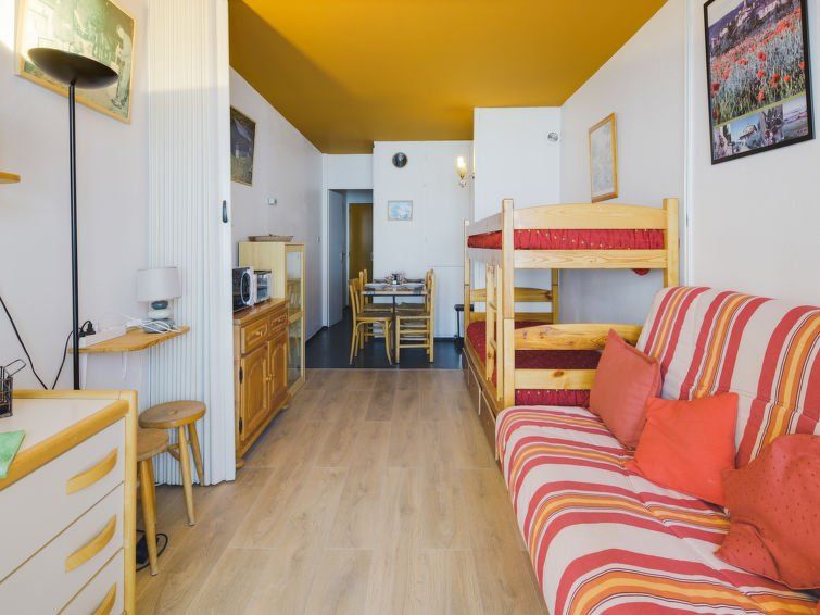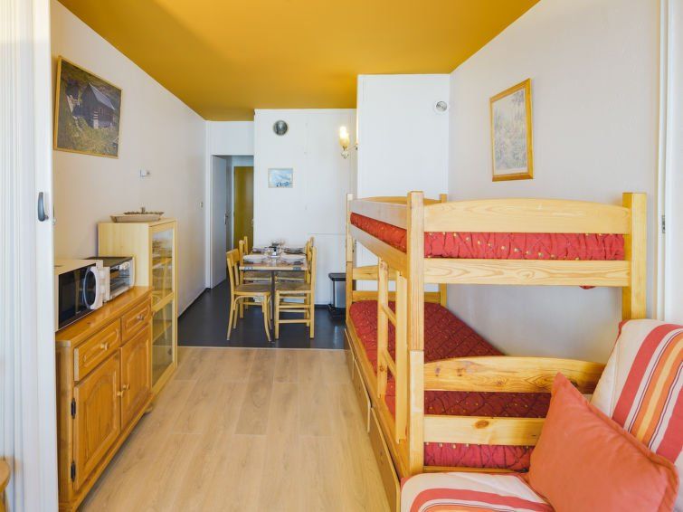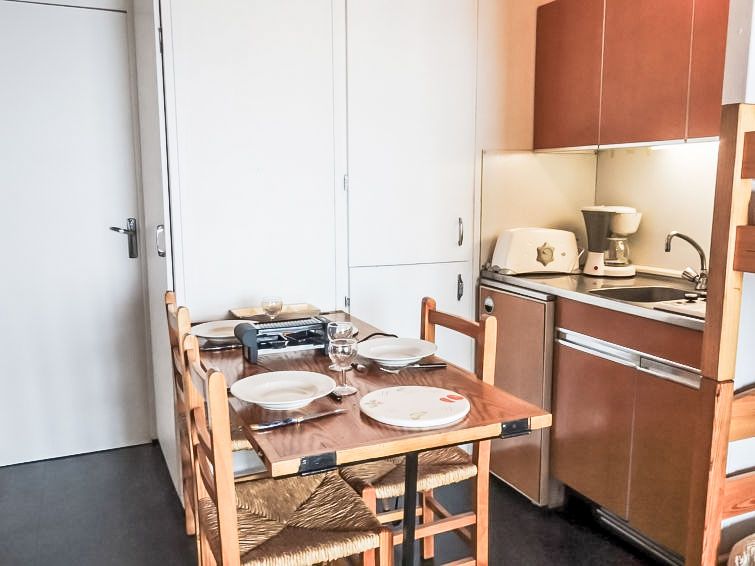 1-room studio 23 m2 on 5th floor, south facing position. Simple furnishings: living/sleeping room with 1 double sofabed (130 cm, length 190 cm), 1 x 2 bunk beds (80 cm, length 190 cm), TV (flat screen), hi-fi system. Exit to the balcony. Kitchenette (2 hot plates, mini-oven, toaster, kettle, microwave, electric coffee machine, raclette grill, fondue Set (cheese)).