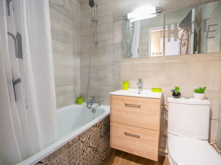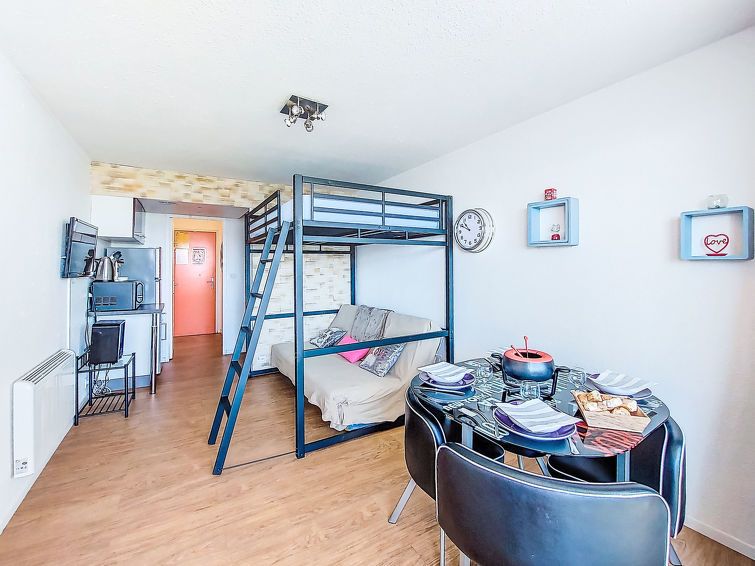1-room studio 22 m2 on 16th floor, north facing position. Beautiful furnishings: living/dining room with 1 double sofabed (140 cm, length 190 cm), 1 x 1 bunk beds (140 cm, length 190 cm), TV (flat screen), hi-fi system. Exit to the balcony, north facing position. Kitchenette (2 ceramic glass hob hotplates, toaster, kettle, freezer, electric coffee machine, Capsules for coffee machine (Tassimo) extra, raclette grill, combination microwave, fondue Set (cheese)).