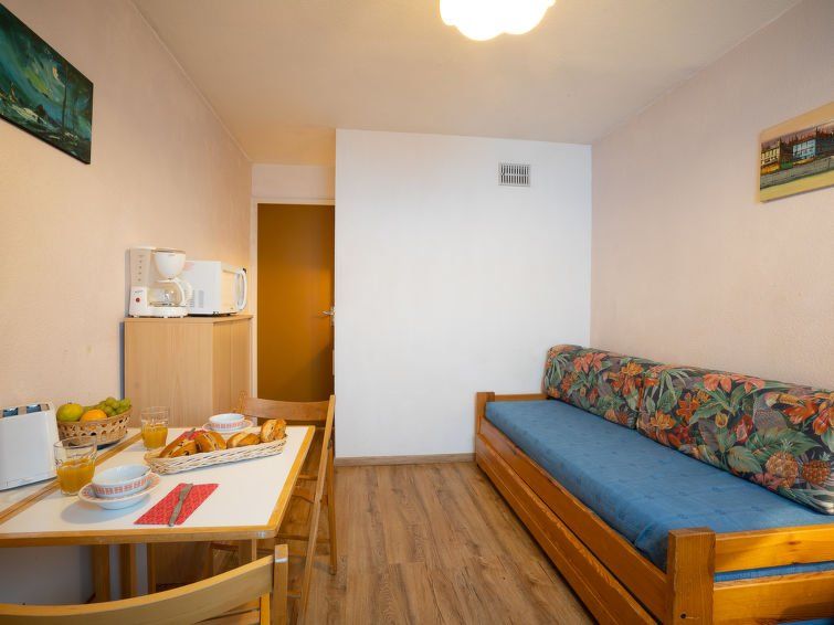 1-room studio 16 m2 on 13rd floor, north facing position. Simple furnishings: living/dining room with 1 pull-out bed (2 pers. 2 x 80 cm, length 190 cm), TV (flat screen). Kitchenette (2 hot plates, toaster, microwave, electric coffee machine). Bath/WC. Electric heating. Parquet floors.
