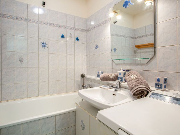 1-room apartment 32 m2 on 9th floor, south facing position. Beautiful furnishings: living/dining room with 1 double sofabed (130 cm, length 190 cm), TV (flat screen), radio and DVD. Exit to the balcony. Alcove with 1 french bed (140 cm, length 190 cm). Kitchenette (dishwasher, 2 ceramic glass hob hotplates, electric coffee machine, combination microwave) with bar.
