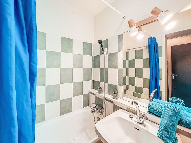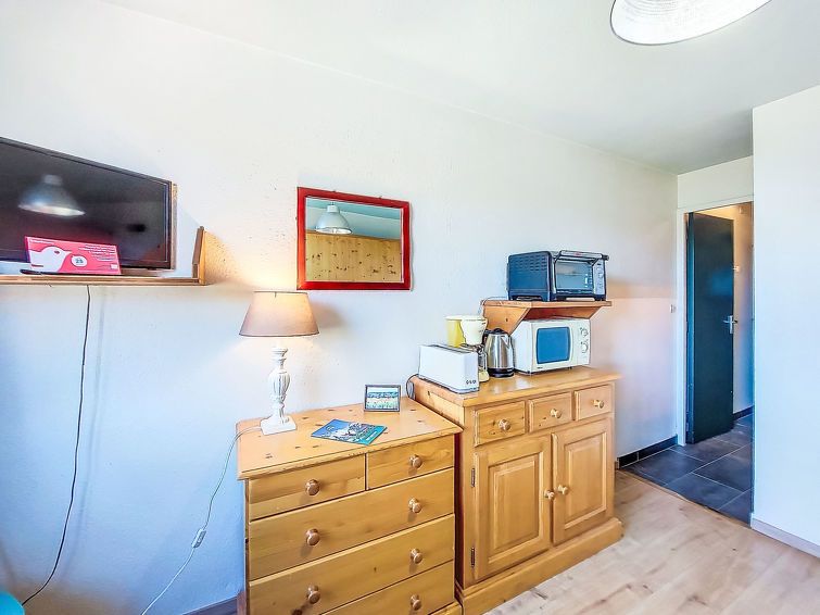 1-room studio 16 m2 on 11st floor, north facing position. Beautiful furnishings: living/dining room with 1 pull-out bed (2 pers. 2 x 80 cm, length 190 cm), TV (flat screen). Kitchenette (2 hot plates, mini-oven, kettle, microwave, electric coffee machine). Bath/WC. Electric heating.