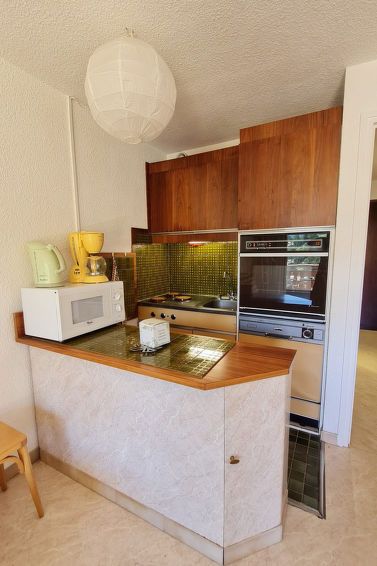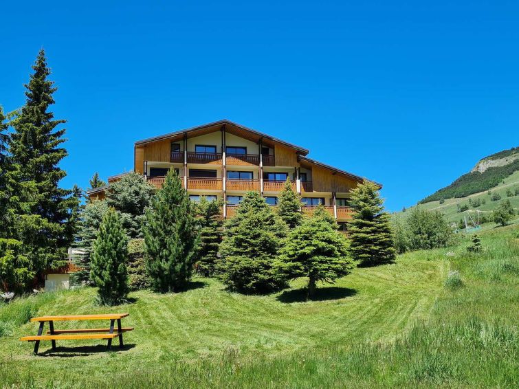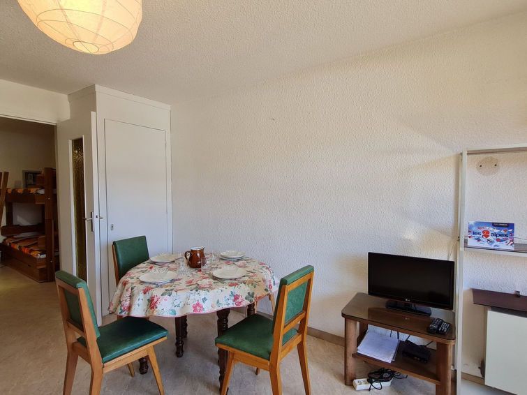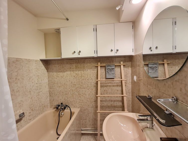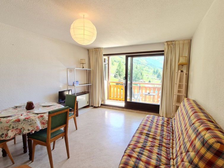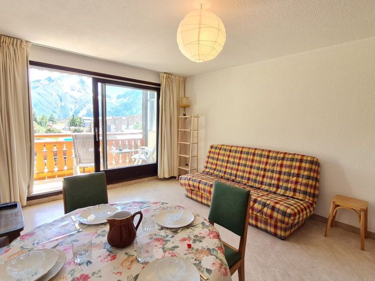 "Gioberney", 1-room studio 28 m2 on 3rd floor. Object suitable for 4 adults. Living room with 1 sofabed and 1 x 2 bunk beds, 1 pull-out bed and TV. Open kitchen (2 hot plates, oven, dishwasher, kettle, microwave, electric coffee machine). Bath/WC. Balcony. View of the mountains and the ski run.