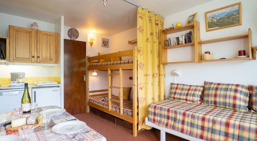 "Brelin Les Combes 807", 1-room studio 19 m2 on 8th floor, south facing position. Living/dining room with 1 double sofabed (2 x 80 cm, length 190 cm), 1 x 2 bunk beds (80 cm, length 190 cm), TV (flat screen). Exit to the balcony, south facing position. Kitchenette (oven, dishwasher, kettle, microwave, electric coffee machine).