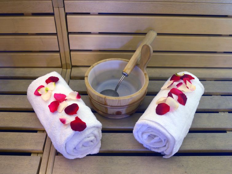 "CGH Rés&Spa Chalets du Soleil (A)", 5-room apartment 135 m2. Tasteful and wooden furniture furnishings: living/sleeping room with 1 sofabed, 1 pull-out bed, open-hearth fireplace, dining table and satellite TV. Exit to the balcony. 3 rooms, each room with 1 french bed. 1 room with 2 beds.