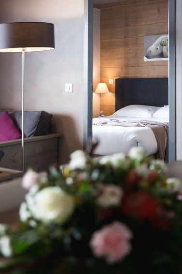 "CGH Rés&Spa Chalets du Soleil (C)", 3-room apartment 40 m2. Modern and stylish furnishings: living/sleeping room with 1 pull-out bed, dining table and satellite TV. Exit to the balcony. 1 room with 1 french bed. 1 room with 2 beds. Kitchenette (oven, dishwasher, 2 ceramic glass hob hotplates, toaster, kettle, microwave, electric coffee machine, steamer).