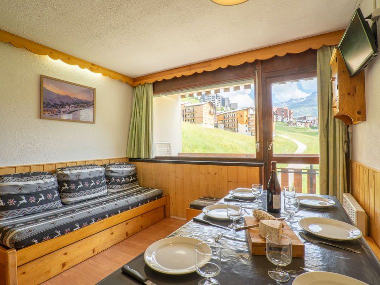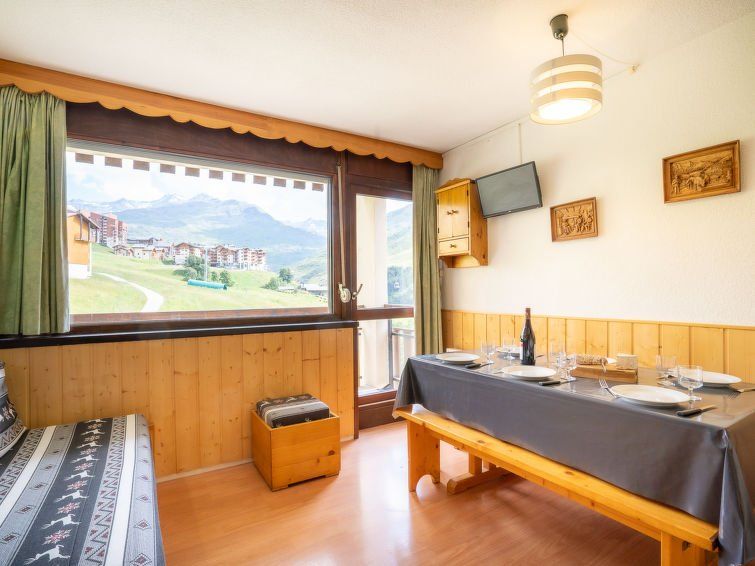 "Asters 98 Bâtiment C3", 2-room apartment 32 m2 on 1st floor. Beautiful furnishings: living/dining room with 1 pull-out bed (2 pers. 2 x 80 cm, length 190 cm), TV (flat screen). Exit to the balcony. 1 room with 1 french bed (140 cm, length 190 cm). Sleeping alcove with 1 x 2 bunk beds (70 cm, length 190 cm).