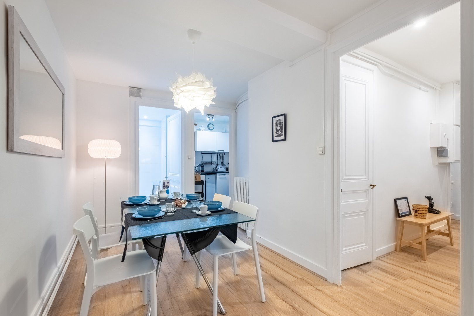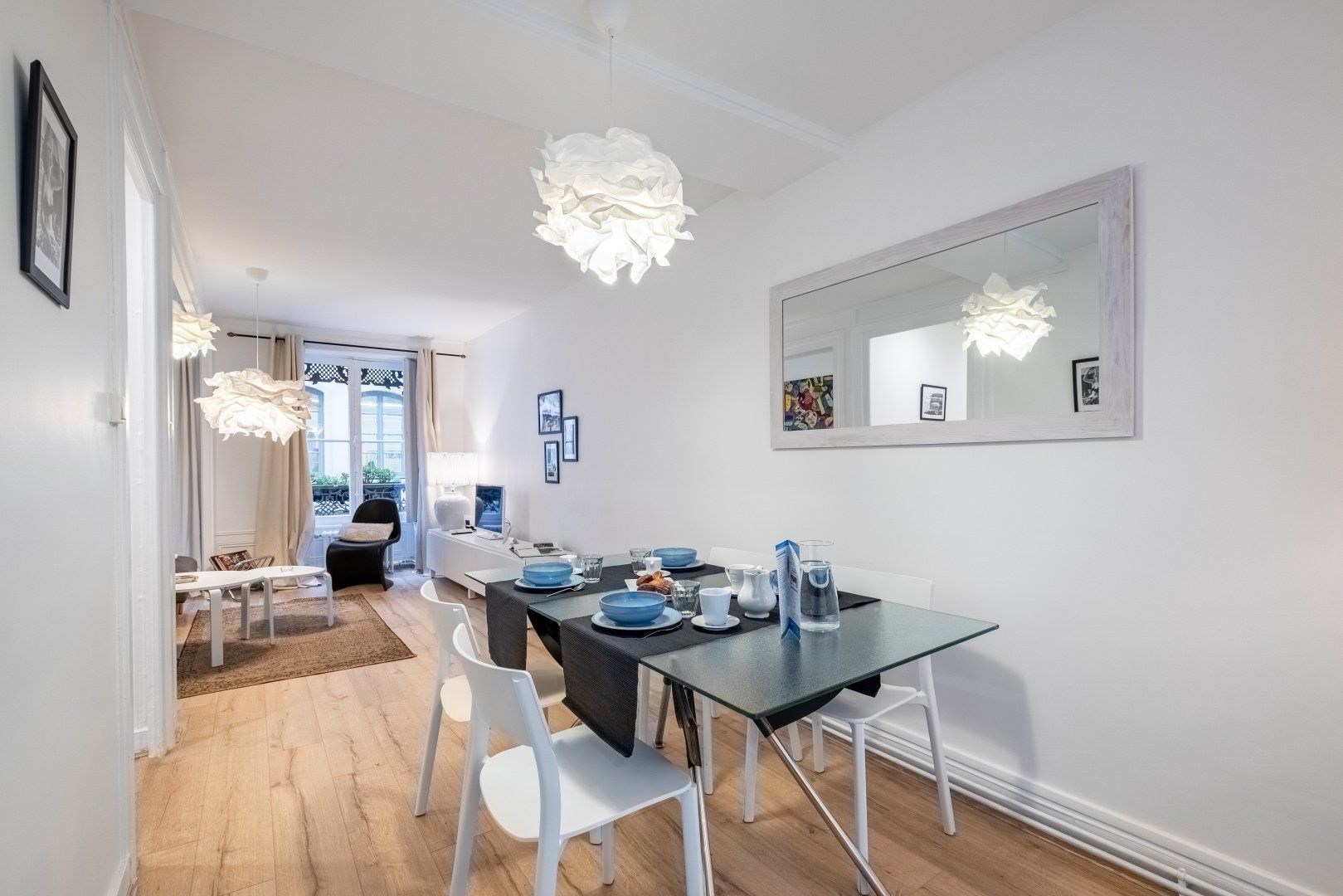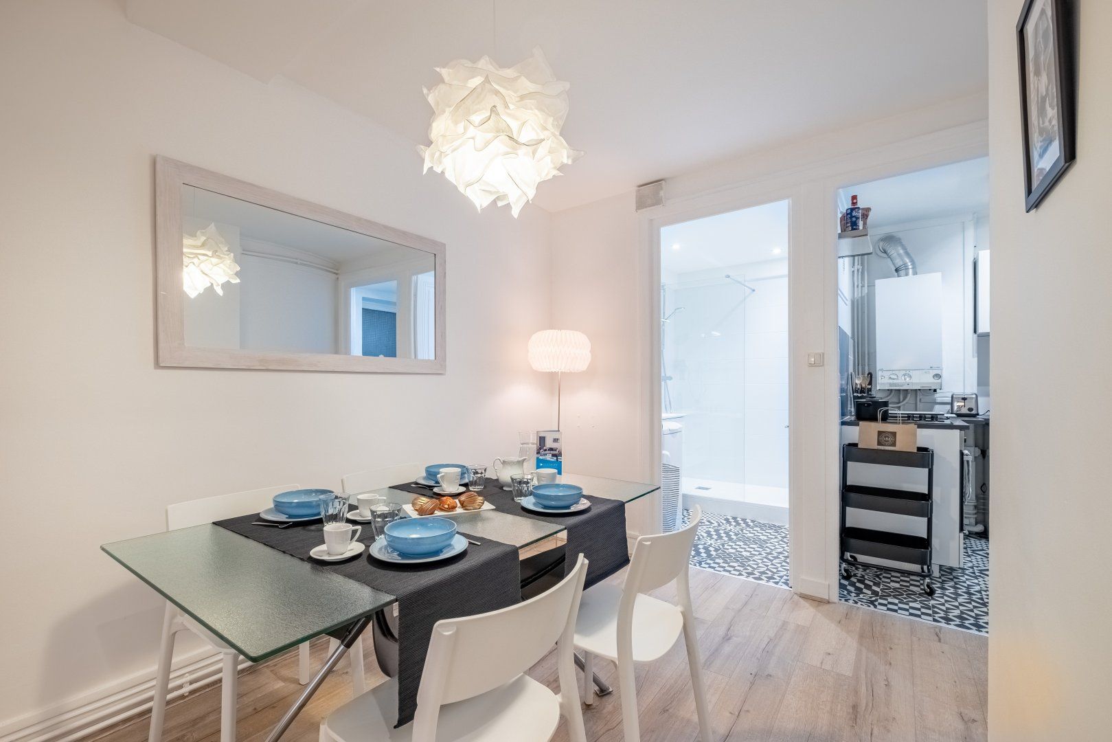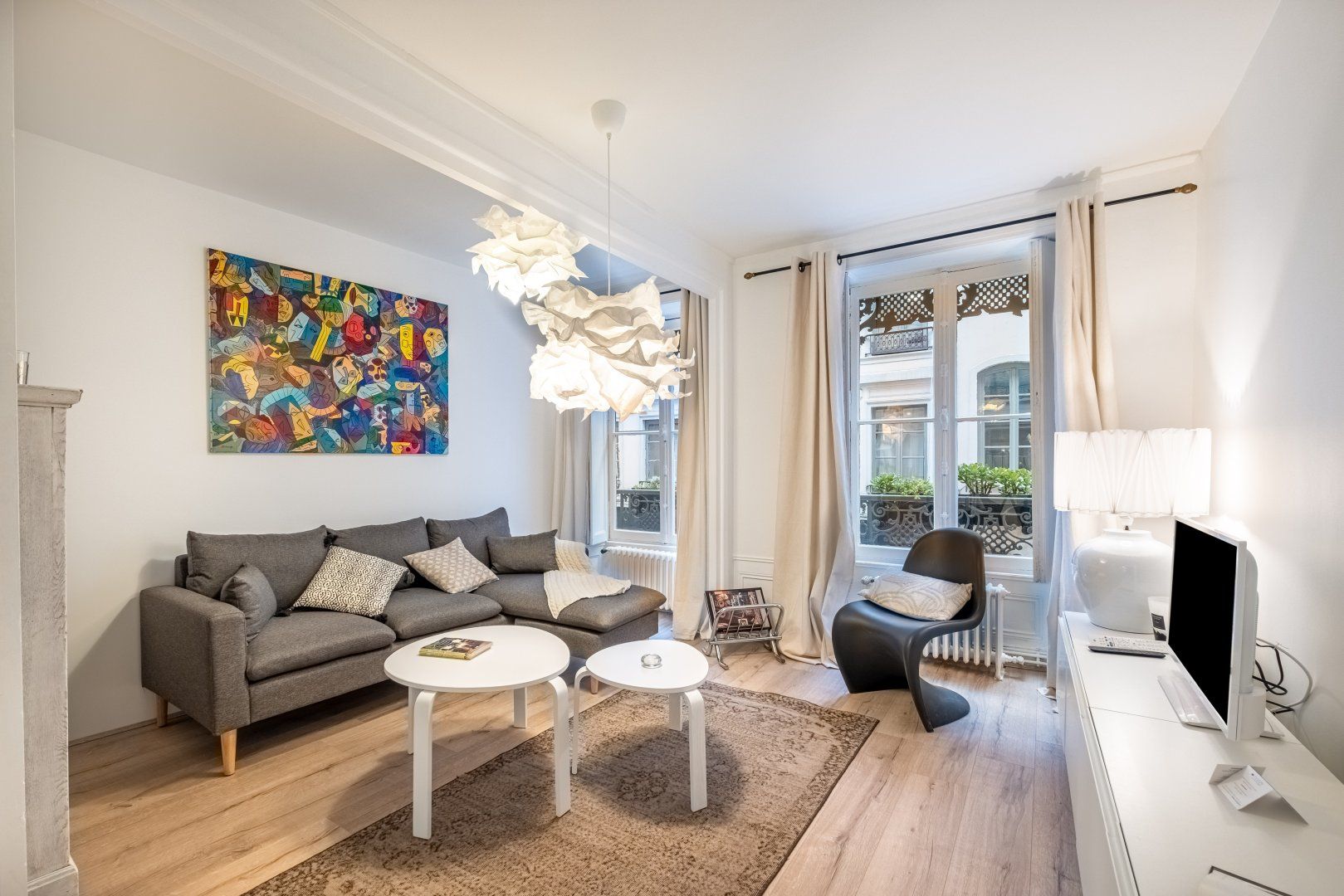This stunning apartment is floating above the lively streets of Lyon, ready to welcome you home after a day of exploring. The decor is homely yet calm with beautiful white ripple furnishings. Put your feet up on the comfortable chaise sofa and sink into the French lifestyle. With an open-plan dining and living space, it's an ideal social spot with your loved one when you return home for some rest. With towering windows and old-fashioned radiators, this apartment has a quaint feel. Close your white drapes and pour yourself a large glass of wine before climbing under your crisp white sheets, for a restful night’s sleep.