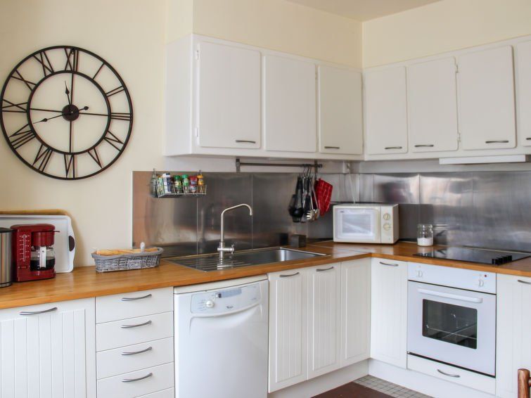 5-room house 100 m2 on 2 levels. Beautiful furnishings: living/dining room with TV (flat screen). Exit to the terrace. 1 room with 1 french bed (1 x 160 cm, length 200 cm). 1 room with 2 beds (90 cm, length 190 cm). Kitchen (oven, dishwasher, 4 ceramic glass hob hotplates, toaster, kettle, microwave, electric coffee machine, Capsules for coffee machine (Dolce Gusto) extra) with dining table.