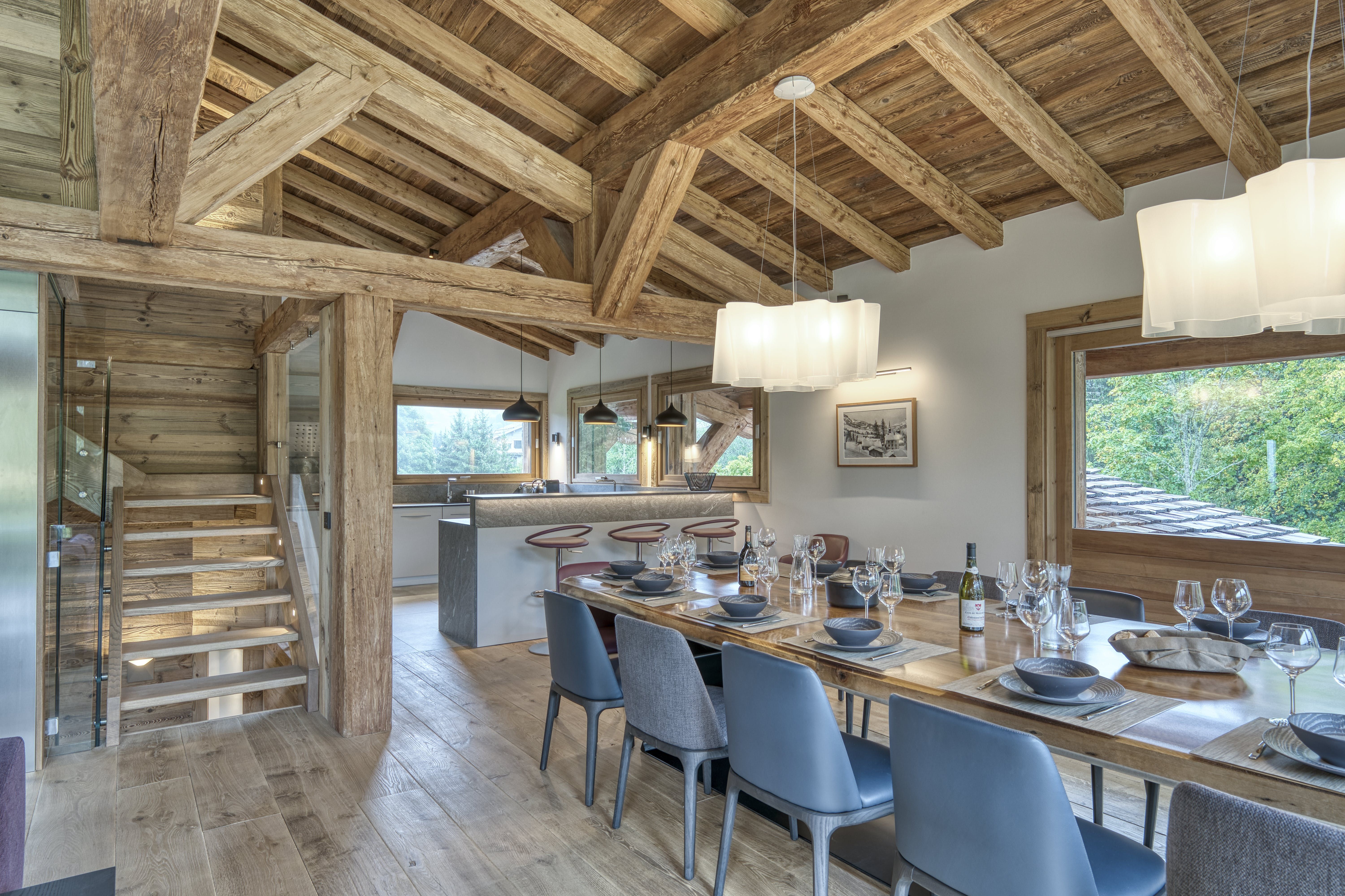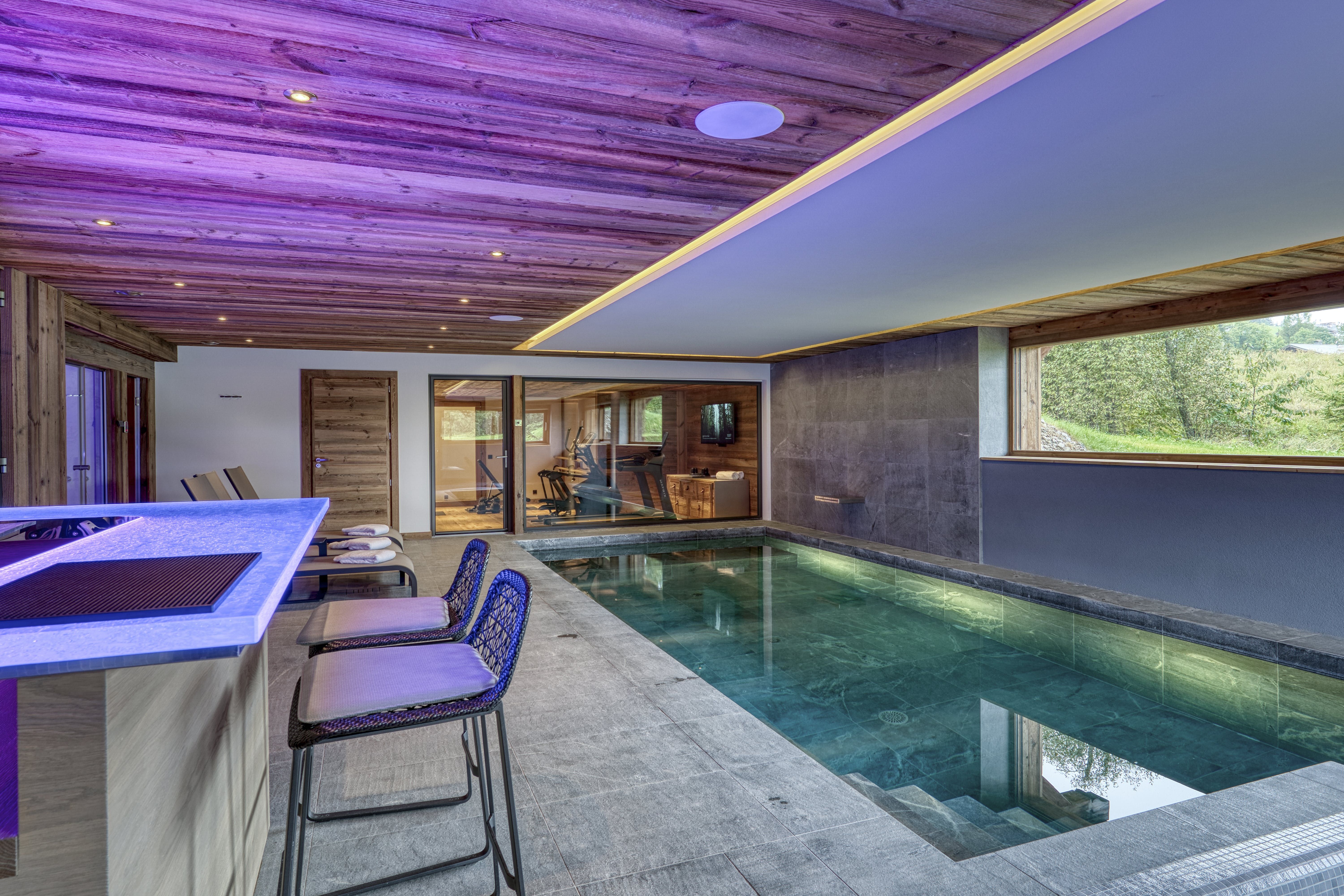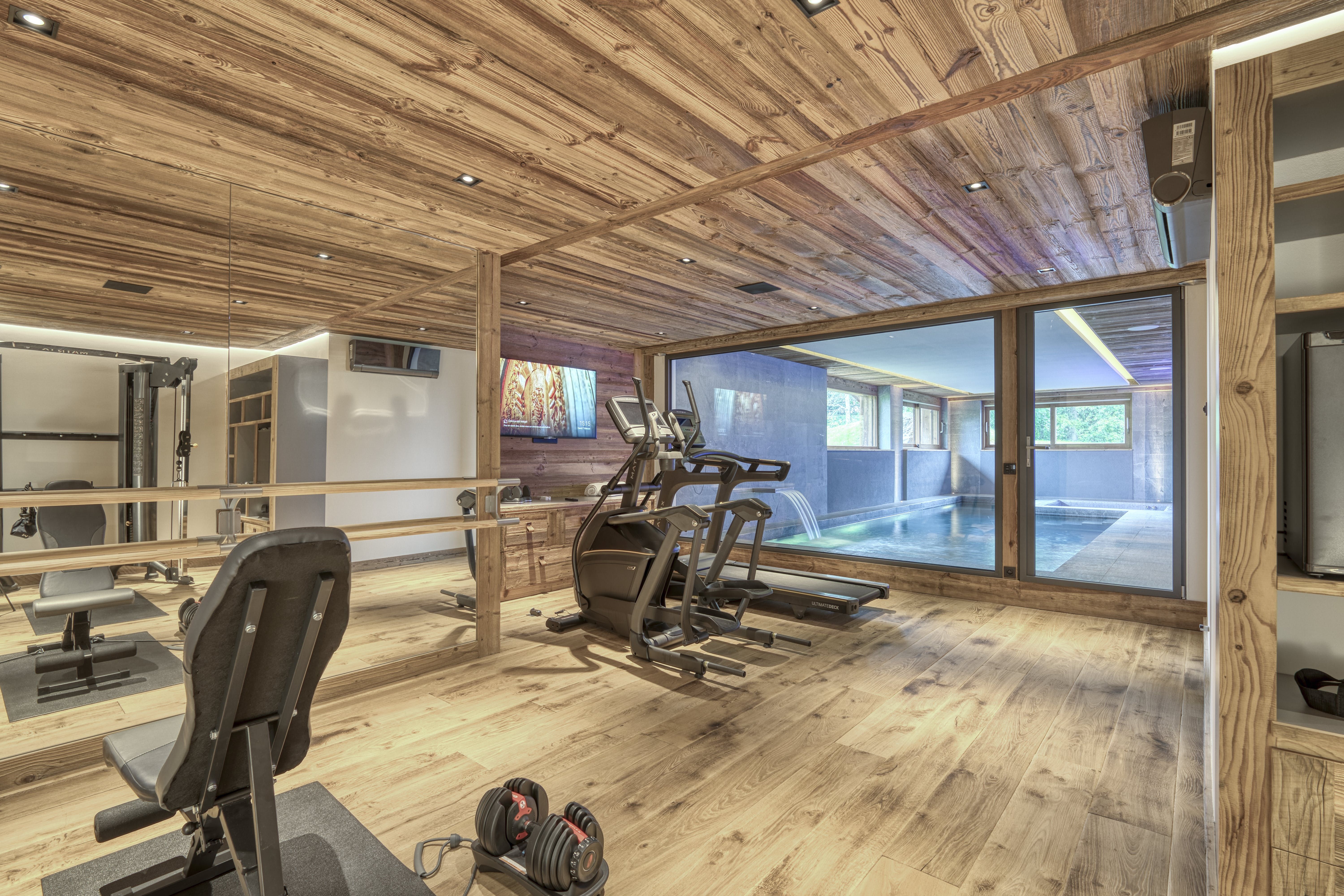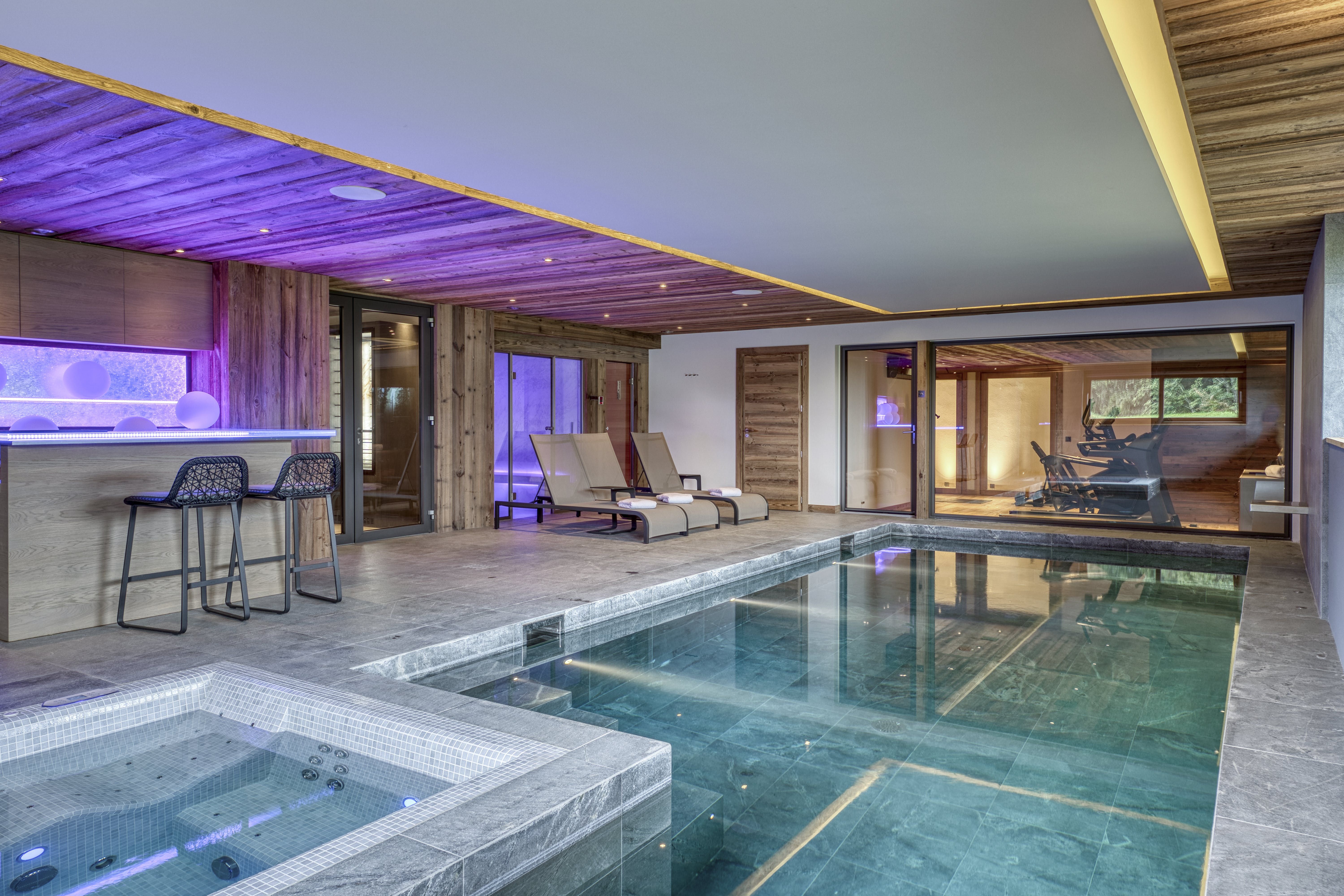 Spend the morning on the slopes, and return to the chalet for a cosy afternoon in front of the fire. Sip cocoa in the dreamy open-plan living space, beneath attractive wooden beams. When you’re ready to stretch your legs again, you might take the lift down to the wellness centre on the lower level. Swim laps in the heated swimming pool, or work out in the gym. Soothe your aching muscles by soaking in the Jacuzzi, and then move into the sauna or steam room. You can even arrange for a massage to take your relaxation to the next level. When you’re all blissed out, head back upstairs for a sumptuous dinner prepared by a private chef.