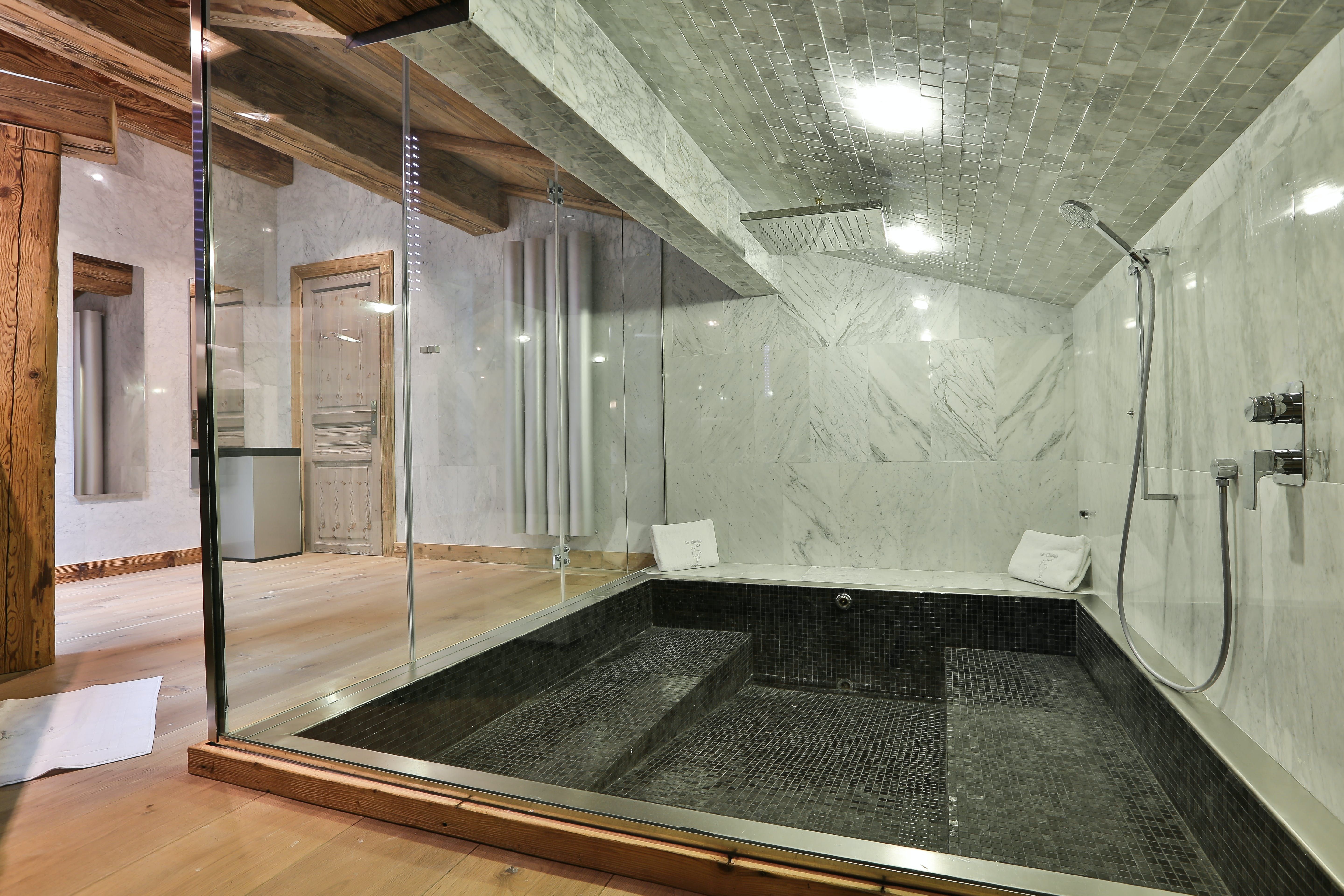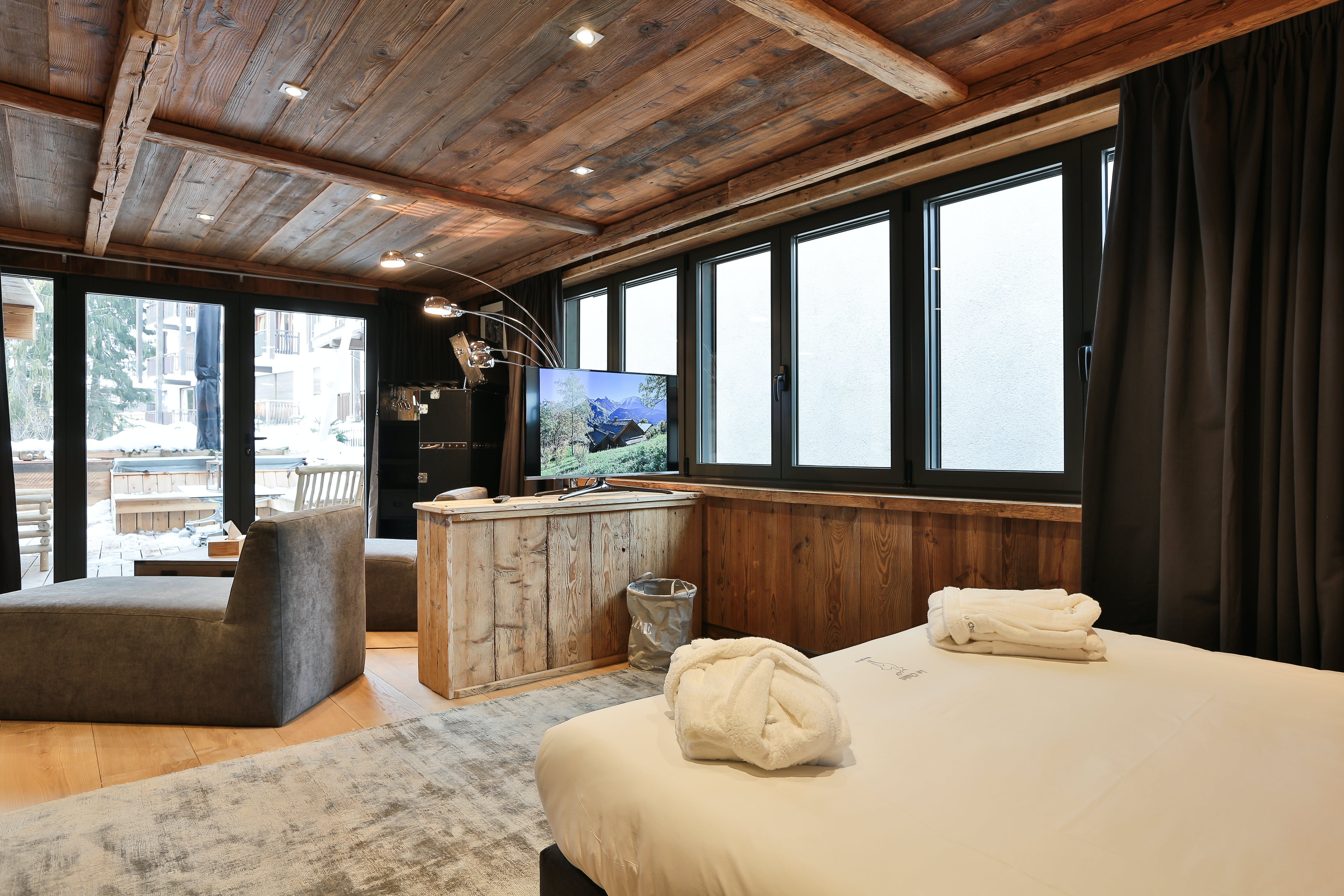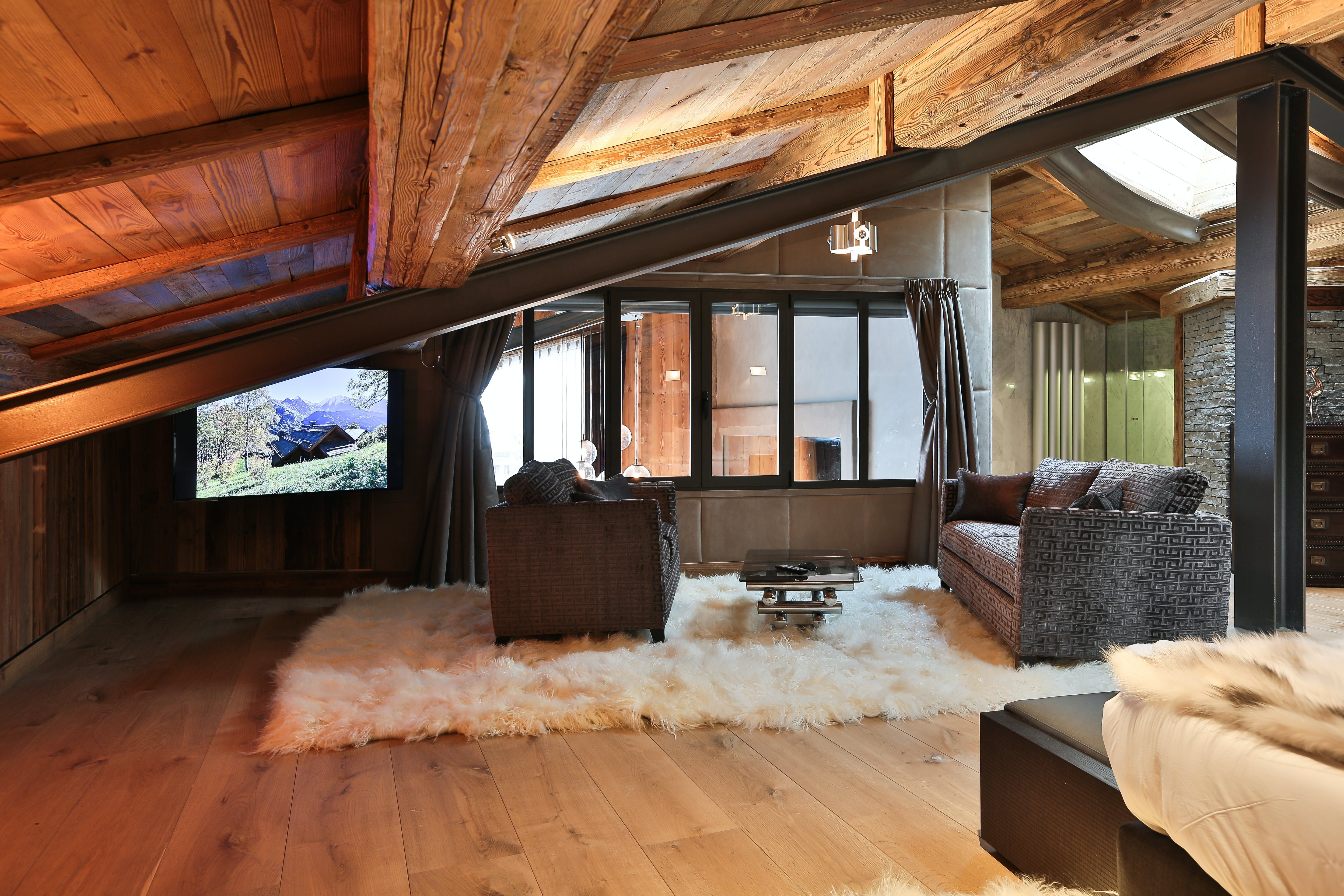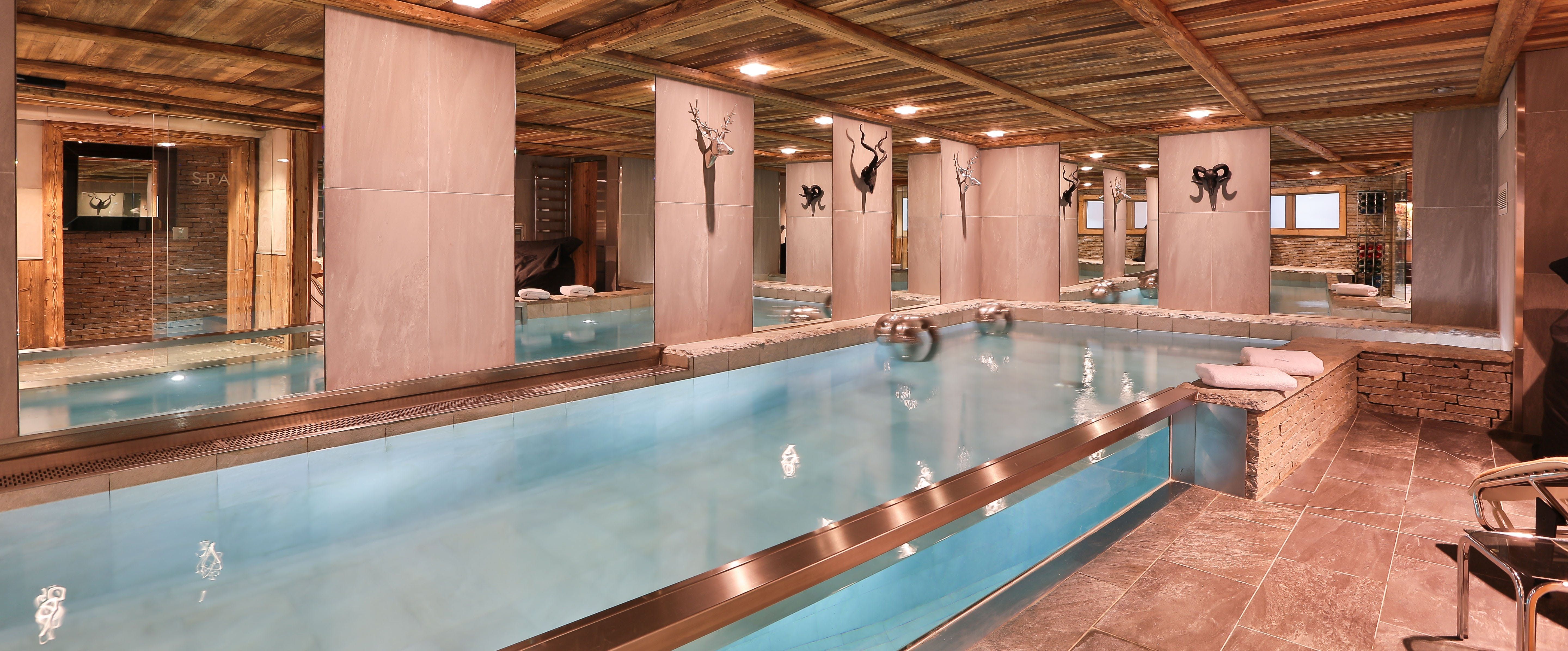 While there are aspects you'd expect to see in mountainside accommodation – plenty of wood, faux fur and roaring fires – there are a few others that will come as a pleasant surprise. Take the ground floor, for instance. Here you'll find a large swimming pool with a wave system, plus an adjoining fitness room. If that sounds a little too taxing, guests have the option of taking a seat in the two-person sauna or reclining in the outdoor Jacuzzi instead.