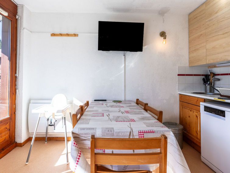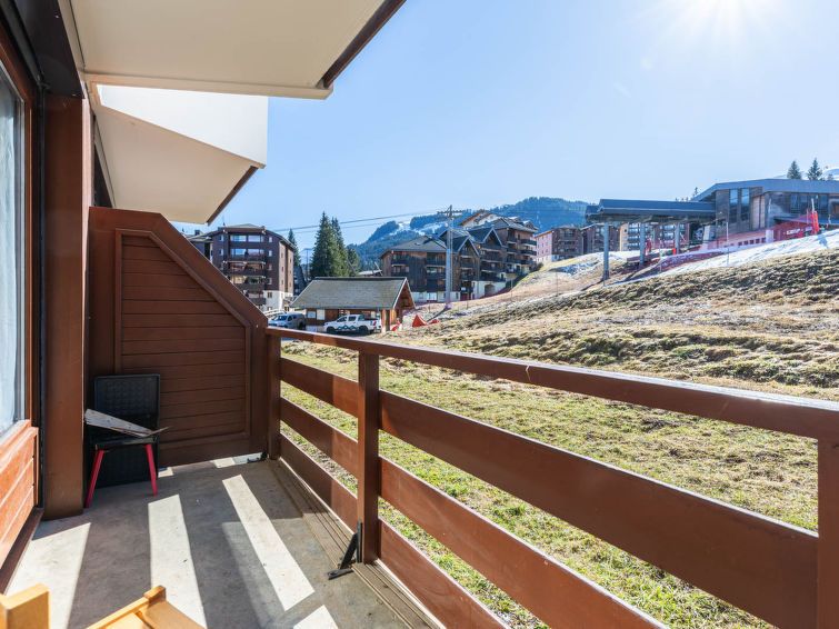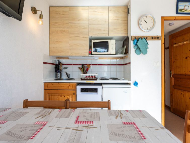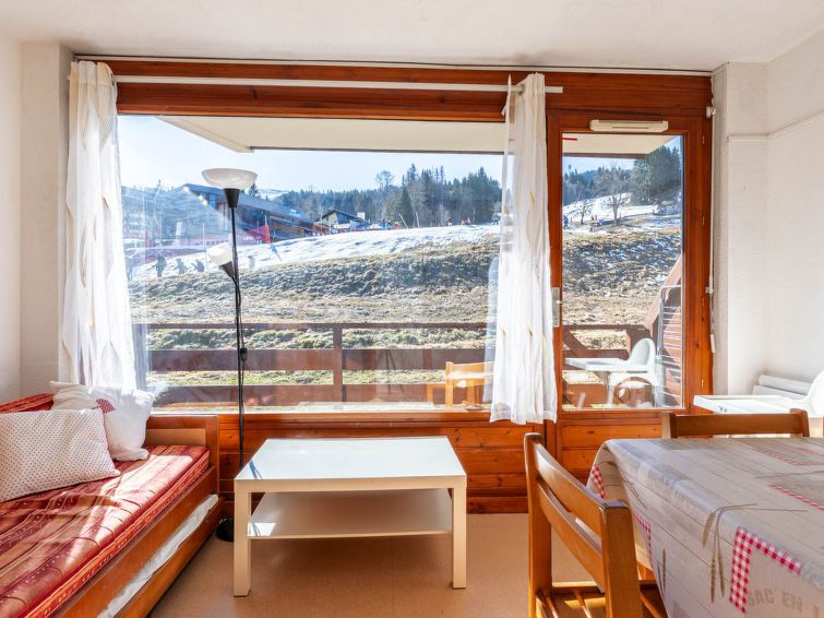 "Les Eterlous", 2-room apartment 25 m2, on the ground floor. Object suitable for 5 adults. Living room with 2 sofabeds and 1 x 2 bunk beds. 1 room with 1 double bed. Open kitchen (4 hot plates, dishwasher, toaster, kettle, microwave, electric coffee machine). Bath/WC. Balcony. View of the ski run.