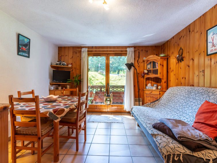 "Oursons 4", 2-room apartment 32 m2 on 1st floor. Object suitable for 6 adults. 1 room with 1 double bed and TV. Living room with 1 sofabed and 1 x 2 bunk beds, 1 pull-out bed. Kitchen (4 hot plates, oven, dishwasher, toaster, kettle, microwave, freezer, electric coffee machine). Bath/WC.