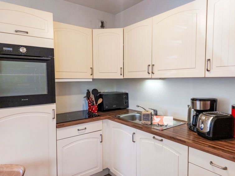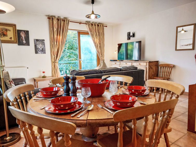 "Domaine de Crespin", 4-room apartment 69 m2, on the ground floor. Living/dining room with dining table and TV (flat screen). Exit to the balcony. 3 rooms, each room with 1 french bed (140 cm, length 190 cm). Open kitchen (oven, 4 ceramic glass hob hotplates, toaster, kettle, microwave, electric coffee machine).
