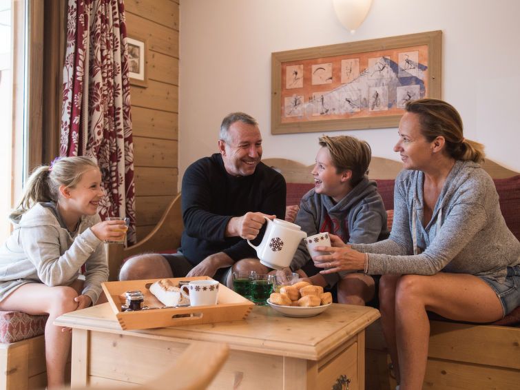 "Le Ferme du Val Claret", 2-room apartment 35 to 45 m2. Comfortable and tasteful furnishings: living/sleeping room with 1 sofabed, 1 pull-out bed, dining table and satellite TV. Exit to the balcony. 1 room with 2 beds. Open kitchen (oven, dishwasher, 4 ceramic glass hob hotplates, toaster, kettle, electric coffee machine, steamer).