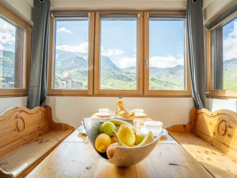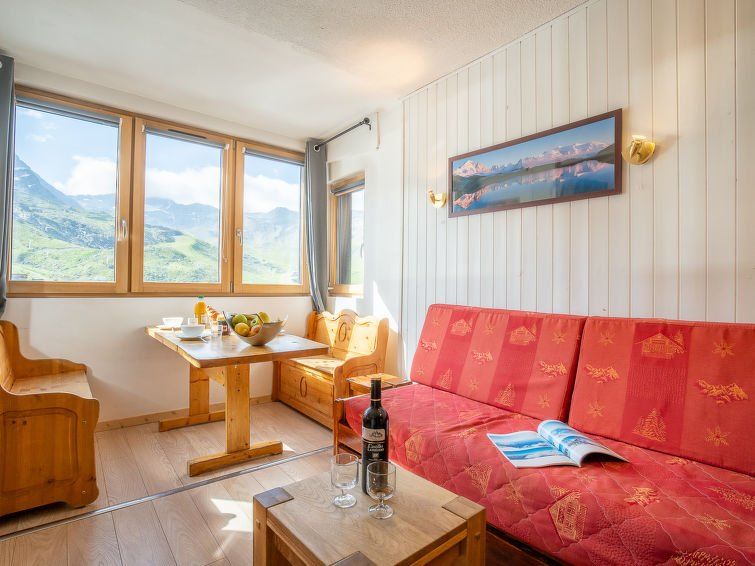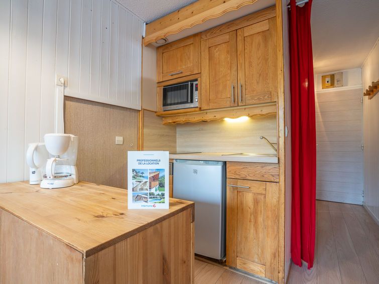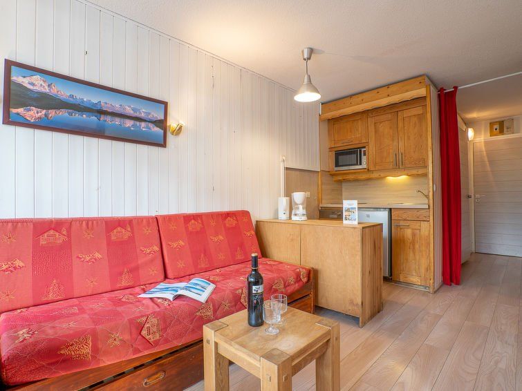 "Arcelle 505", 2-room apartment 26 m2 on 5th floor, south facing position. Very comfortable furnishings: living/dining room with TV and heating stove. 1 small room 6 m2 with sliding door with 1 double sofabed (1 x 140 cm, length 190 cm). Sleeping alcove with 1 x 2 bunk beds (80 cm, length 190 cm).