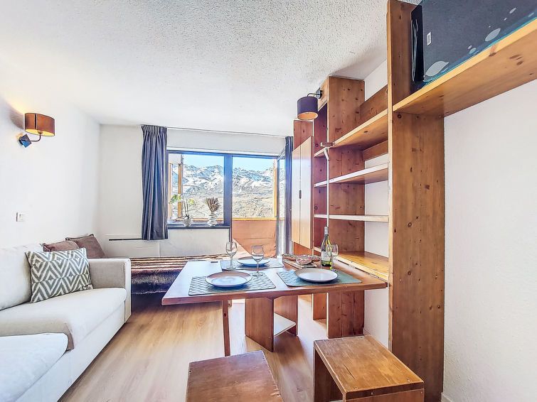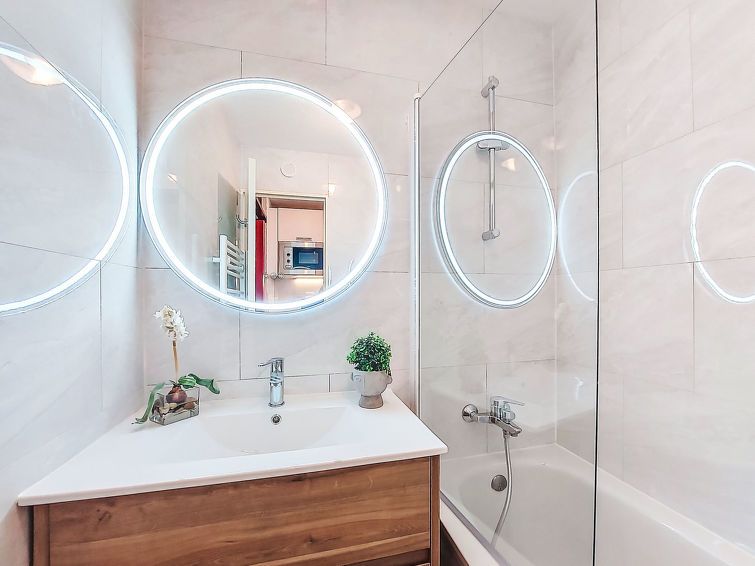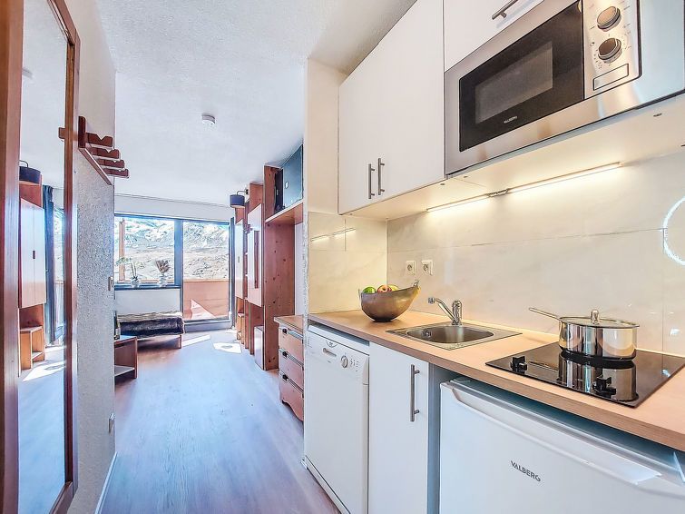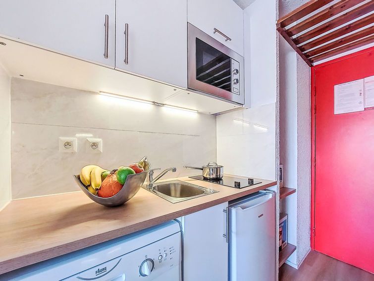 1-room studio north facing position. Fully renovated in 2025, practical and comfortable furnishings: living/dining room with 1 sofabed (80 cm, length 190 cm), 1 double sofabed (1 x 140 cm, length 190 cm), dining table, TV and electric heating. Entrance hall with kitchen corner. Kitchenette (oven, dishwasher, 2 induction hot plates, kettle, electric coffee machine, Capsules for coffee machine (Nespresso) extra, combination microwave).