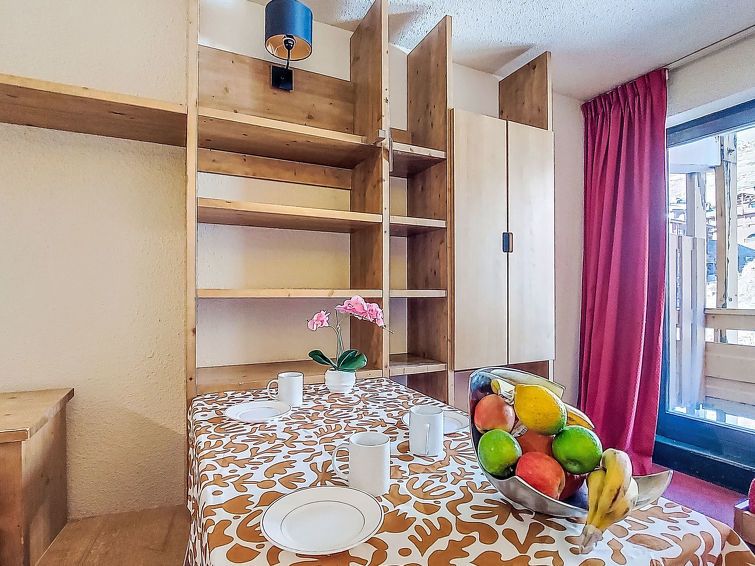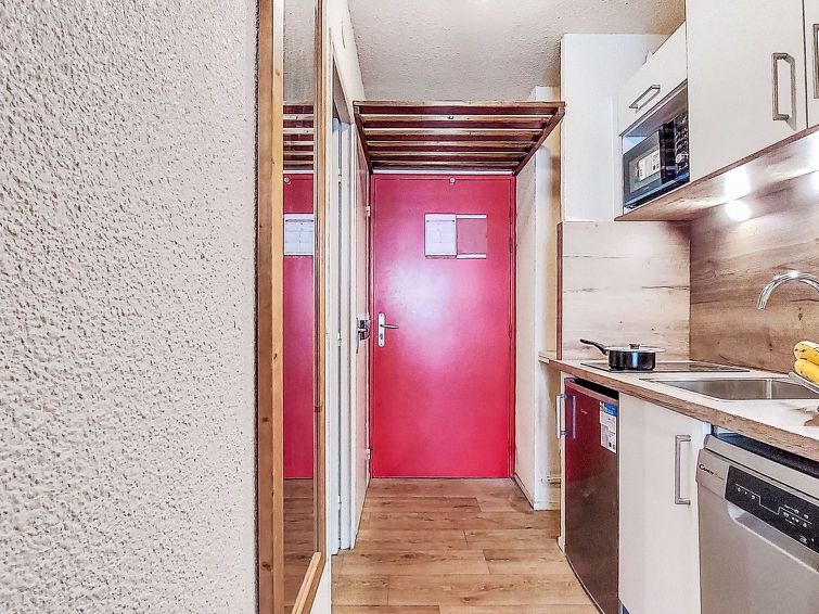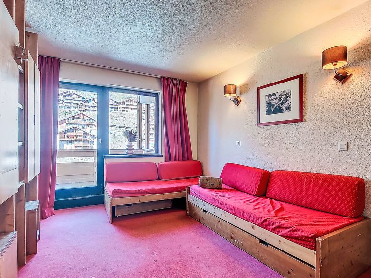 1-room studio 22 m2, north facing position. Practical furnishings: living/dining room with Dressing room with 1 bed (80 cm, length 190 cm), 1 pull-out bed (1 pers. 2 x 80 cm, length 190 cm), dining table and electric heating. Exit to the balcony, north facing position. Kitchenette (2 hot plates, dishwasher, toaster, kettle, microwave, electric coffee machine).