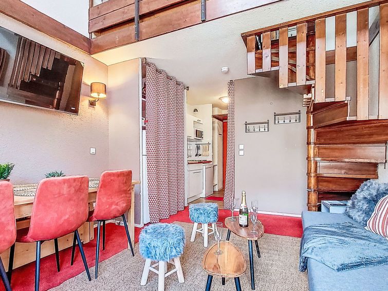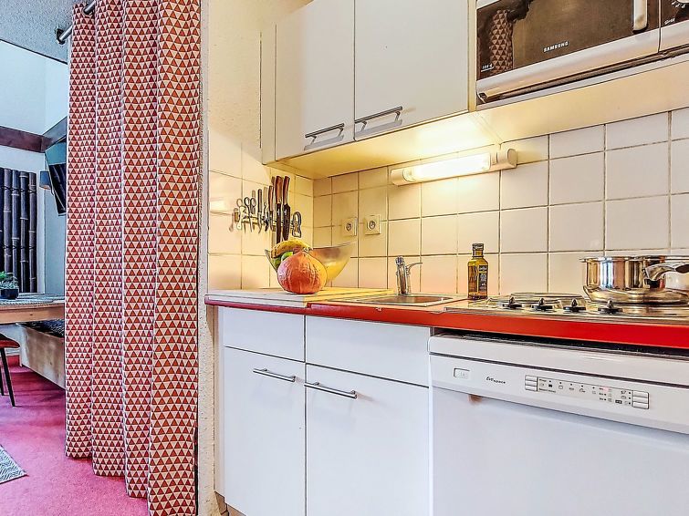 "Résidence Les Olympiades B 723", 3-room apartment on 7th floor, north facing position. Beautiful and cosy furnishings: living/dining room with 1 double sofabed (1 x 160 cm, length 200 cm), dining table and TV (flat screen), electric heating. Exit to the balcony, north facing position.