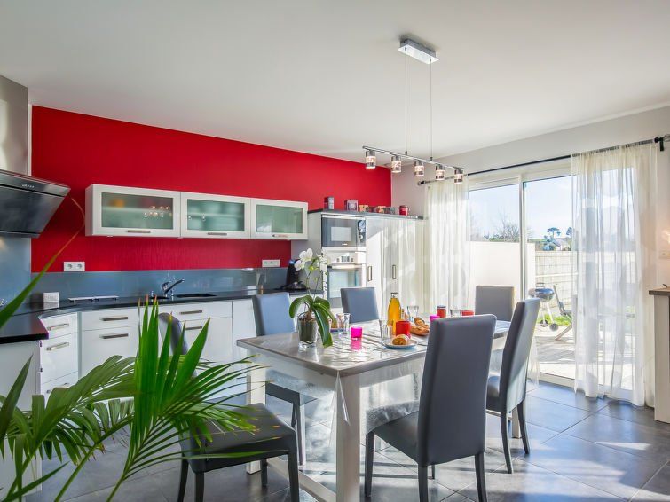 "La Goulvinoise", 3-room house 85 m2. Tasteful and cosy furnishings: living/dining room with dining table, TV and hi-fi system. Exit to the terrace. 1 room with 1 french bed and shower. Exit to the terrace. 1 room with 2 beds. Open kitchen (oven, dishwasher, 3 induction hot plates, toaster, kettle, microwave, electric coffee machine).