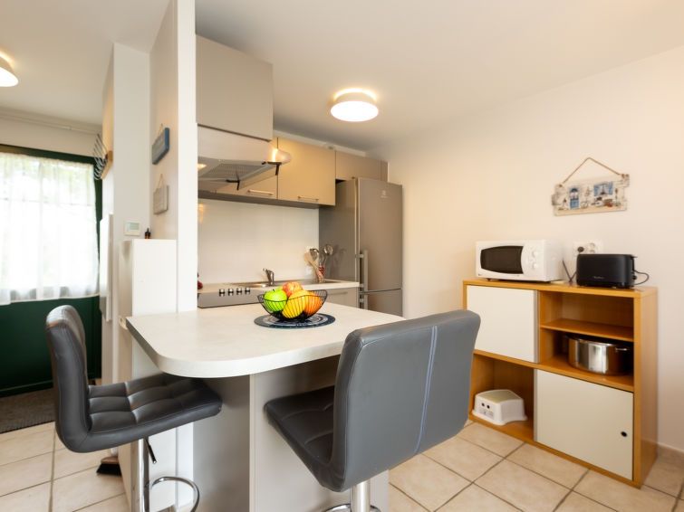 3-room terraced house 40 m2 on 2 levels. Comfortable and tasteful furnishings: large living/dining room with TV (flat screen). Exit to the garden. Open kitchen (oven, dishwasher, 4 induction hot plates, toaster, kettle, microwave, freezer, electric coffee machine, Capsules for coffee machine (Senseo) extra).